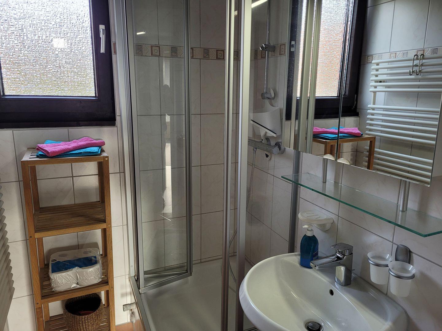 Das Badezimmer ist sowohl praktisch als auch komfortabel, ausgestattet mit einer Dusche und einem WC, und bietet zudem alle notwendigen Sanitäranlagen.