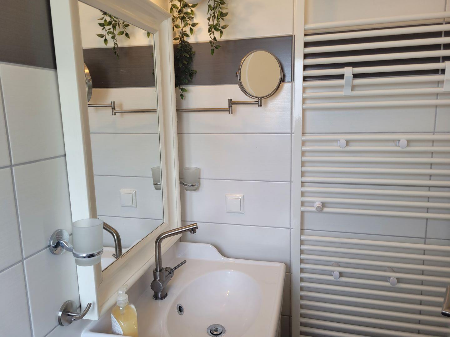 Das Badezimmer verfügt über eine Dusche, Waschbecken, WC, Haartrockner, Spiegel und zusätzlichen Kosmetikspiegel. Für Komfort sorgen zudem warmes Wasser, Rauchmelder und eine Gasheizung, die das Haus zuverlässig beheizt.
