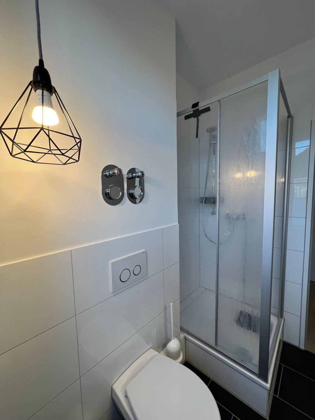 Das moderne Badezimmer mit Dusche hat eine Handtuchheizung und ausreichend Ablagemöglichkeiten für deine persönlichen Kosmetikprodukte. Handtücher, einen Haartrockner und Körperpflegeprodukte bekommst du von uns gestellt.