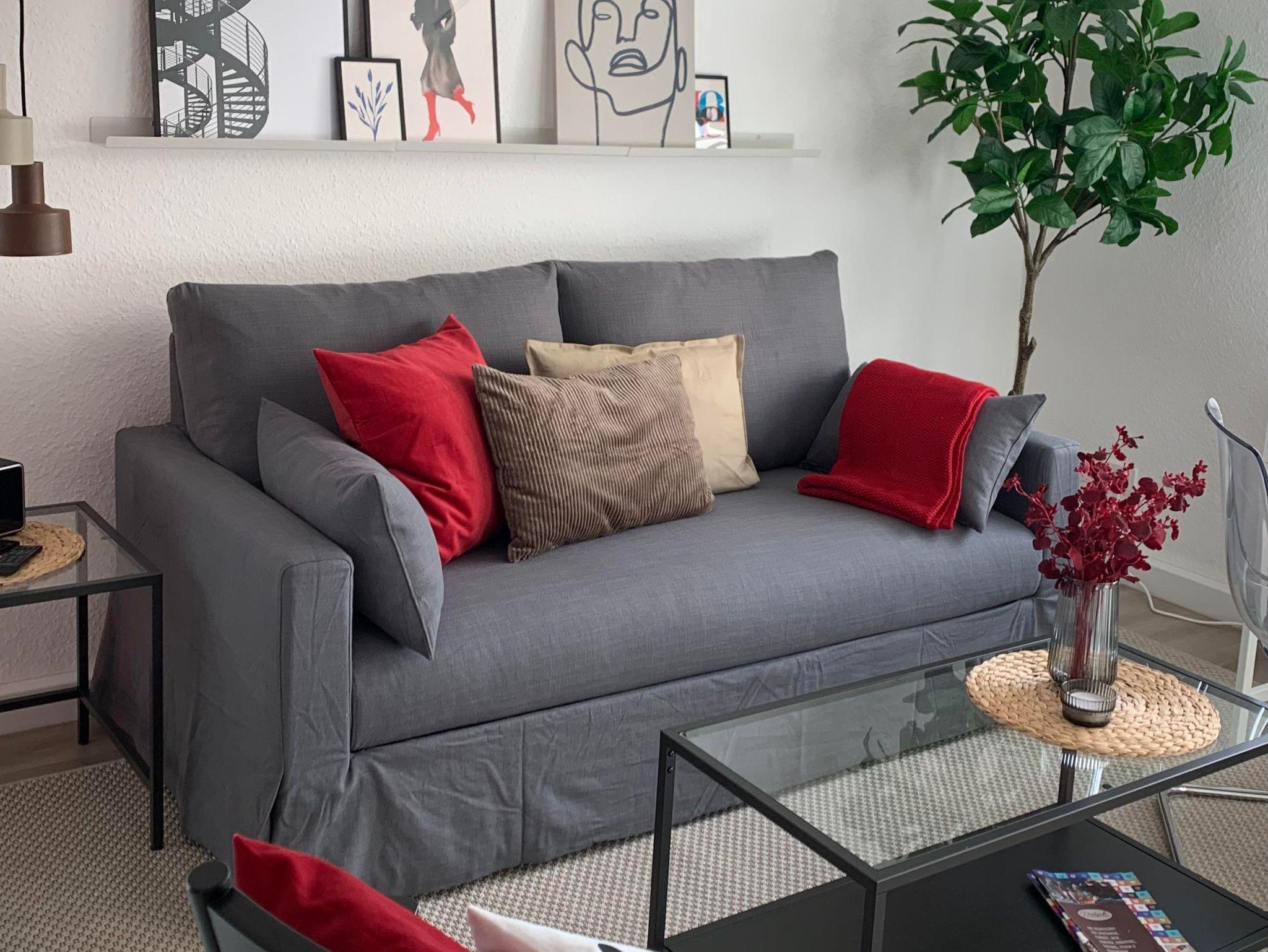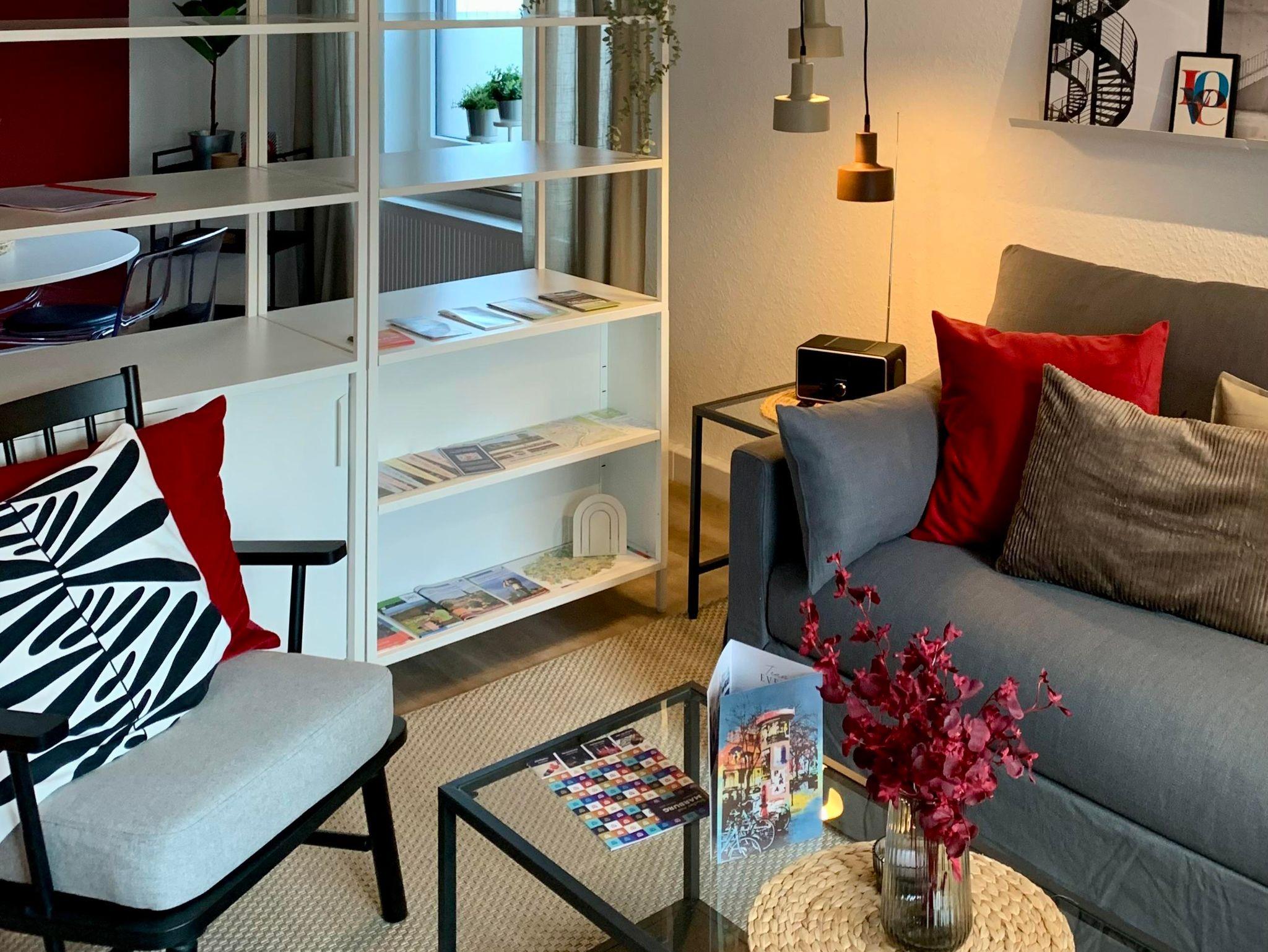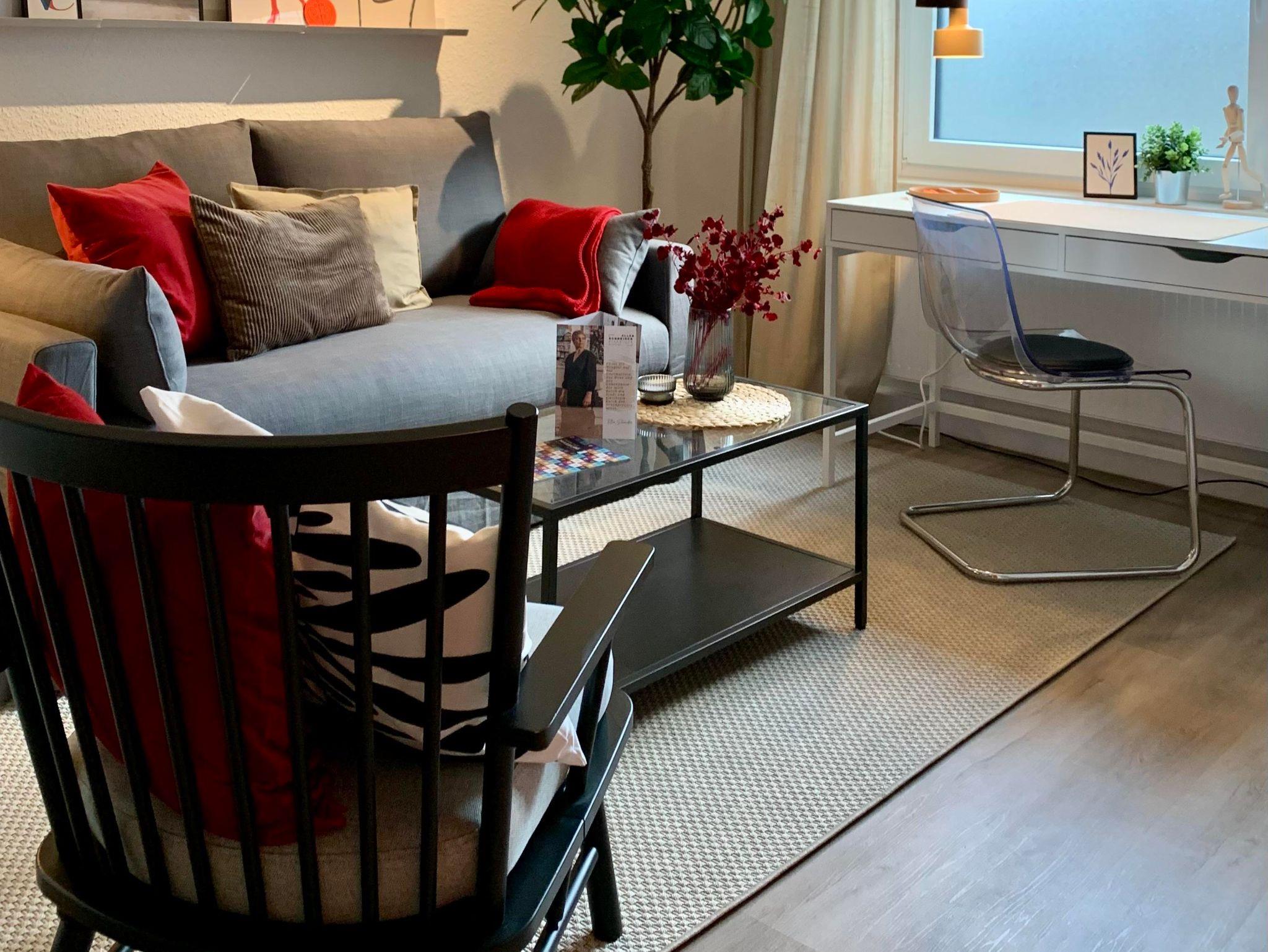 Treten Sie nun durch die Glastür in das das Herzstück der Wohnung ein: Auf 25 m2 erwartet Sie hier ein gemütlicher Wohnbereich mit Sofa, Smart-TV und DAB+-Soundsystem, sowie einem Schreibtisch, falls es doch noch Korrespondenz zu erledigen gibt. Mit unserem kostenlosen, stabilen Gäste-WLAN haben Sie jederzeit Zugriff aufs Internet.