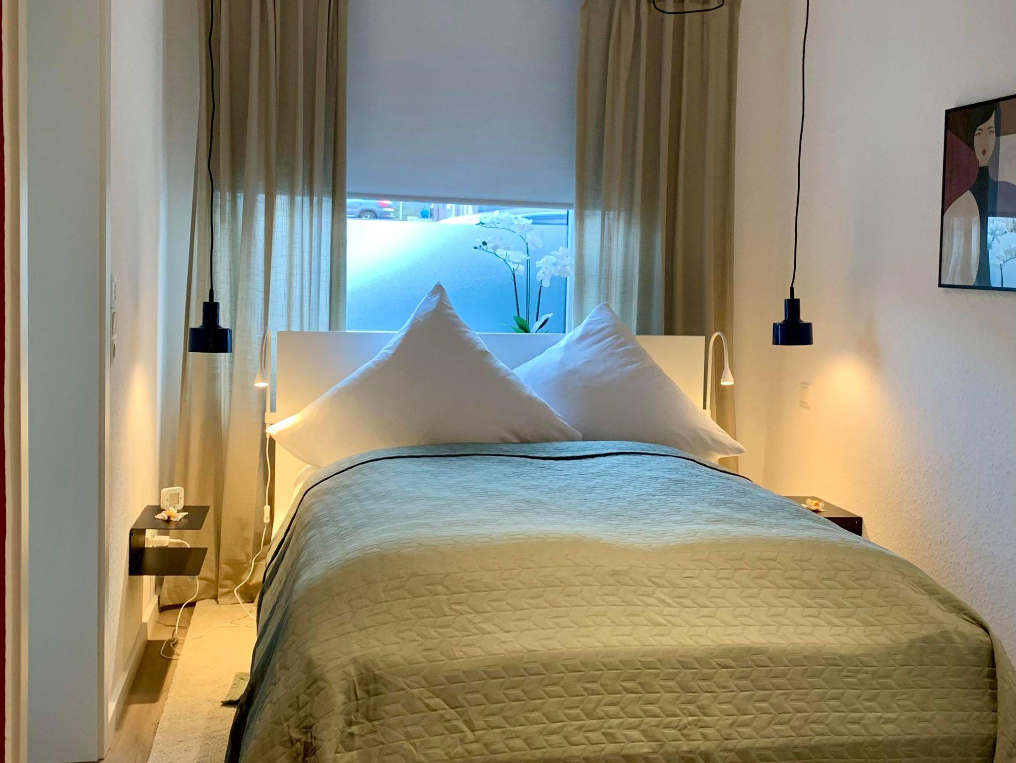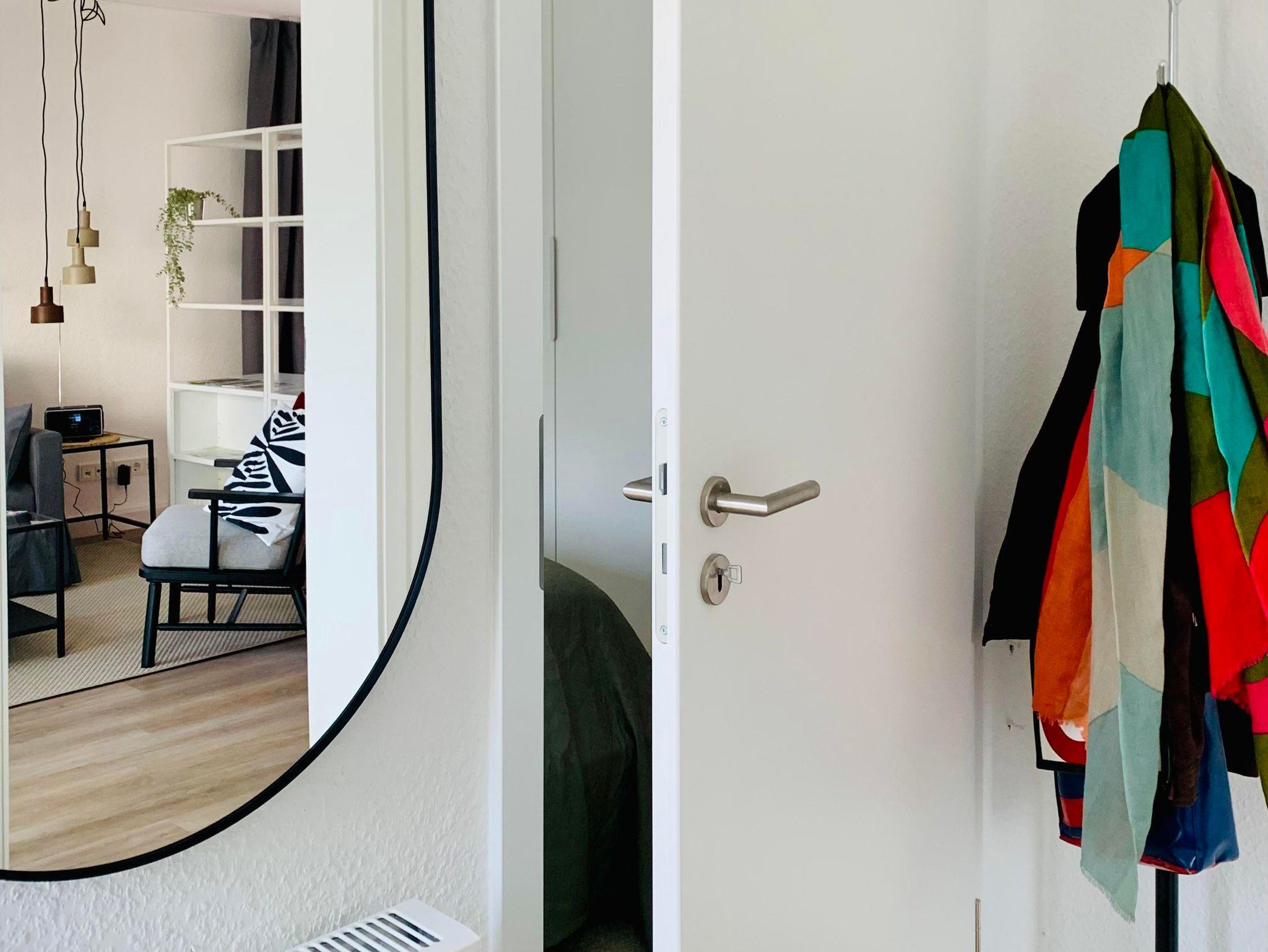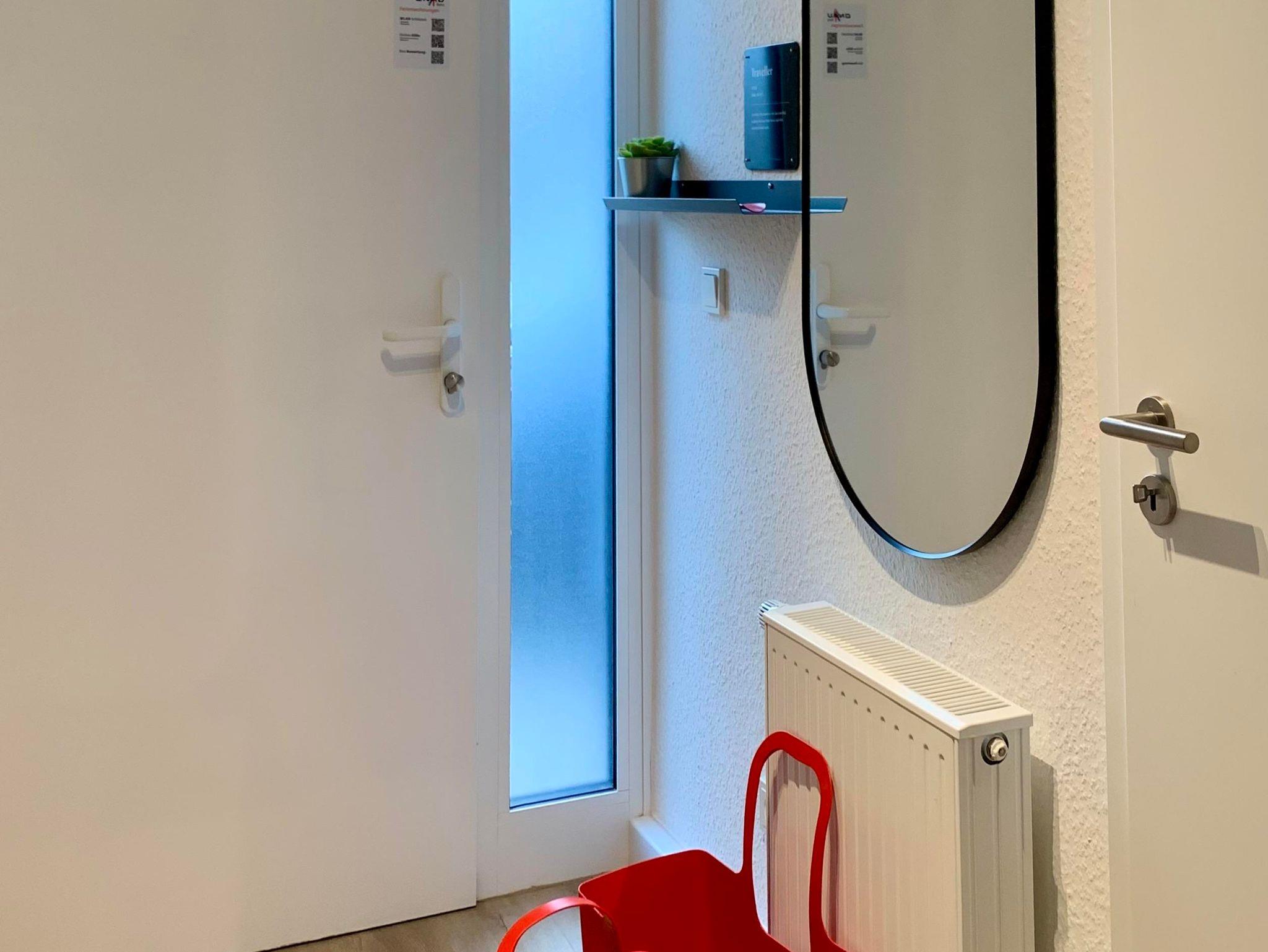 Alle Fenster der Ferienwohnung verfügen über eine Zwangsbelüftung und elektrische Rollläden. Zu Ihrer Sicherheit sind unsere Wohnungen mit Rauchmeldern und Feuerlöscher ausgestattet. Der zur Wohnung gehörende Parkplatz mit Wallbox ist direkt vor Ihrer Tür. Das Appartement befindet sich im ruhigen Hinterhaus, das nur über eine private Zufahrt zu erreichen ist. Von dort aus sind es nur wenige Meter bis zur Bahn-u. Bushaltestelle.