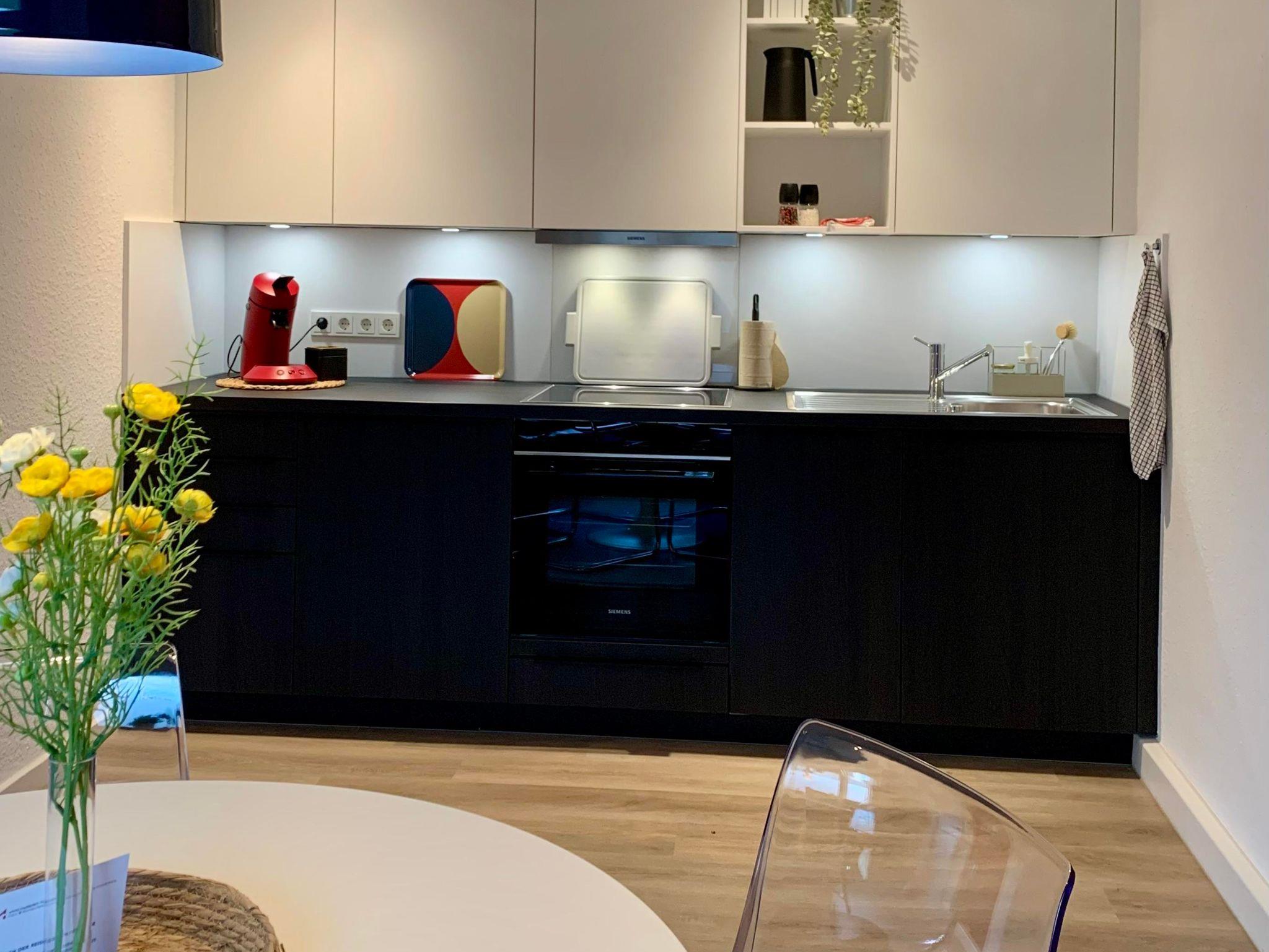 Wer zuhause genießen möchte, will natürlich auch kochen können. Daher haben wir eine komplette Küchenzeile für Sie eingerichtet. Hier finden auch ambitionierte Selbstversorger: innen ordentliche Voraussetzungen: Neben einem Induktionskochfeld mit Dunstabzug finden Sie einen modernen Backofen, eine Spülmaschine und selbstverständlich auch einen Kühlschrank mit ***-Gefrierfach.