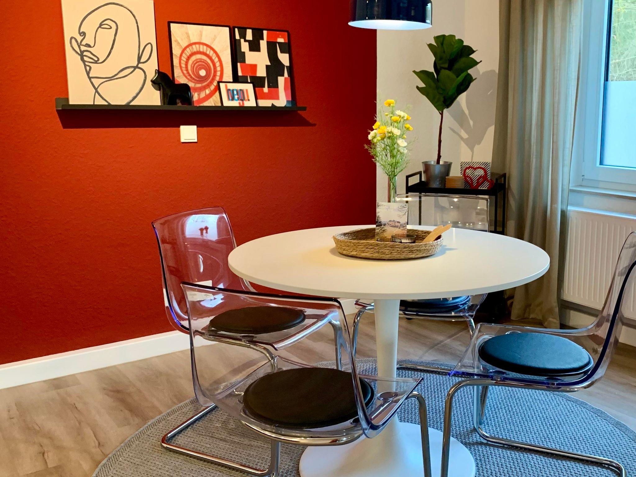 Vom Wohnbereich etwas separiert haben wir den Essbereich eingerichtet. Hier können Sie bequem zu zweit oder mit Ihrem Besuch tafeln. Geschirr, Gläser und Besteck sind ausreichend vorhanden.