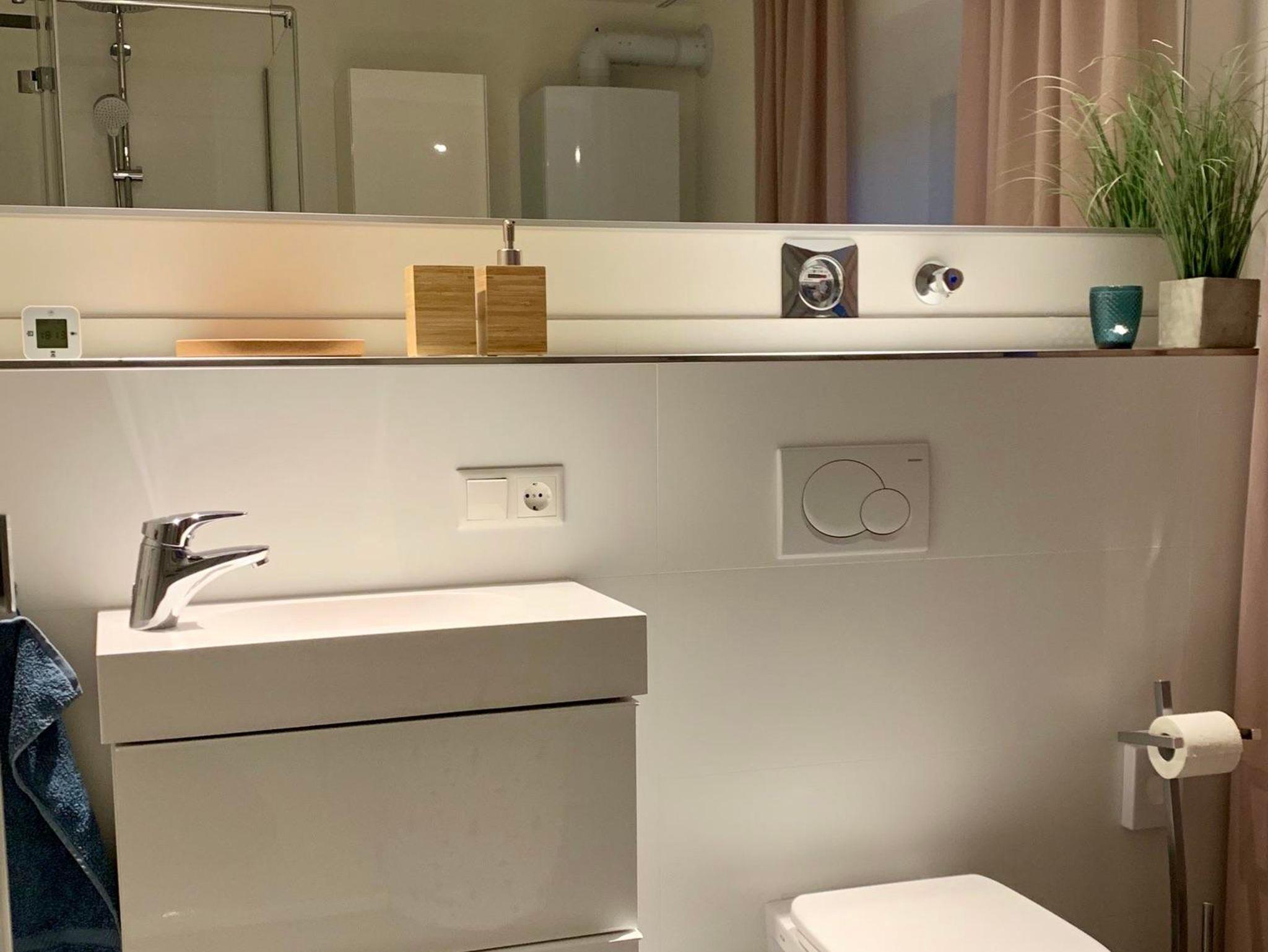 Das frisch renovierte Bad verfügt über ein Waschbecken, wandhängendes WC, Ganzglas-Dusche und Handtuchheizkörper. Im Schrank unter dem Waschbecken halten wir einen Haartrockner für Sie bereit. Handtücher in diversen Größen finden Sie im Badezimmerschrank.