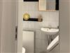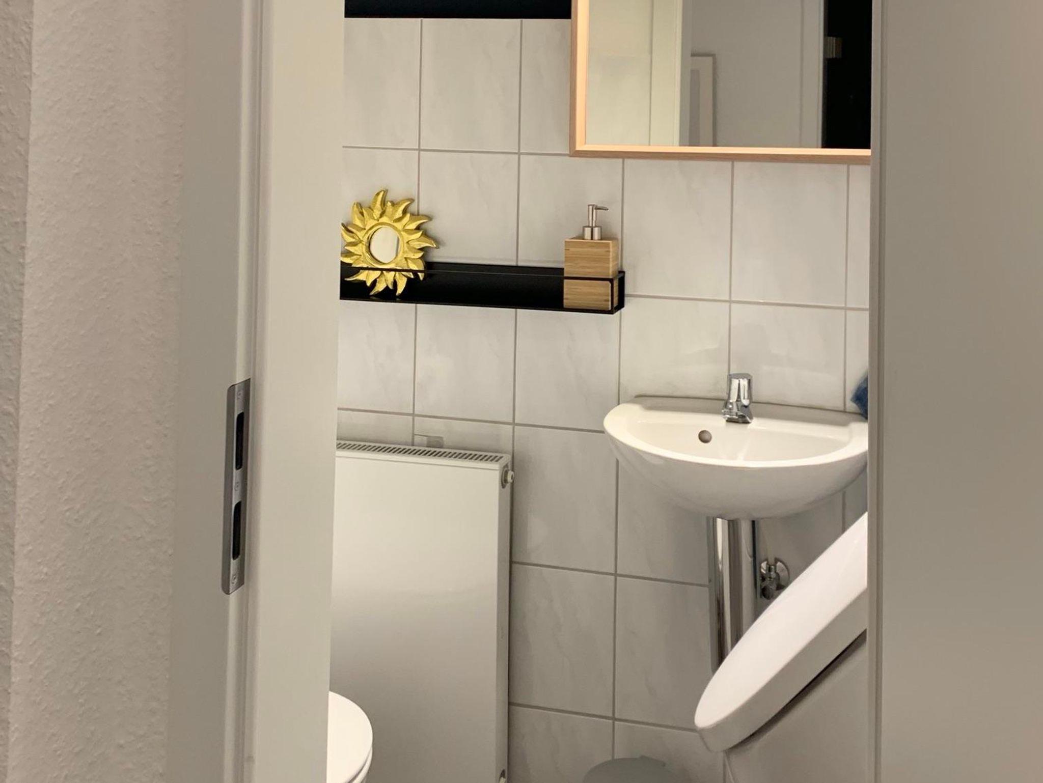 Ausgestattet mit Handwaschbecken, Toilette (wegen baulicher Voraussetzungen ist die Sitzhöhe etwas niedriger als allgemein üblich), Urinal.