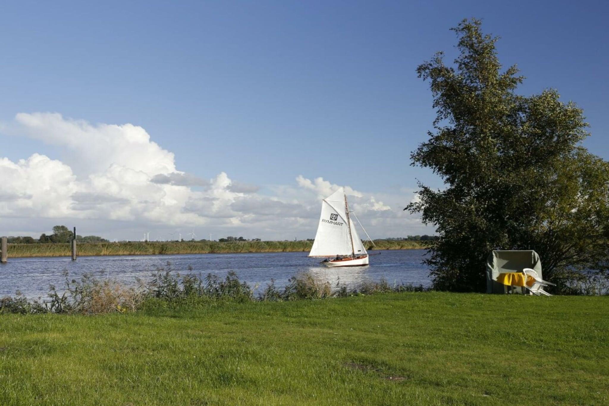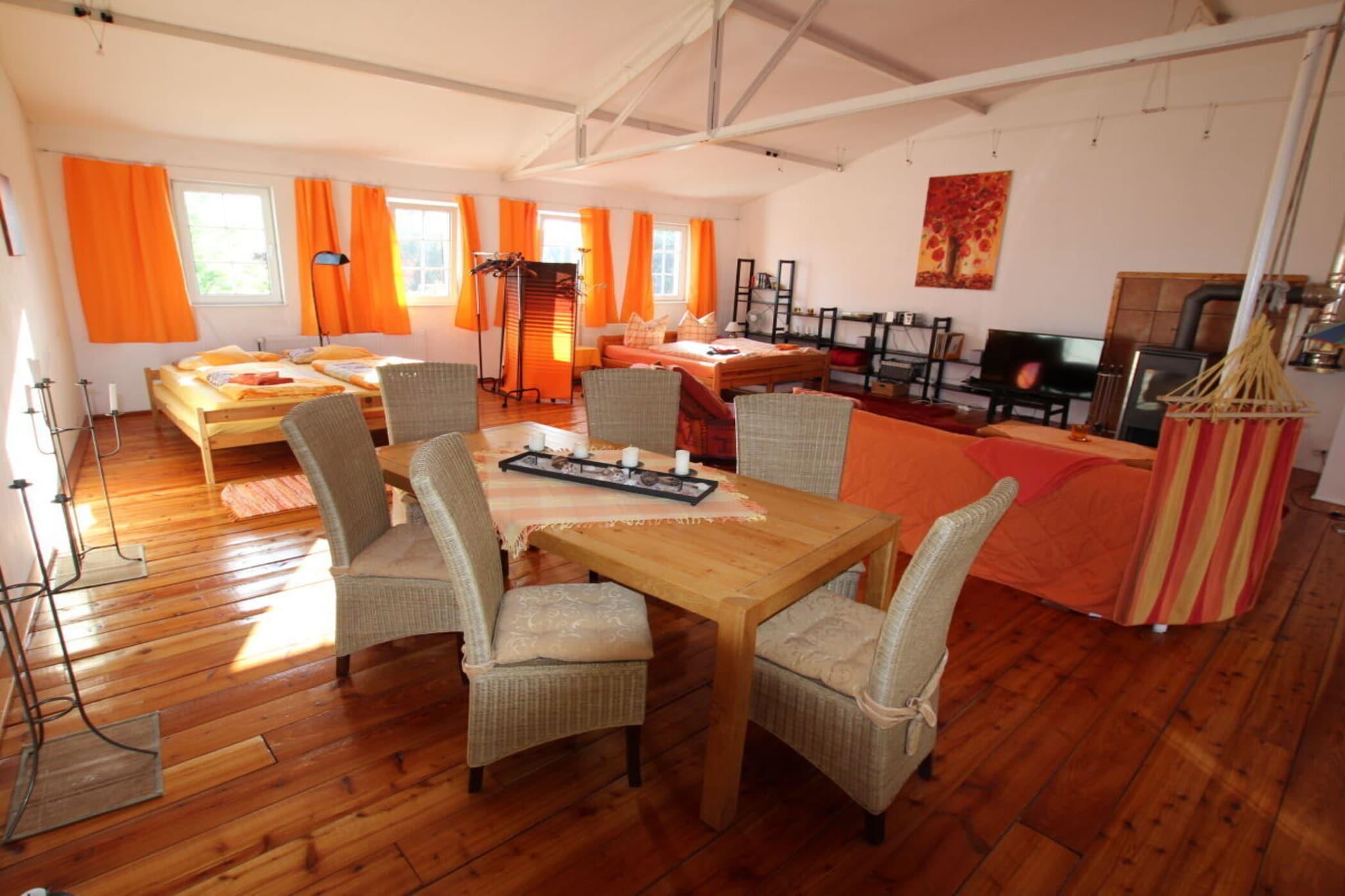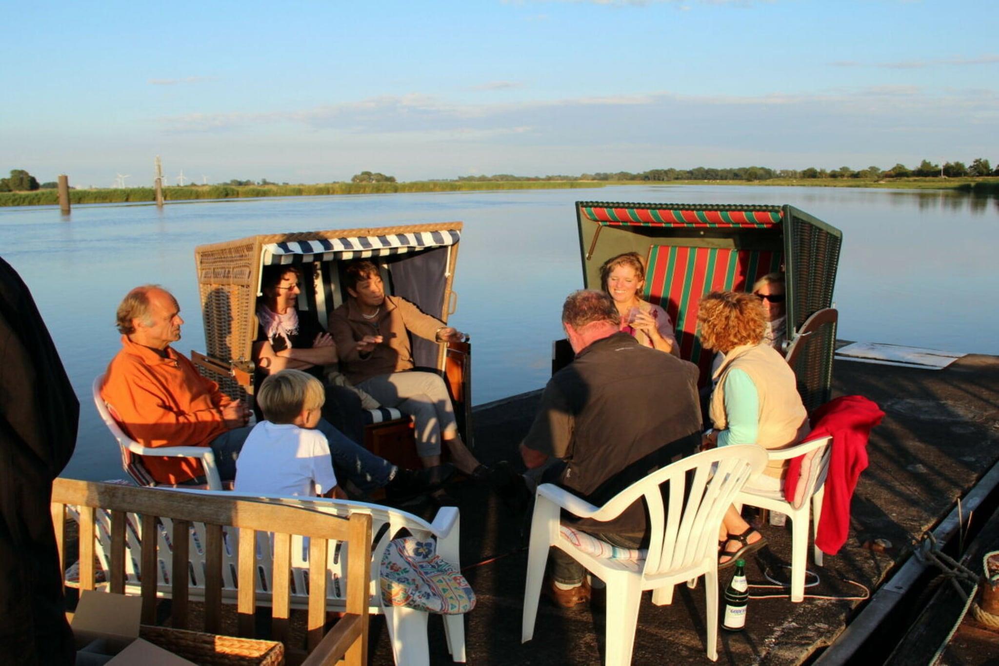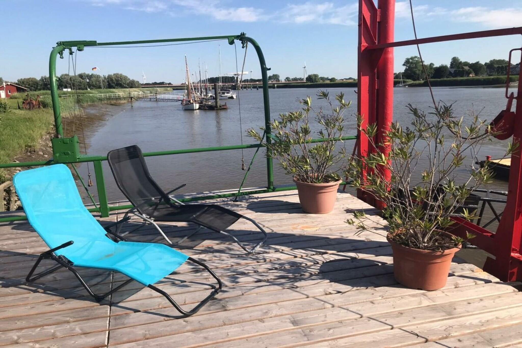 Das Atelier erstreckt sich über 165qm und ist zwei Ebenen unterteilt, Wintergarten mit großem Esstisch und Sofaecke mit Zugang zur Dachterrasse mit eigenem Strandkorb. Im unteren Bereich ist die in den Wohnbereich integrierte, offene Küche, eine gemütliche Sitzgruppe vor dem Kamin, ein weiterer großzügiger Esstisch und im hinteren Bereich sind zwei große 2x2 Meter Betten. Das Bad hat einen Doppelwaschtisch, eine Badewanne mit Dusche und WC. Vom Wintergarten aus und der Terrasse hat man einen großartigen Blick über die Flusslandschaft.