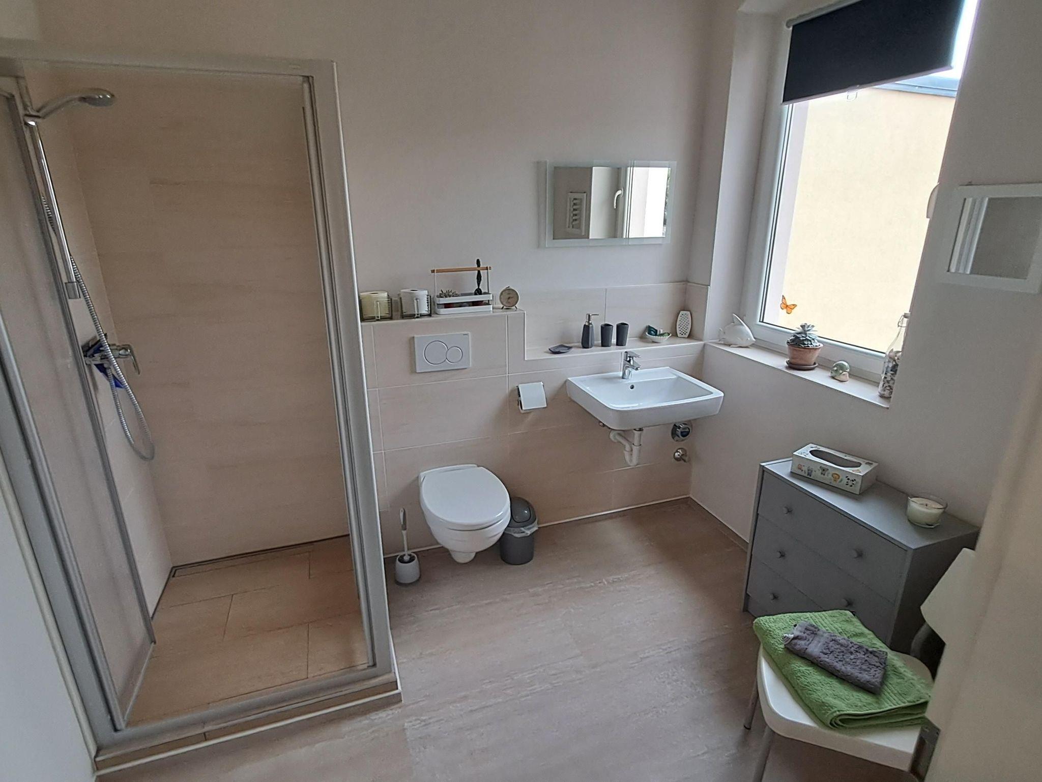 neues Bad mit Dusche und Leuchtspiegel