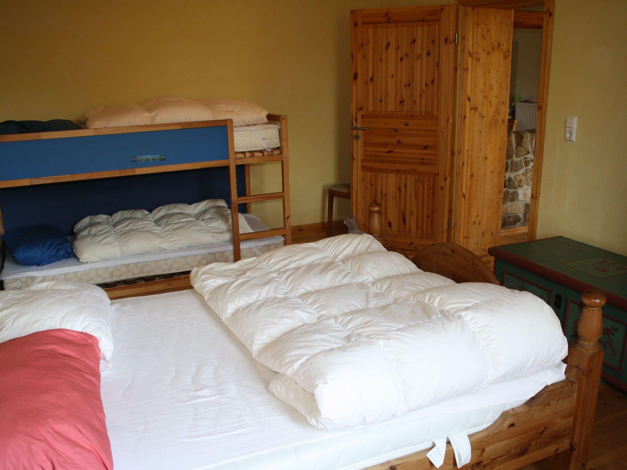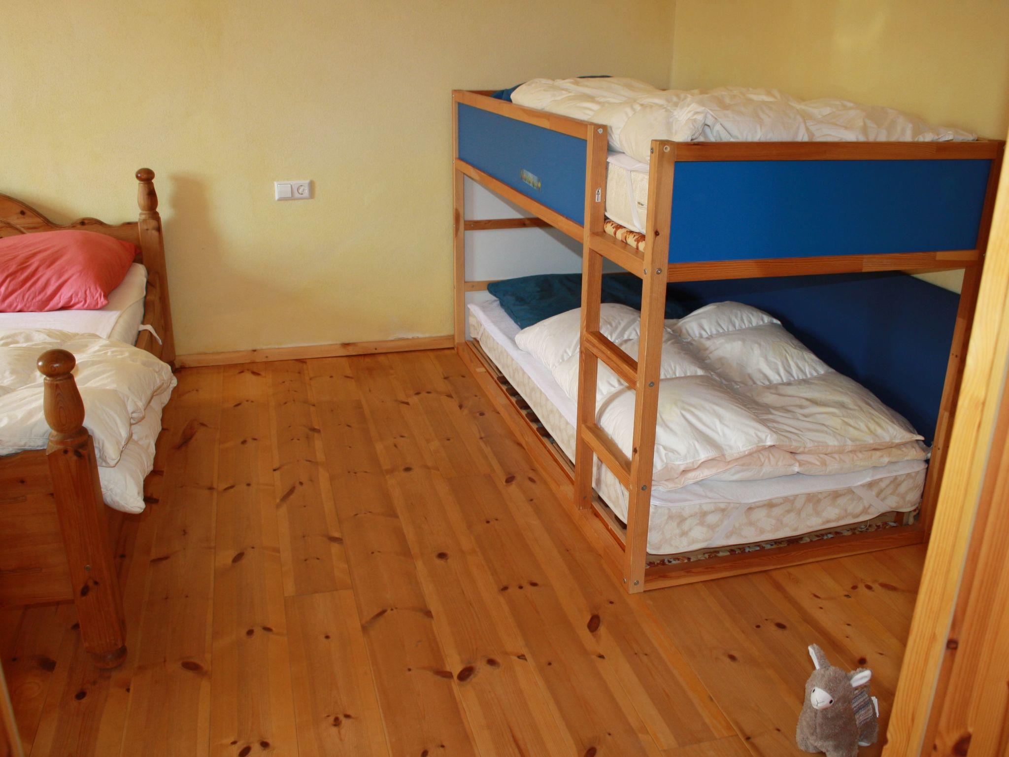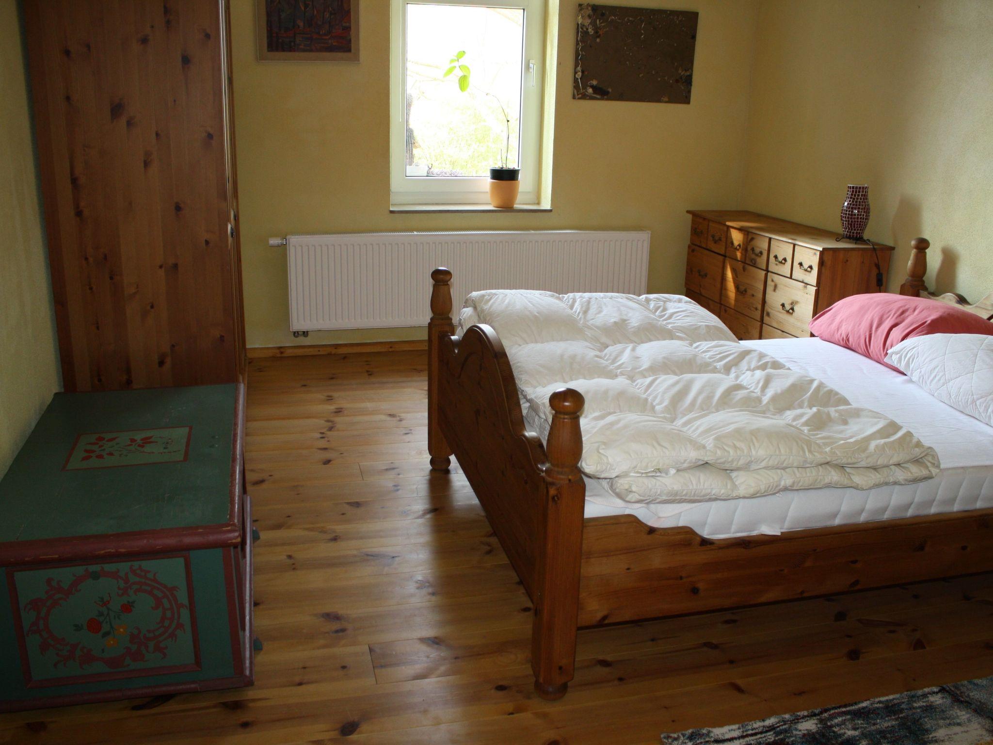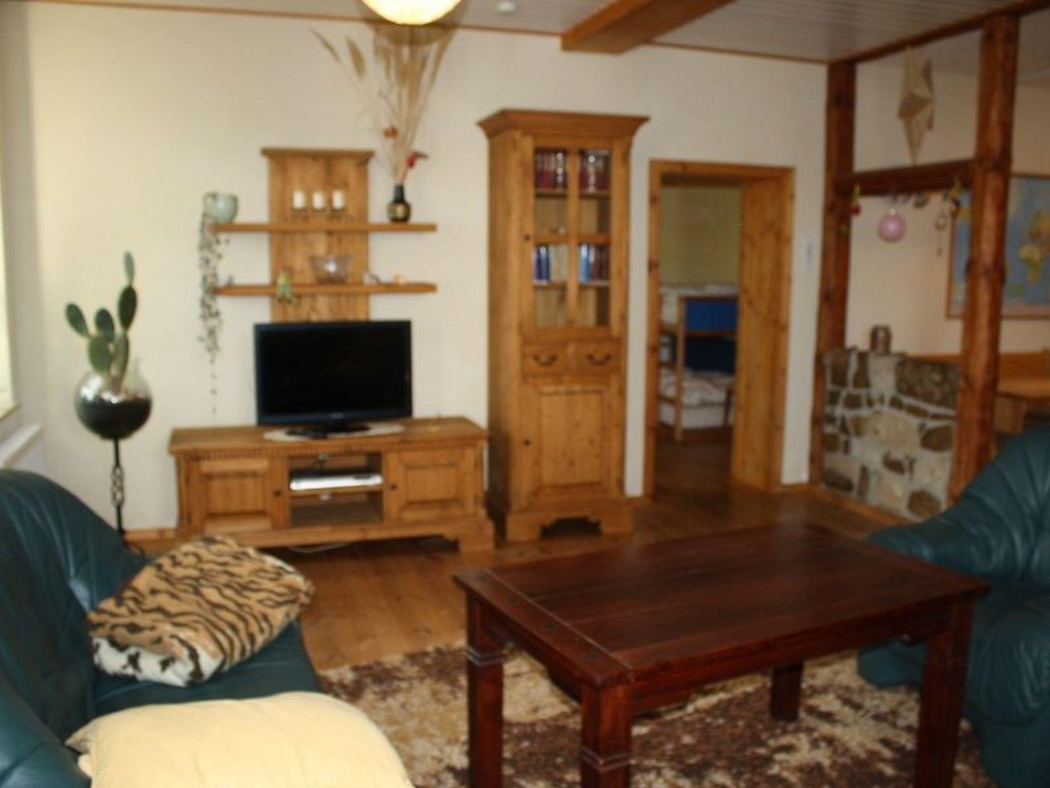 The holiday flat on the ground floor consists of a hallway (with wardrobe), kitchen-living room, bedroom and bathroom. The eat-in kitchen is equipped with a 4-burner cooker (ceramic hob, extractor bonnet), oven, toaster, kettle, coffee machine, fridge (incl. freezer compartment), pots, pans, spices, crockery and cutlery as well as a cosy dining area (table, 2 chairs, corner bench with 3 seats, radio with CD compartment). TV can be watched from 2 leather sofas and a leather armchair. The centrepiece of the large bedroom is a beautiful double wooden bed (1.4 m wide mattress), which sleeps 2 adults. There is also a bunk bed for 2 people (2.10 m long). Clothes can be stored in 1 large wardrobe (5 shelves, 1 long clothes rail with shelf above) and 1 chest of drawers. The cosy bathroom (renovated in 2025, with underfloor heating) includes a shower, bathtub (low entry), washbasin and toilet. The apartment is 65 square metres in size and centrally heated. It is most comfortable for 1-4 persons. It can accommodate a maximum of 5 adults.