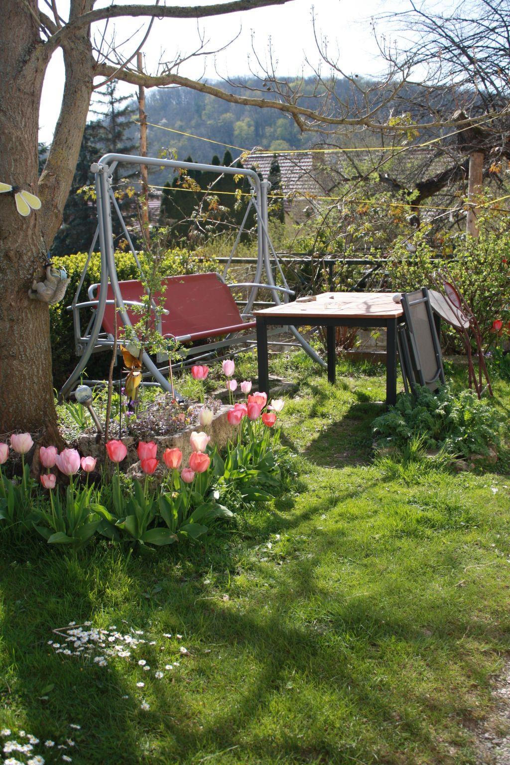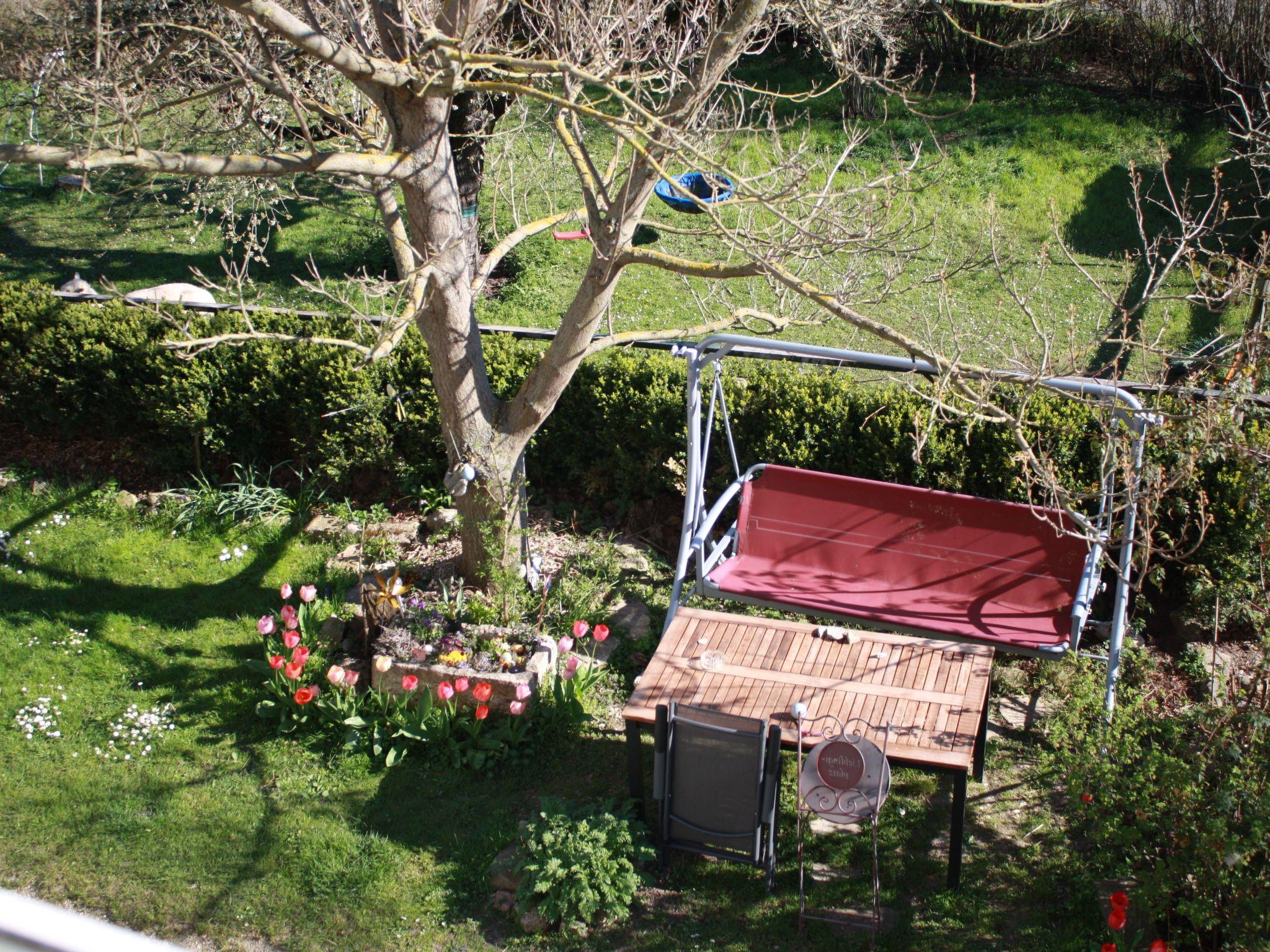 A terrace/green seating area with a swing under a bluebell tree (incl. table, 2 folding chairs, garden lounger if required) is available for the exclusive use of holiday guests. Tree swings and other children's toys may also be used. Barbecues are available on request. 1-2 guest parking spaces directly in front of the apartment. The property is completely fenced. In the garden you can meet our 4 cats, chickens, a tortoise and two alpacas.