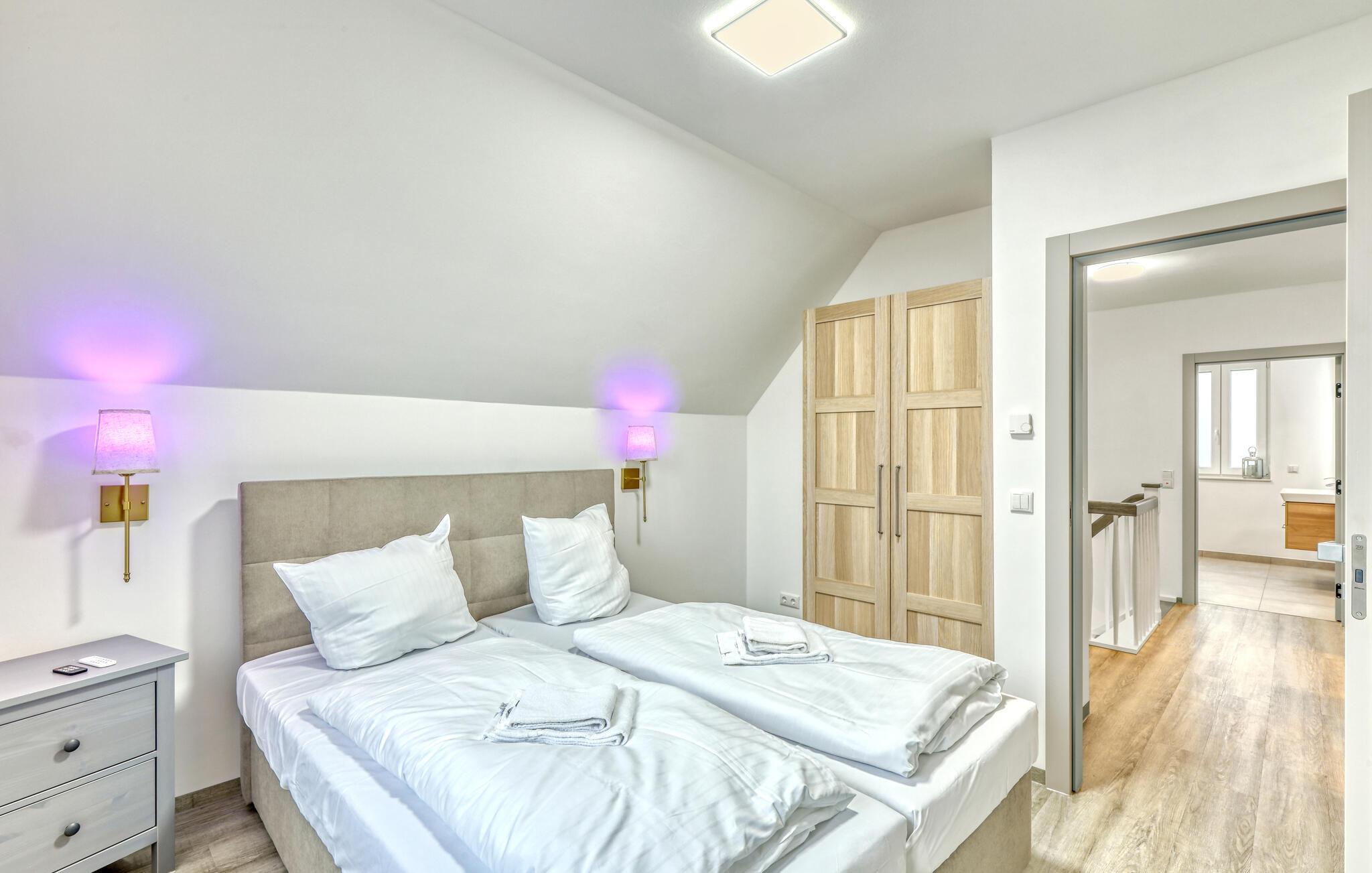 Forkæl jer selv med et afslappende ophold i dette hus, der kombinerer ro med stilfulde møbler. De lyse, luftige vægge og den diskrete indretning skaber en moderne og indbydende atmosfære. Nyd fælles måltider i den rummelige spisestue, mens I nyder udsigten over de vidtstrakte marker gennem gulv-til-loft-vinduerne. Tilbered jeres måltider i det eksklusive køkken, som tilbyder rigelig bordplads og ideelle forhold. Bagefter kan I slappe af i saunaen og nyde den beroligende varme efter en lang dag i den friske luft.