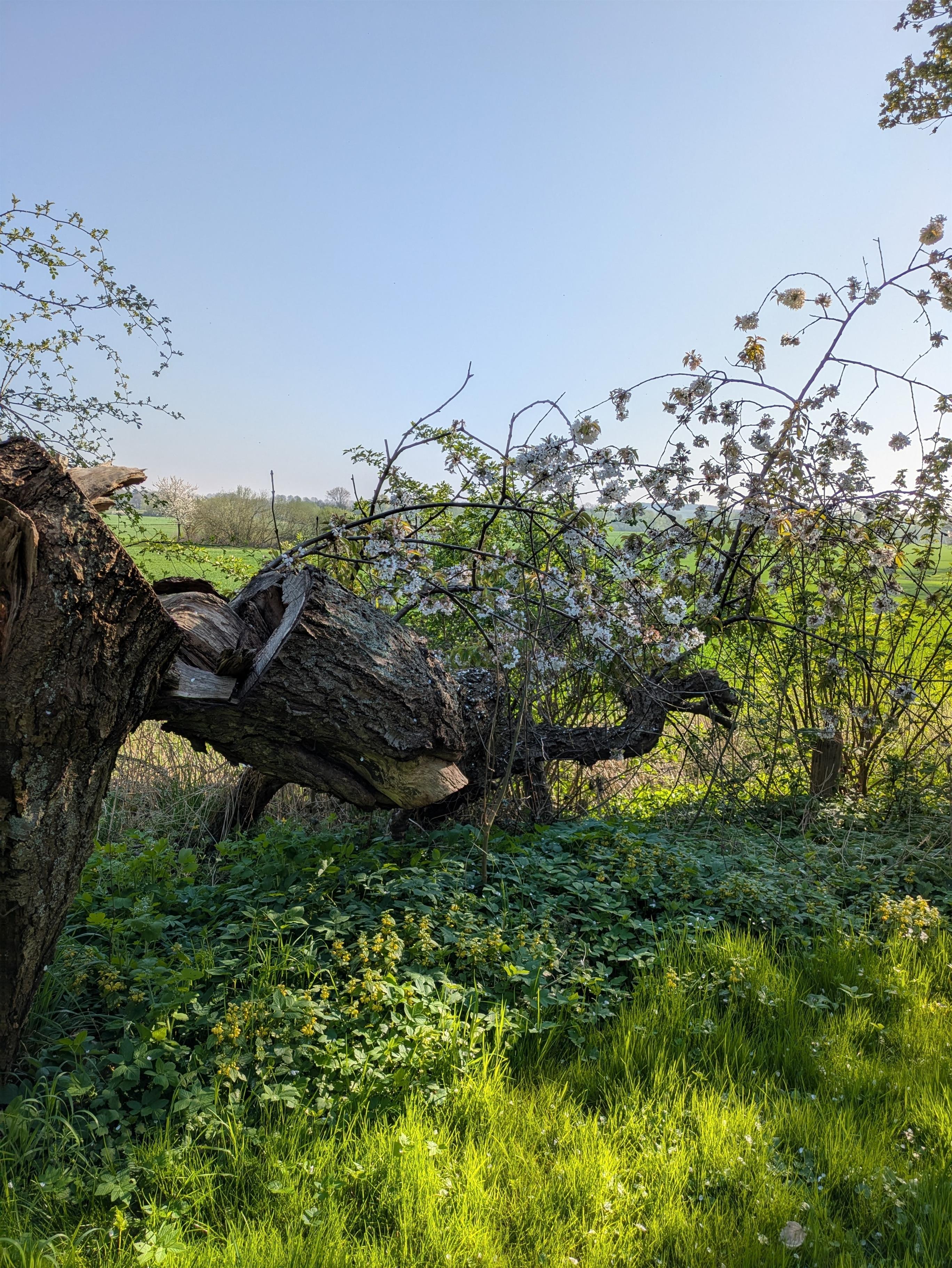Das Holz trägt Spuren: Sonne, Regen, Fußabdrücke, vielleicht den Abdruck einer Kaffeetasse. Es ist vom Leben gezeichnet – so wie der Mensch, der darauf sitzt. Direkt davor beginnt das Reich der Weite – ein anarchisches Durcheinander von Halmen, dem Weiher und Baumalleen, das keinen Plan braucht, um vollkommen zu sein.