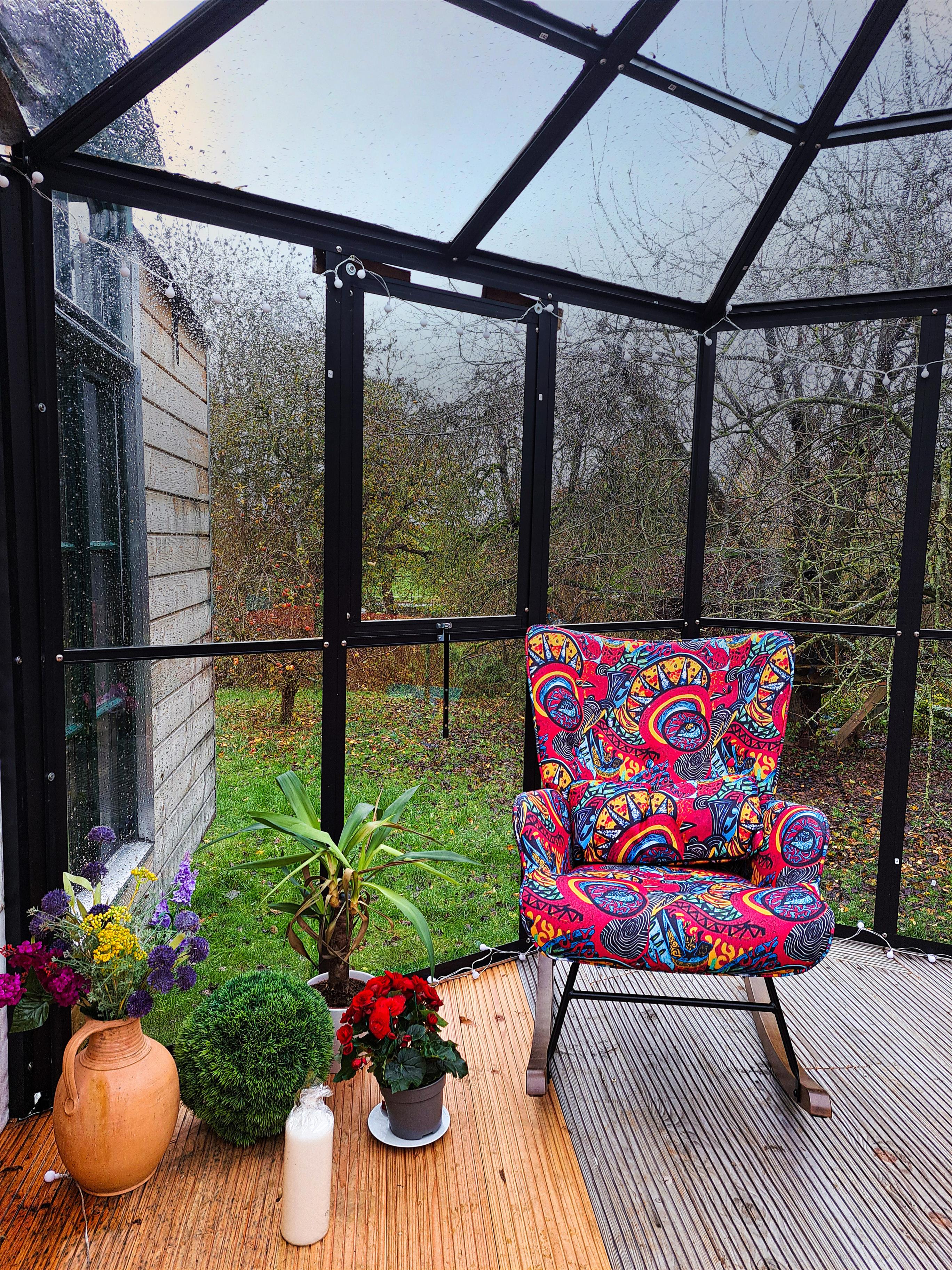 Für Frostbeulen und Wiesen - Voyeur / innen: Vor dem Eingang haben wir einen kalten Wintergarten hingestellt. Ja, er ist kalt, aber er ist der Puffer, damit euch die Kälte nicht direkt umhaut, wenn ihr die Tür aufmacht. Er ist euer Sky Room - Schutzraum und ein charmanter Platz, um das Frühstück bei wunderbarem Blick ins Grüne zu inszenieren - selbst wenn es draußen ungemütlich ist.