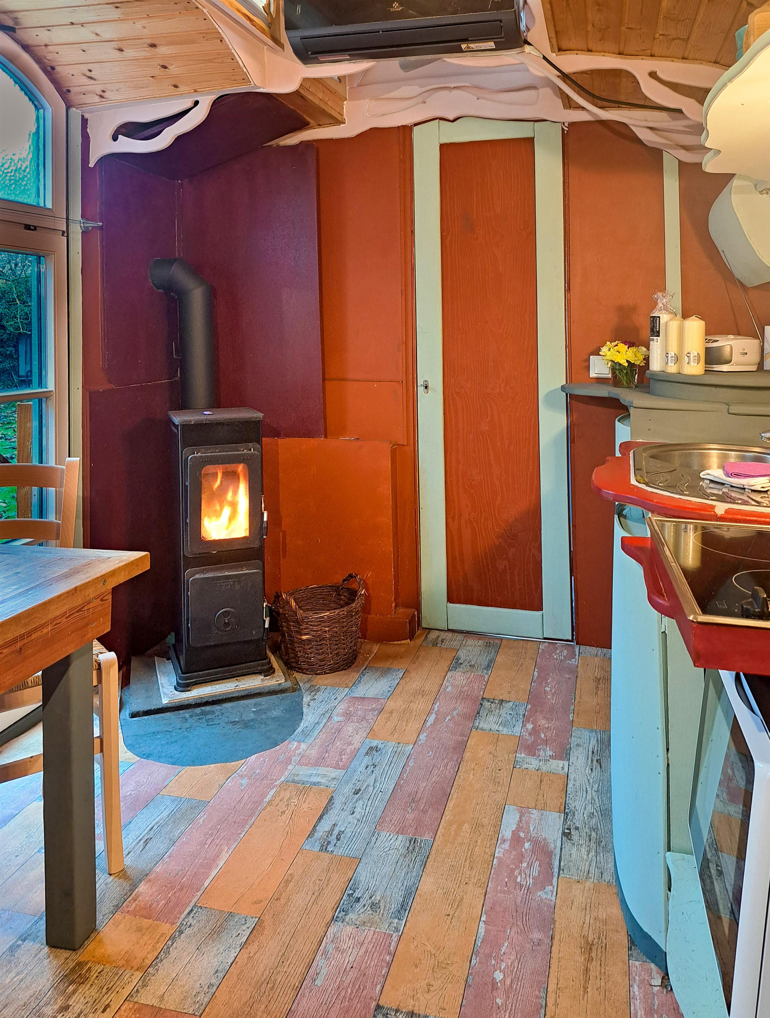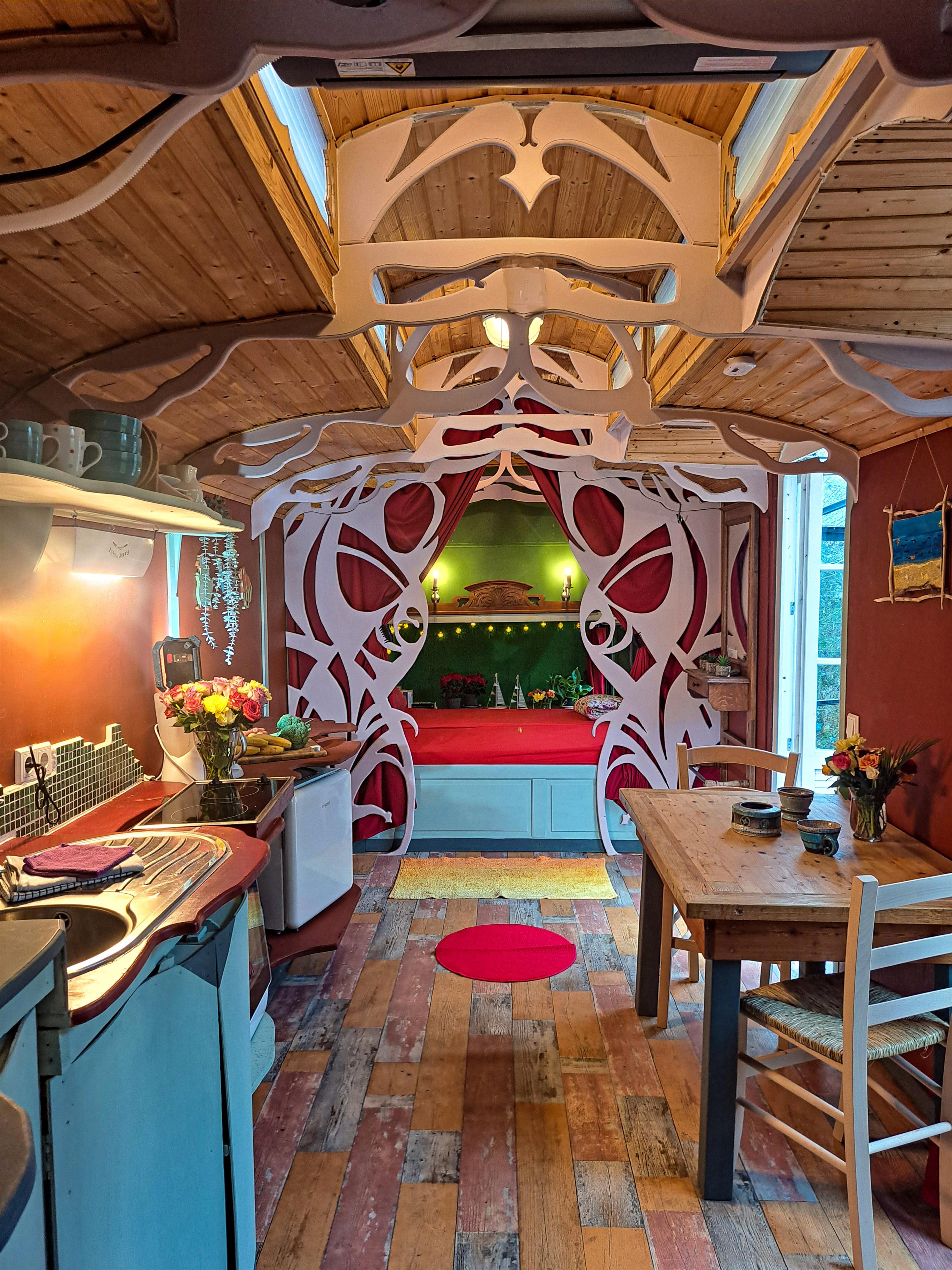 Bunter Drogenrausch in Holz: Innen erwartet euch ein liebevoll – manche würden sagen aggressiv – gestalteter Raum. Der Ausbau ist organisch, nachhaltig und so bunt, dass ihr gar keine andere Wahl habt, als sofort gute Laune zu kriegen. Hier wurde jeder Quadratzentimeter so clever genutzt, dass ihr euch fragt, warum eure eigene Wohnung eigentlich so groß und nutzlos ist.