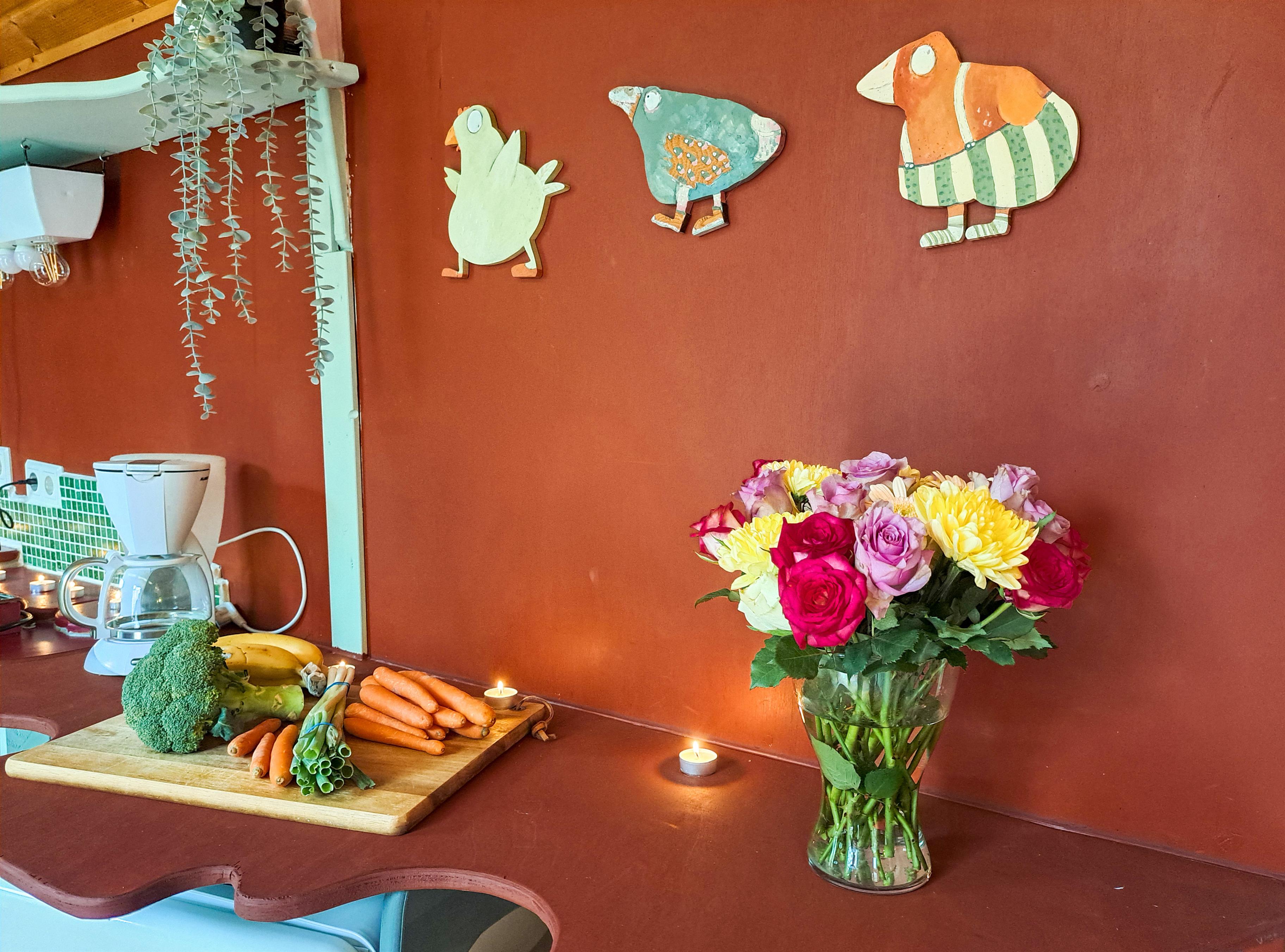 Das hier ist nicht irgendein Fertighaus-Karton, das ist ein farbenfrohes, handgefertigtes Unikat. Eine kleine, leicht überzuckerte Oase - strategisch platziert auf unserer Obstwiese.