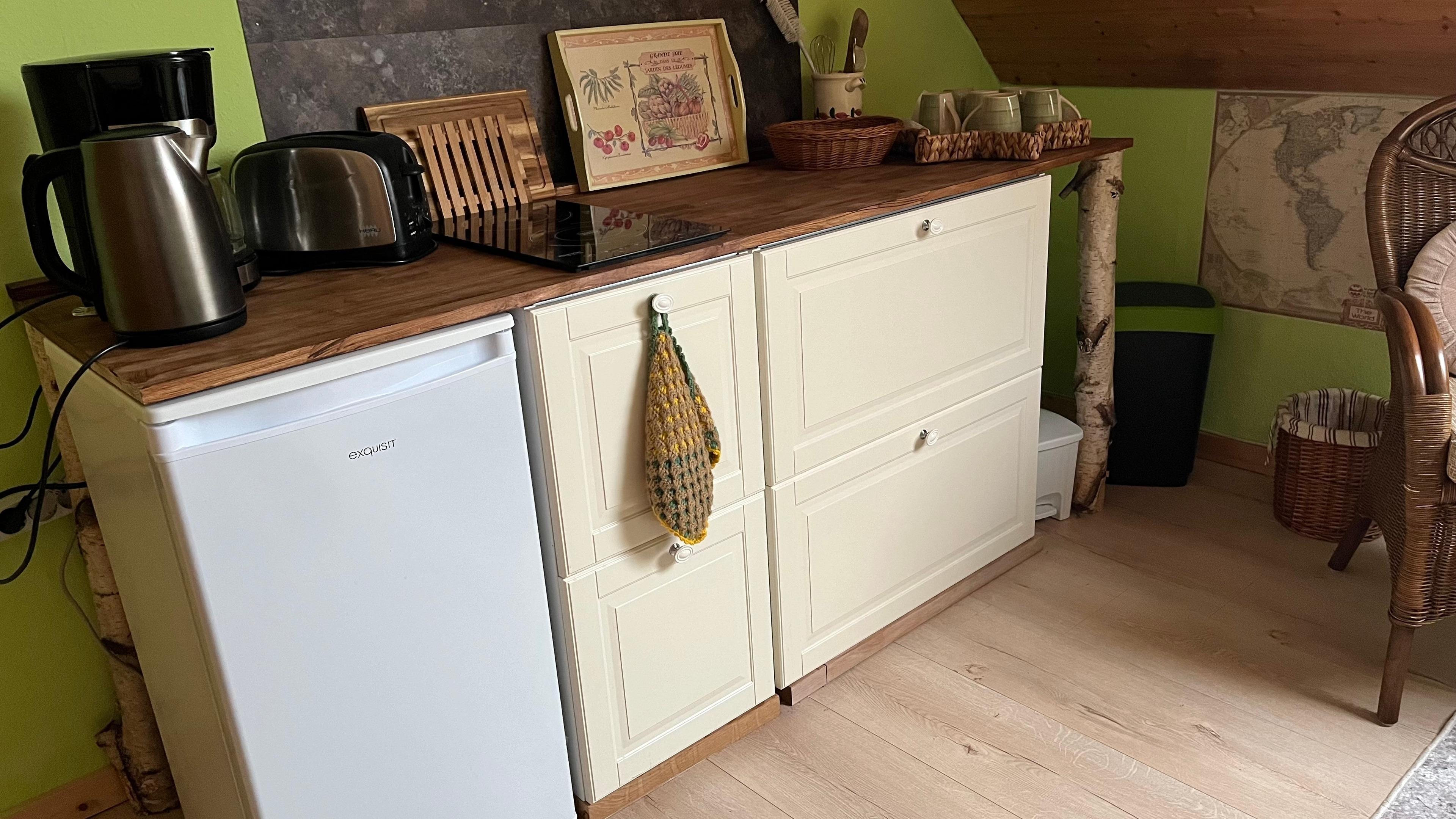 In der Miniküche gibt es einen Fernseher, einen Kühlschrank und die Möglichkeit, in gewissem Rahmen Mahlzeiten zuzubereiten.