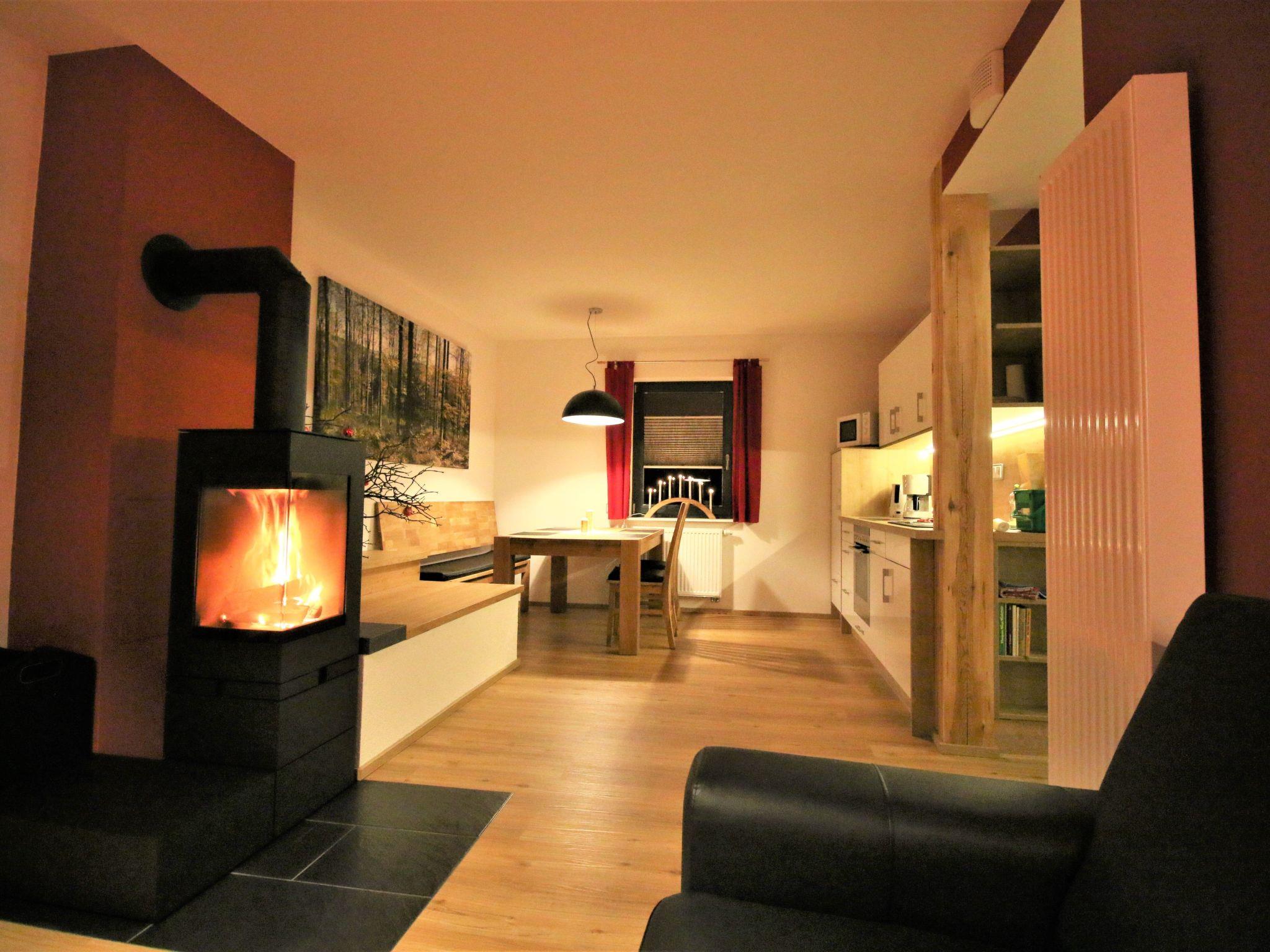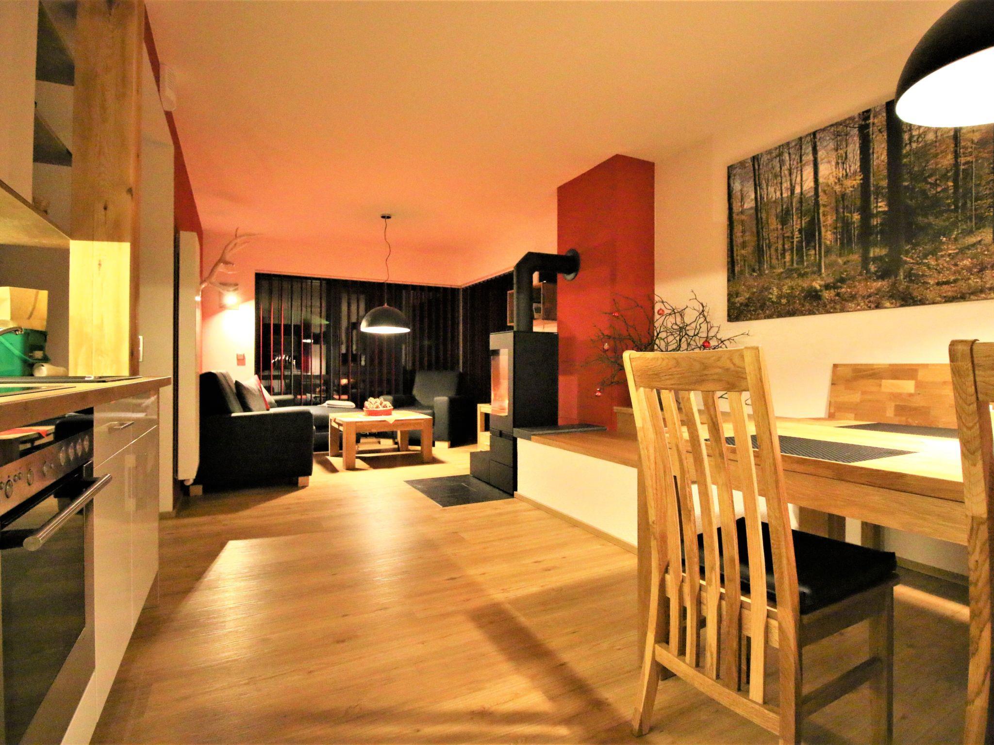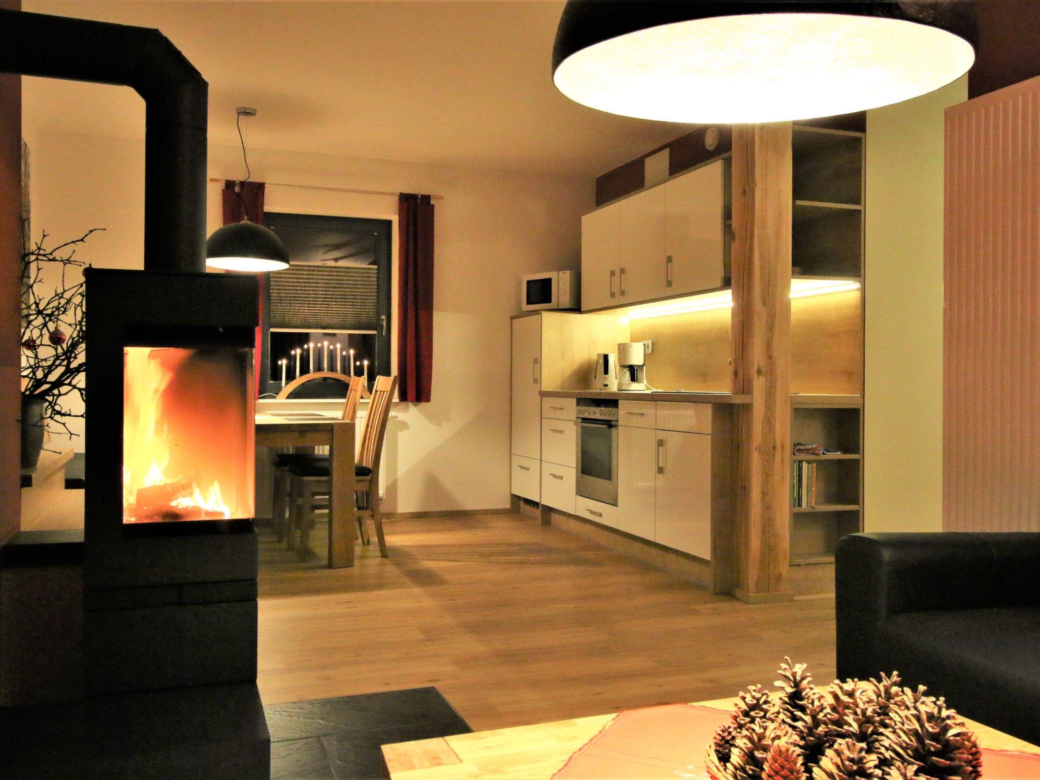 The holiday flat is about 67 m² in size and is located on the ground floor. It consists of a large living/kitchen area with sofa, coffee table and armchair, HD TV and music system. The floor-to-ceiling panoramic glazing provides a beautiful view of the surrounding landscape and the fireplace ensures a cosy ambience and relaxation. The kitchen with dining area is fully equipped with a hob, oven, microwave, coffee machine and dishwasher. There are two bedrooms, each with a double bed and spacious wardrobes. The bathroom with shower is modern and spacious, and the modern interior design, dominated by beautiful wood and friendly colours, creates a pleasant feel-good ambience to make your stay as comfortable as possible.