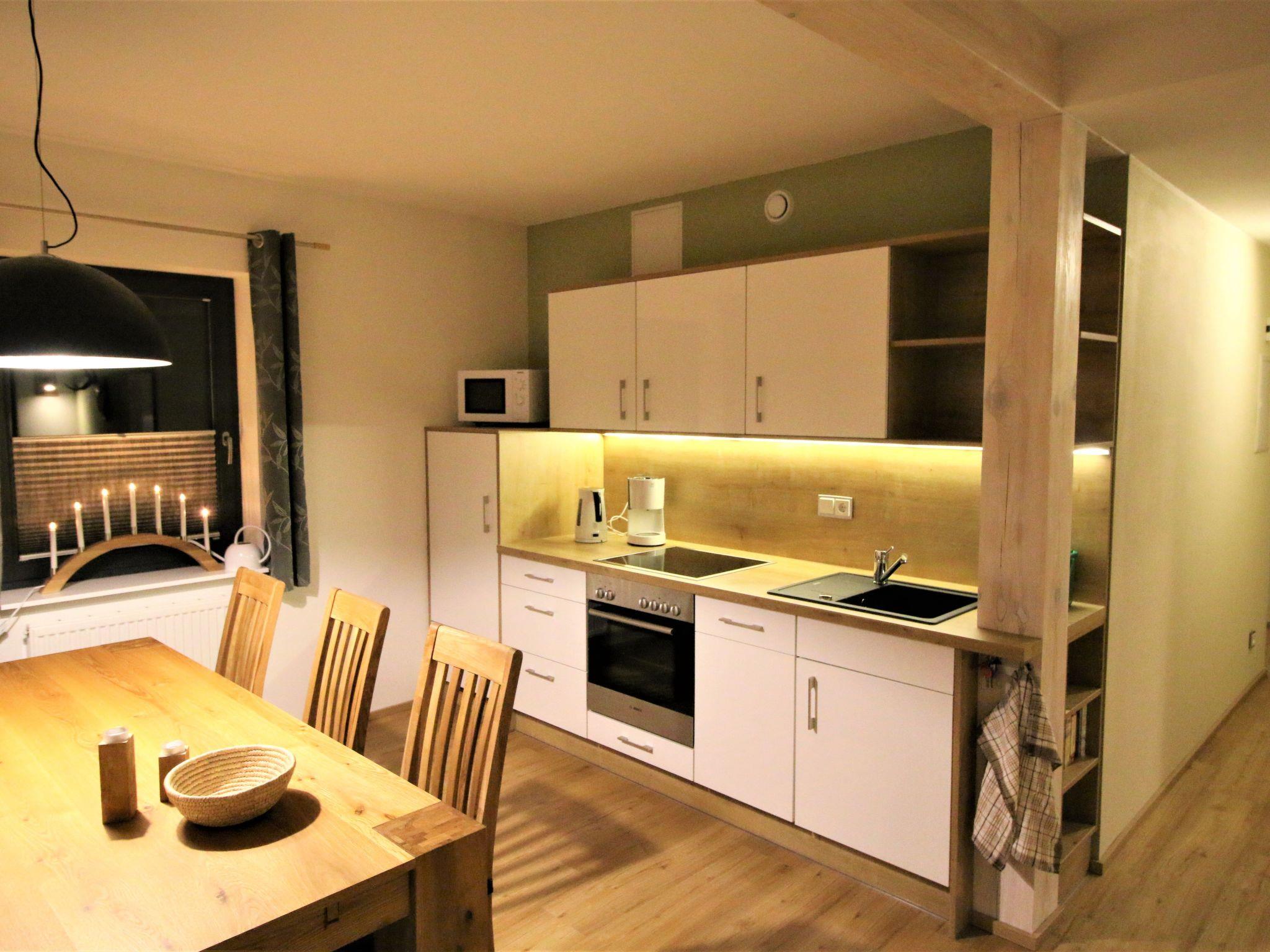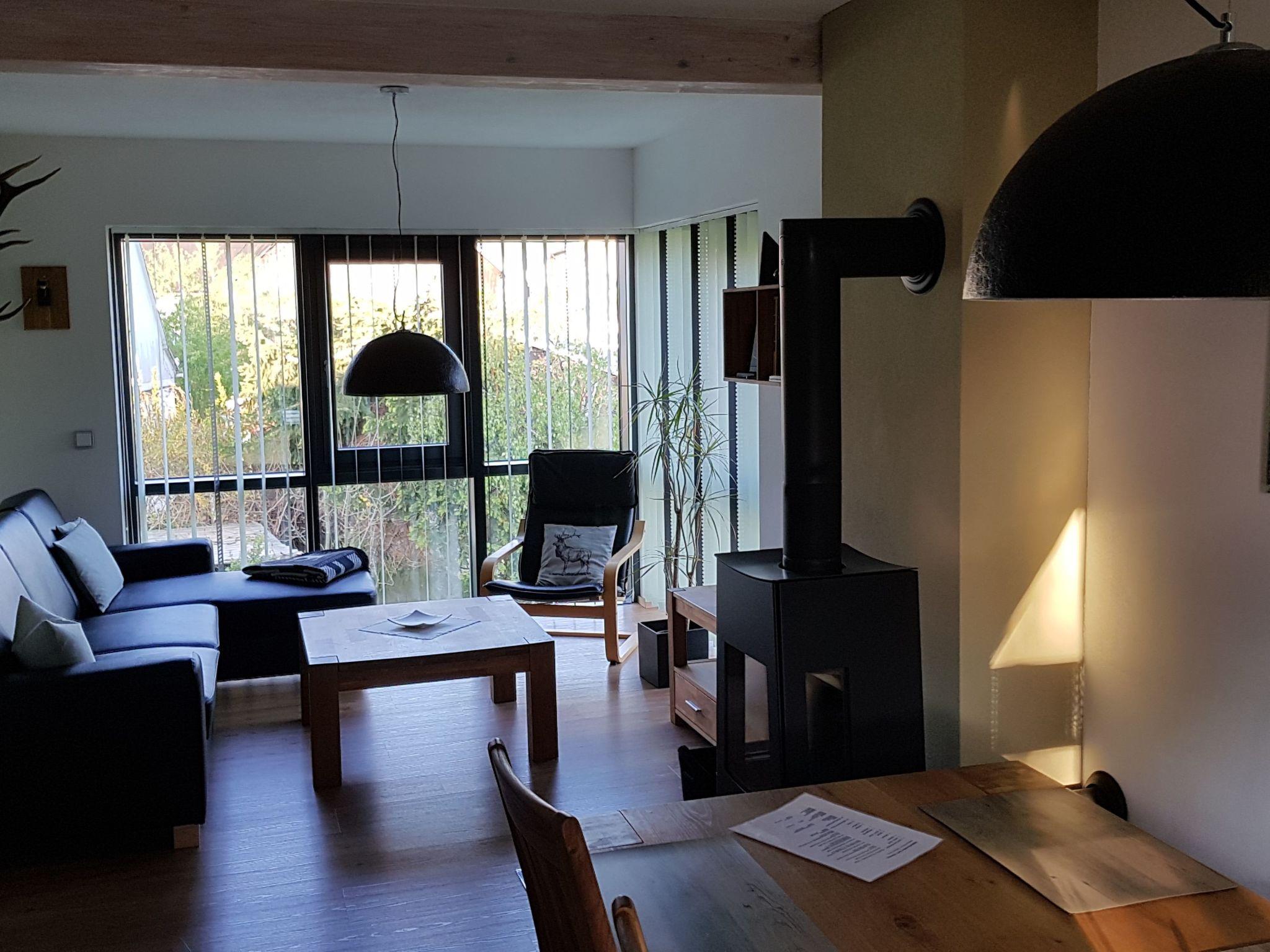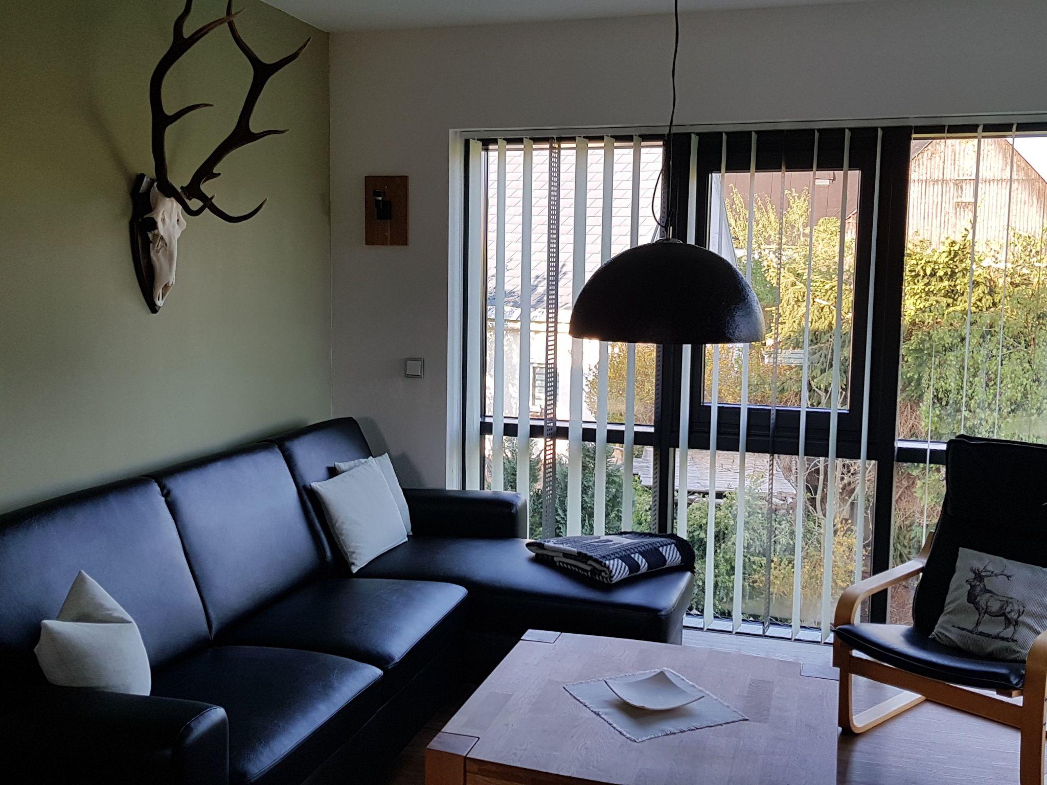 The holiday flat is about 67 m² in size and is located on the upper floor. It consists of a large living/kitchen area with sofa, coffee table and armchair, HD TV and music system. The floor-to-ceiling panoramic glazing provides a beautiful view of the surrounding landscape and the fireplace ensures a cosy ambience and relaxation. The kitchen with dining area is fully equipped with a hob, oven, microwave, coffee machine and dishwasher. There are two bedrooms, each with a double bed and spacious wardrobes. The bathroom with shower is modern and spacious, and the modern interior design, dominated by beautiful wood and friendly colours, creates a pleasant feel-good ambience to make your stay as comfortable as possible.