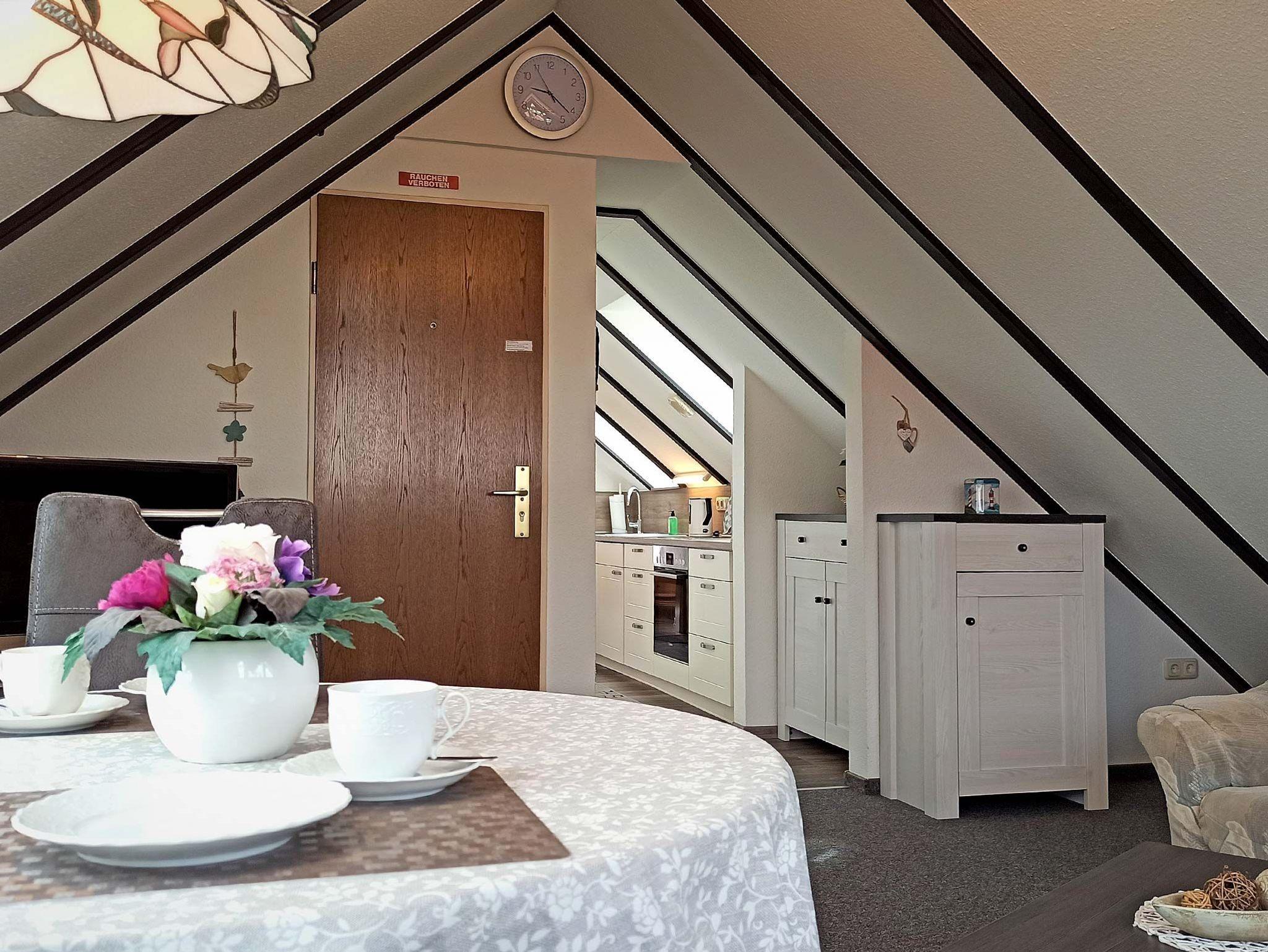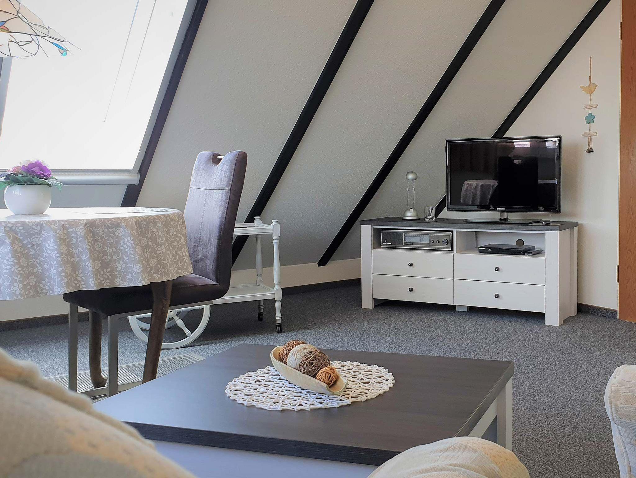 Das komfortable Dachstudio (ca. 40 qm) für 2 Personen erstreckt sich über das gesamte Spitzdach des Hauses und bietet einen herrlichen Ausblick auf die Harle und die ostfriesische Landschaft. Ausgestattet ist es folgendermaßen: Wohnzimmer mit Polstergarnitur, Essecke, Sat-HDTV, DVD, Radio, kostenloses WLAN. Küchenzeile mit Wasserkocher, Kaffeemaschine uvm. Schlafzimmer mit Doppelbett und separatem TV. Bad mit Dusche/WC. Nutzung des großen Gartens mit Terrasse und Grillplatz. Parkplatz. Nichtraucherwohnung! Fliegengitter in den Wohn- und Schlafräumen. Bettwäsche und Handtücher-Erstausstattung inklusive.