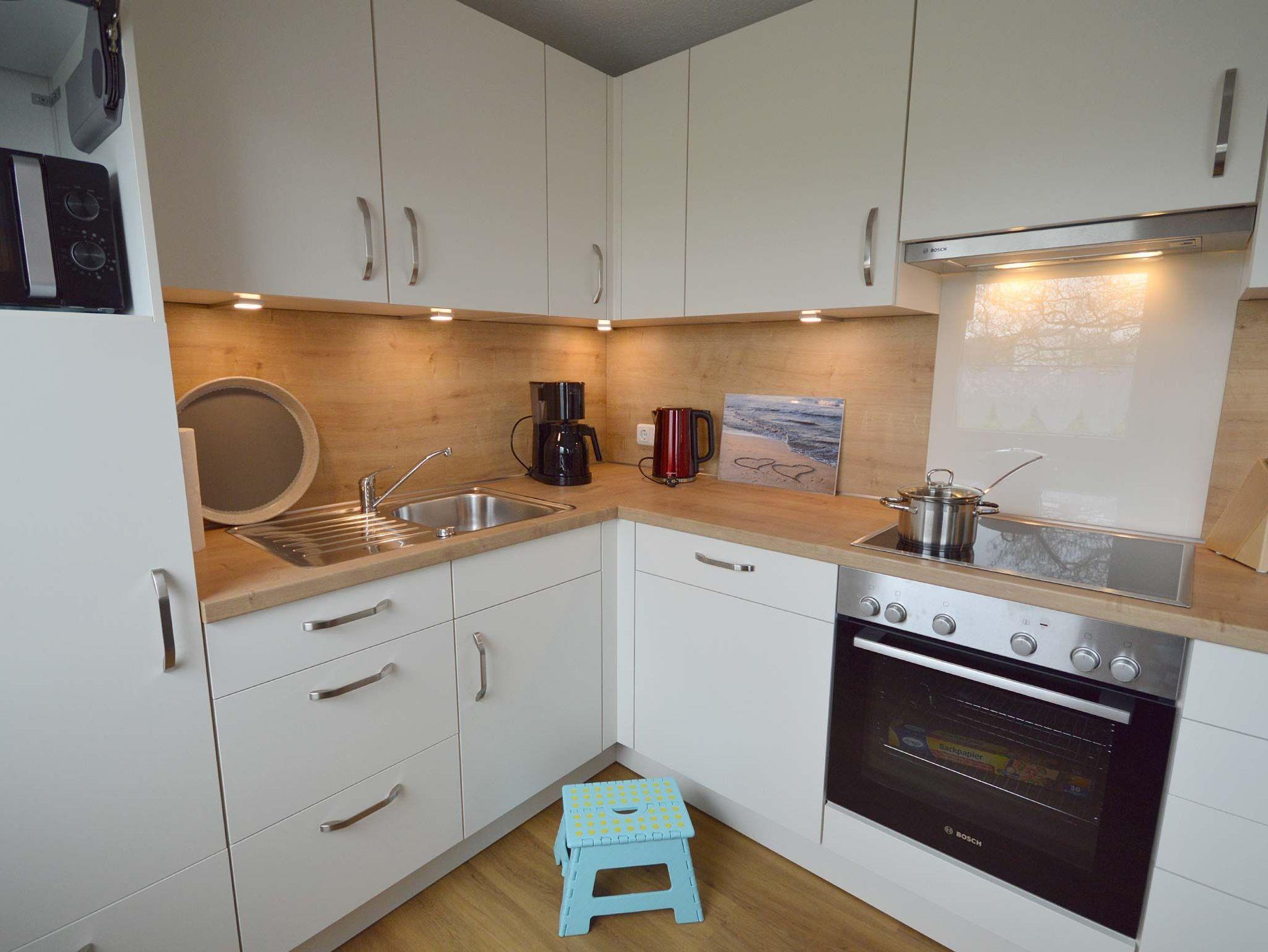Die Einbauküche befindet sich auch im Wohn-Essbereich. Die Küche ist vollausgestattet mit Cerankochfeld, Backofen, Spülmaschine, Kühlschrank mit Gefrierfach u.v.m. was man so alles für den Urlaub braucht.