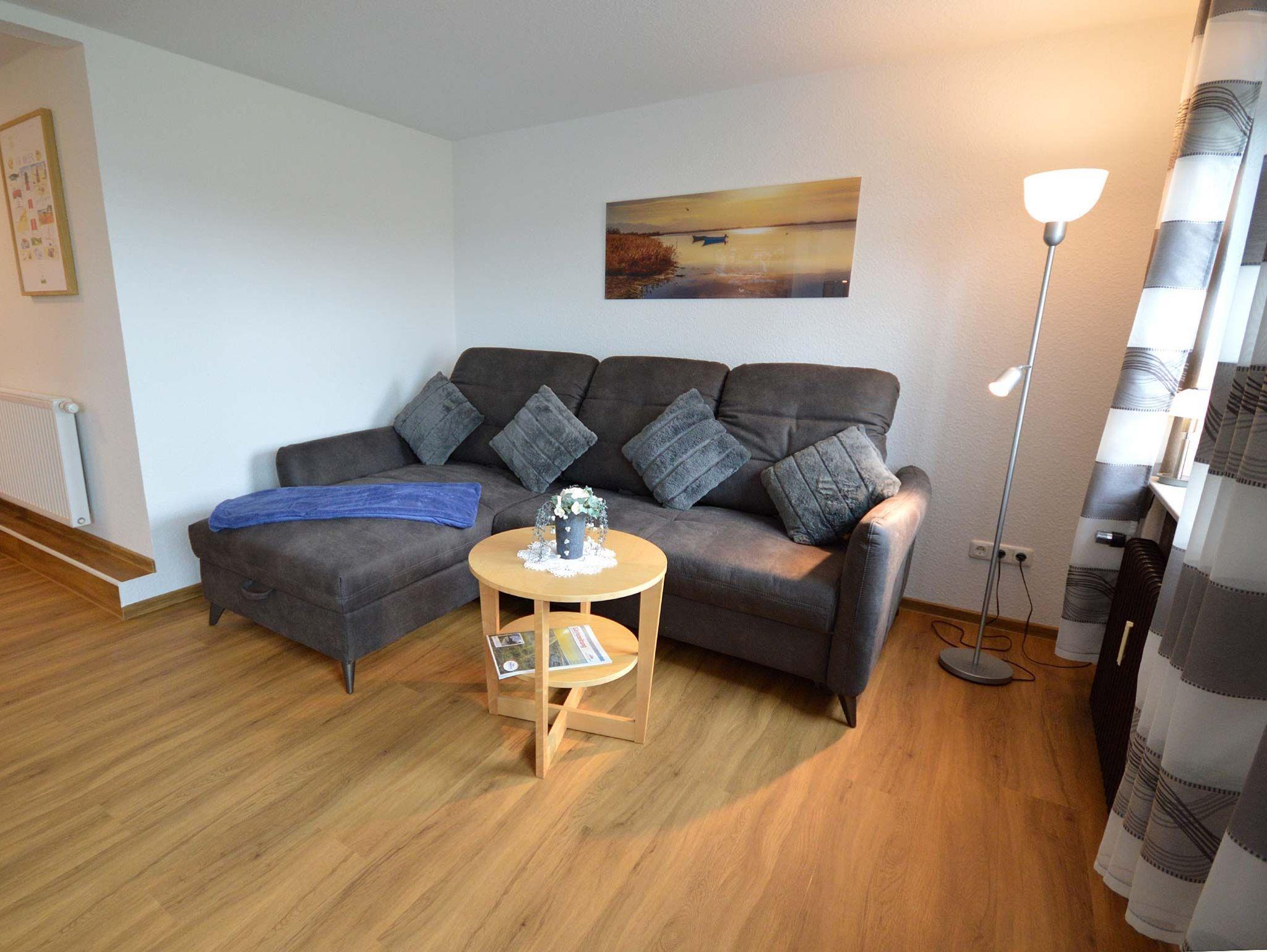 Das Wohnzimmer ist mit einer Couchgarnitur, Essecke, Sat Flachbildschirm und Radio ausgestattet.