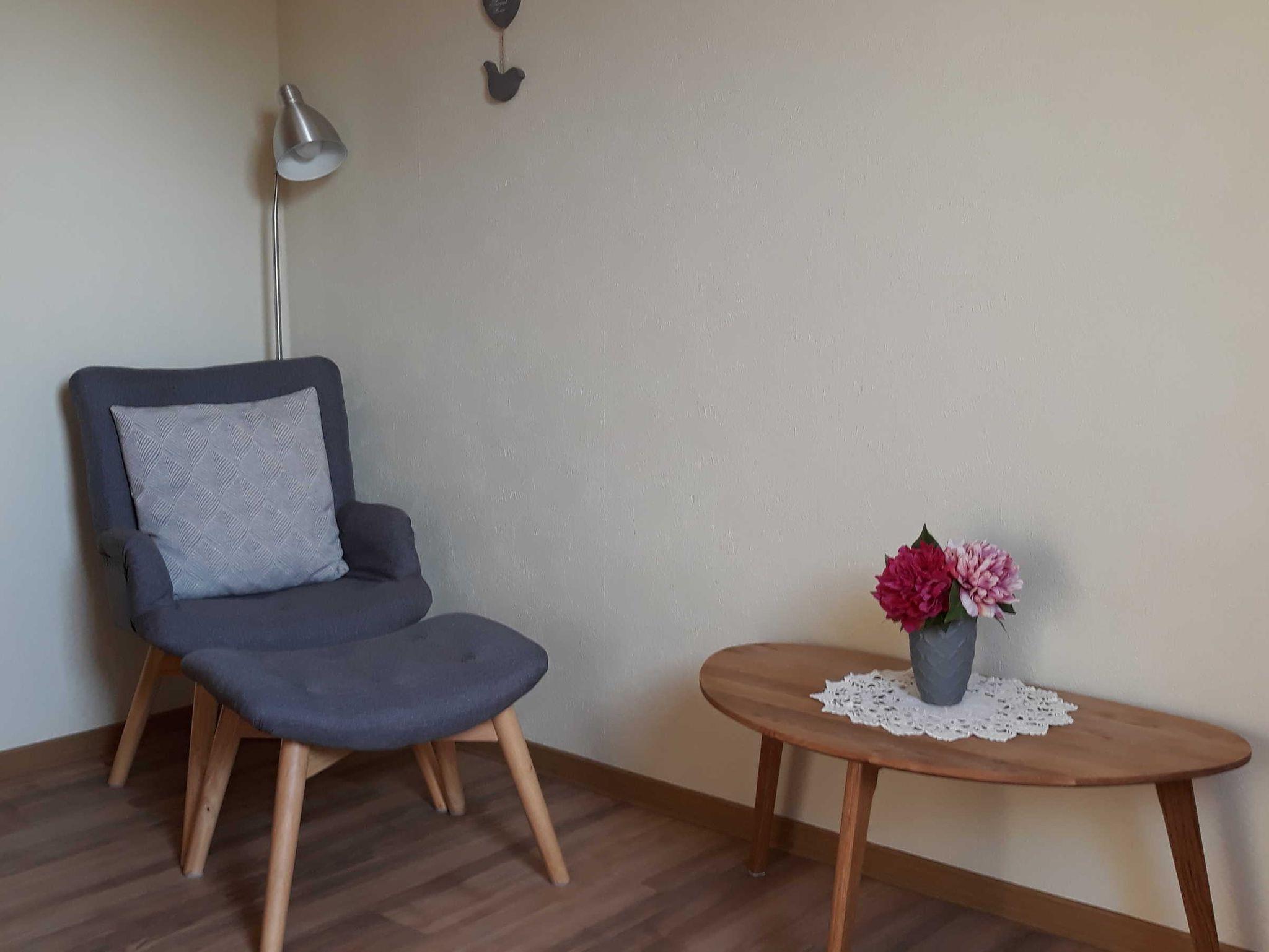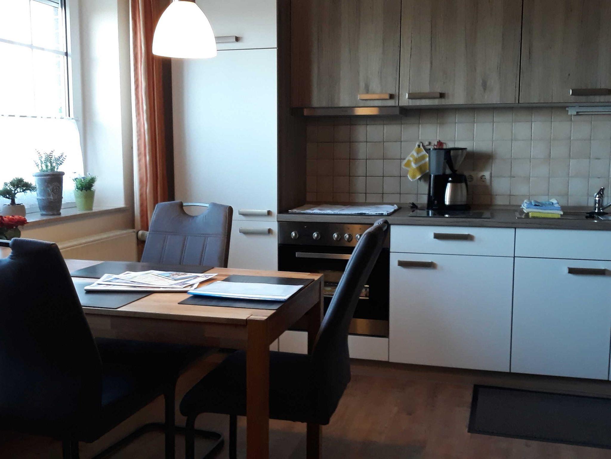 Die Ferienwohnung ist gemütlich eingerichtet und bietet ein Bad mit Dusche/WC und Reisefön, zwei Schlafzimmer, wobei das Einzelzimmer zusätzlich über eine Leseecke verfügt. Die helle Wohnküche ist mit gemütlicher Sofaecke, Tisch und komplett eingerichteter Einbauküche mit Essplatz am Fenster ausgestattet.