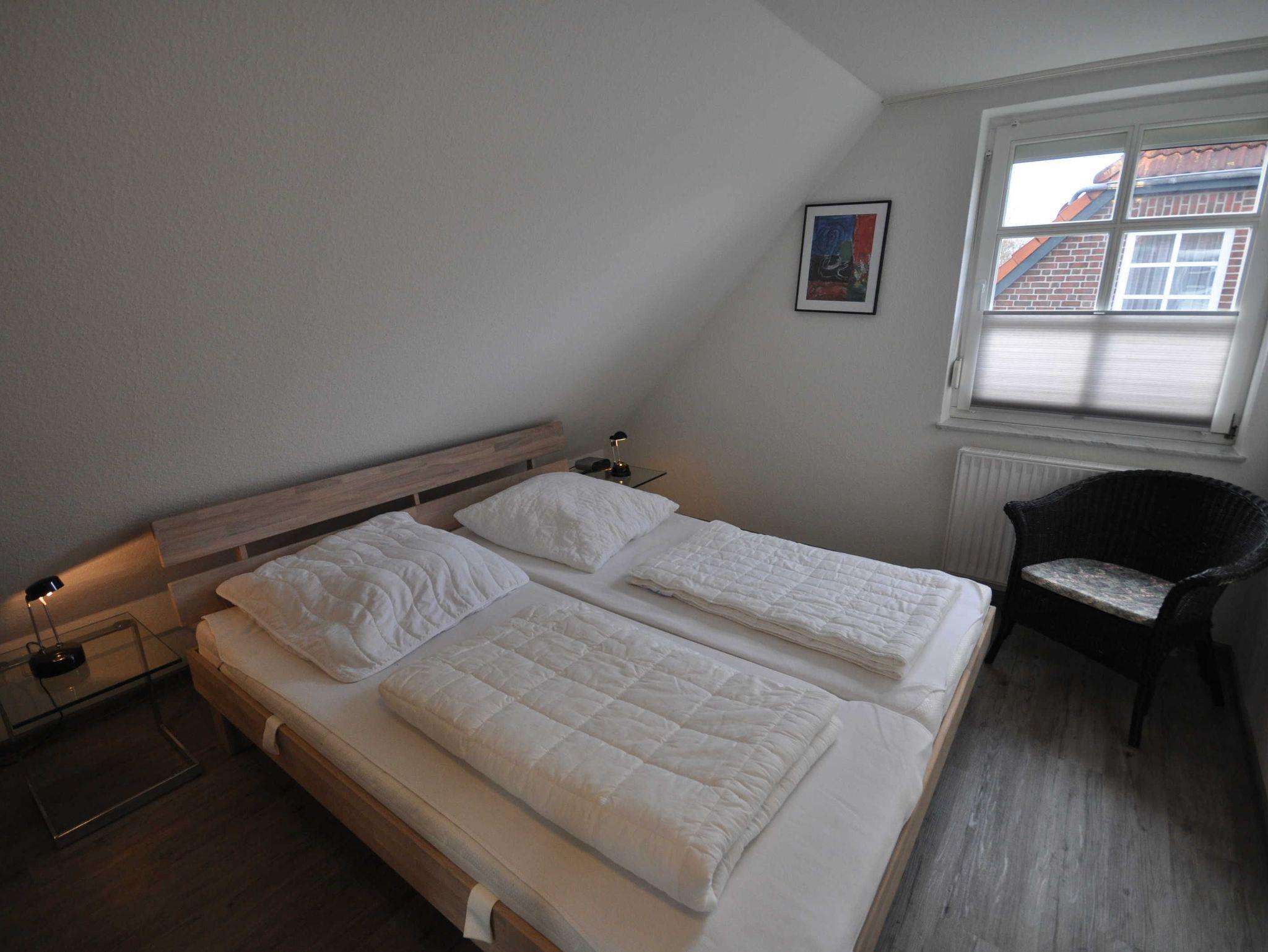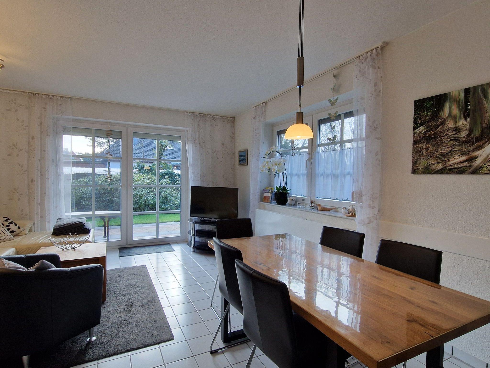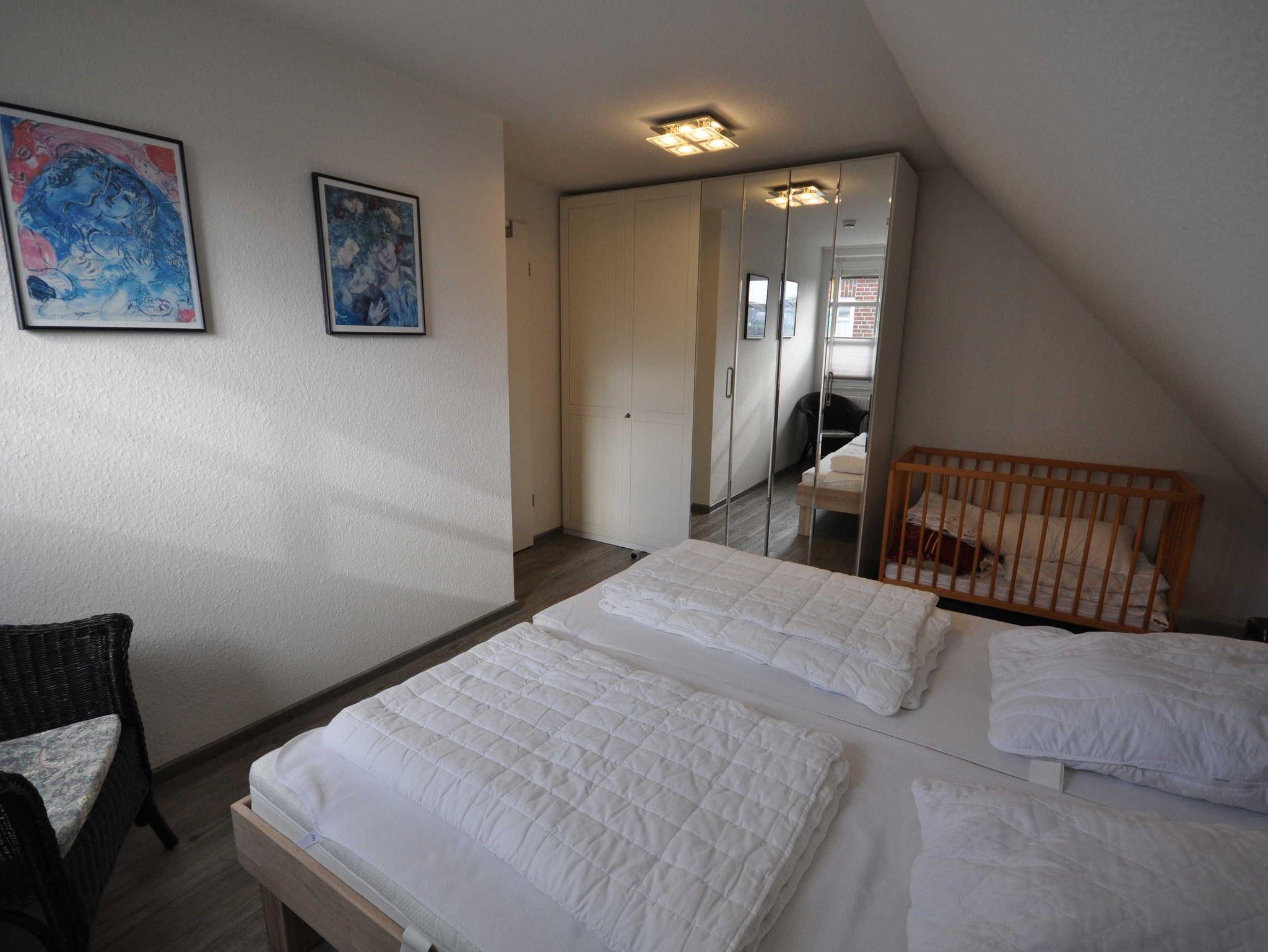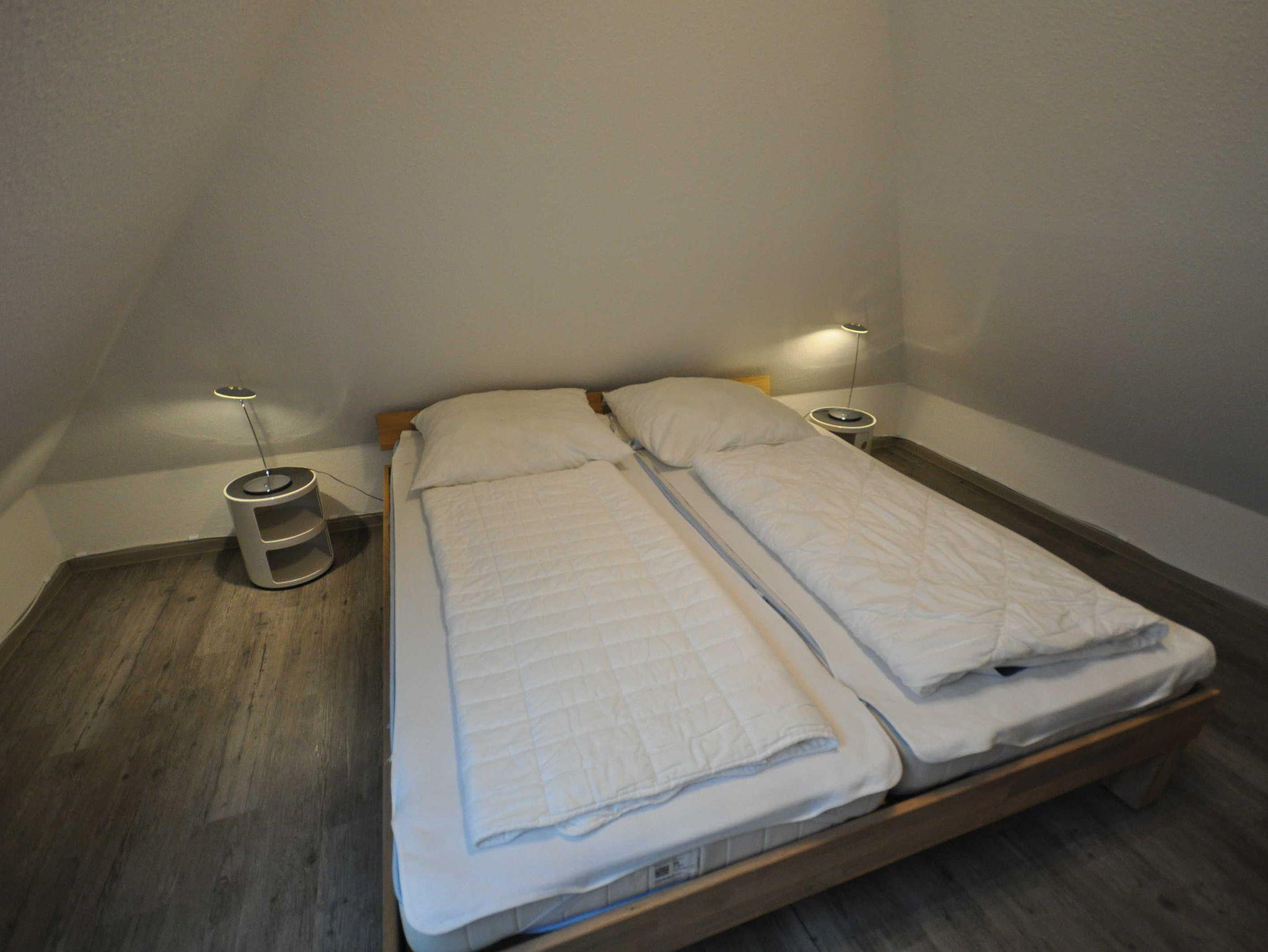Die Doppelhaushälfte ist ansprechend und modern ausgestattet und bietet Platz für bis zu 4 Personen und ein Baby/Kleinkind. Im Erdgeschoss befinden sich ein heller Wohn- und Essbereich mit Ausgang zur Südterrasse, eine separate, vollständig ausgestattete Küche sowie ein Gäste-WC. Das 1. Obergeschoss verfügt über ein Schlafzimmer mit Doppelbett und ein Schlafzimmer mit zwei Einzelbetten sowie über ein Badezimmer mit Dusche und WC. In einem ausgebauten Dachstudio befindet sich ein weiteres Doppelbett mit TV. WLAN steht Ihnen kostenfrei zur Verfügung. Im Erdgeschoss sind Fliesen, im Obergeschoss ist Vinyl verlegt.