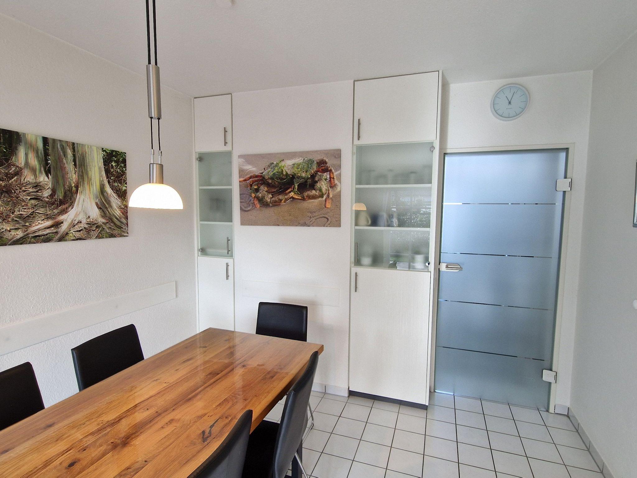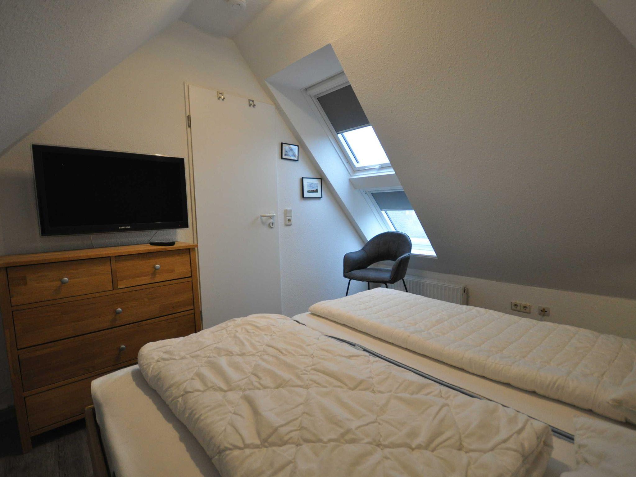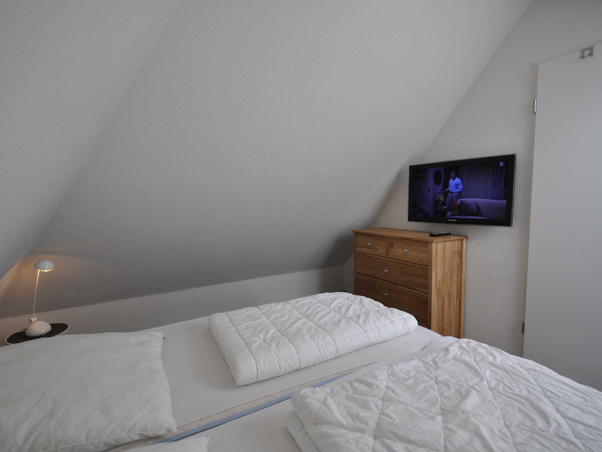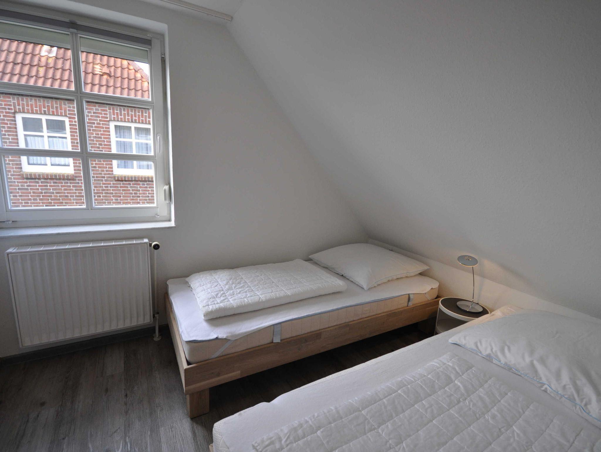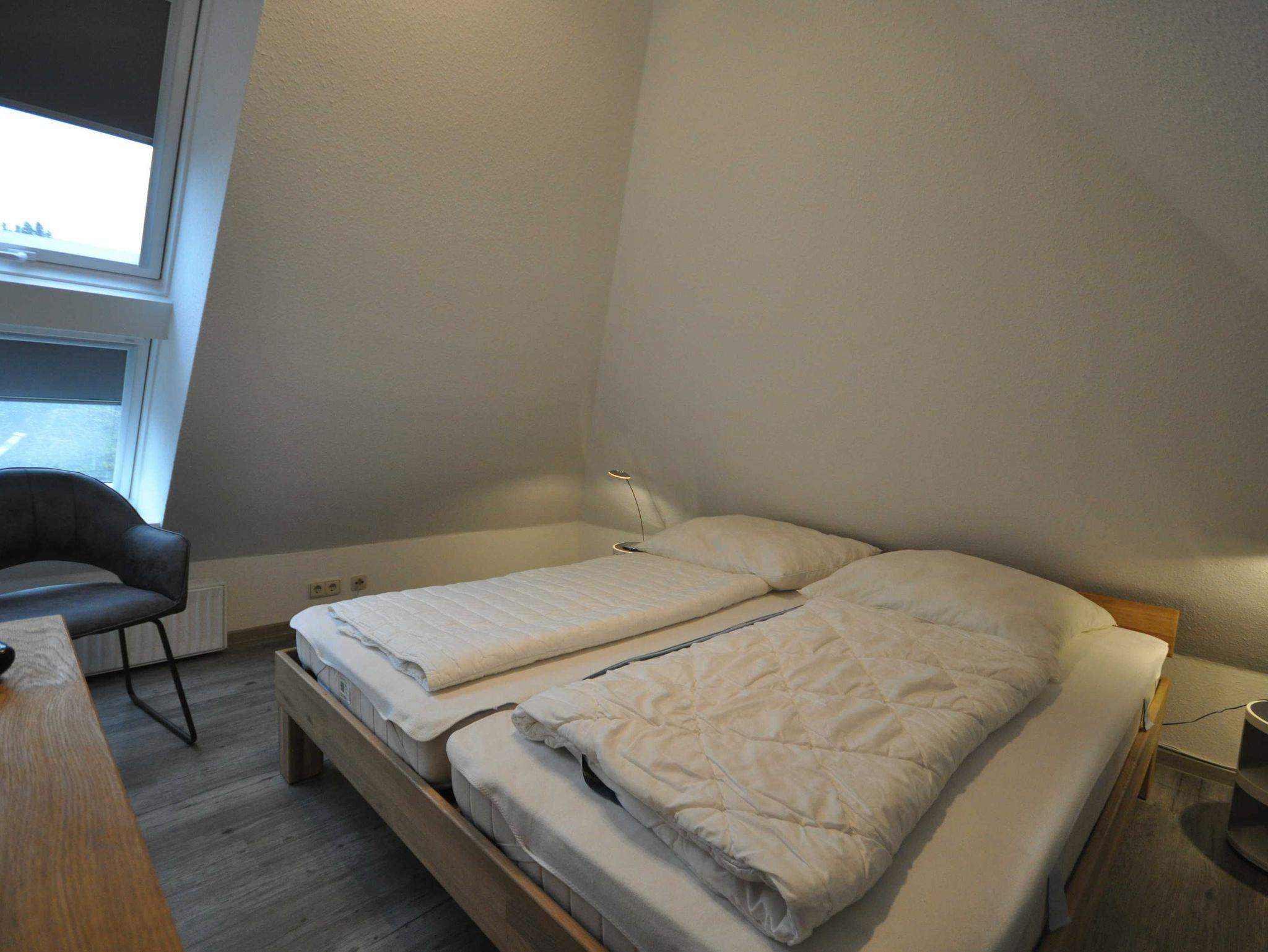 Die Doppelhaushälfte ist ansprechend und modern ausgestattet und bietet Platz für bis zu 4 Personen und ein Baby/Kleinkind. Im Erdgeschoss befinden sich ein heller Wohn- und Essbereich mit Ausgang zur Südterrasse, eine separate, vollständig ausgestattete Küche sowie ein Gäste-WC. Das 1. Obergeschoss verfügt über ein Schlafzimmer mit Doppelbett und ein Schlafzimmer mit zwei Einzelbetten sowie über ein Badezimmer mit Dusche und WC. In einem ausgebauten Dachstudio befindet sich ein weiteres Doppelbett mit TV. WLAN steht Ihnen kostenfrei zur Verfügung. Im Erdgeschoss sind Fliesen, im Obergeschoss ist Vinyl verlegt.
