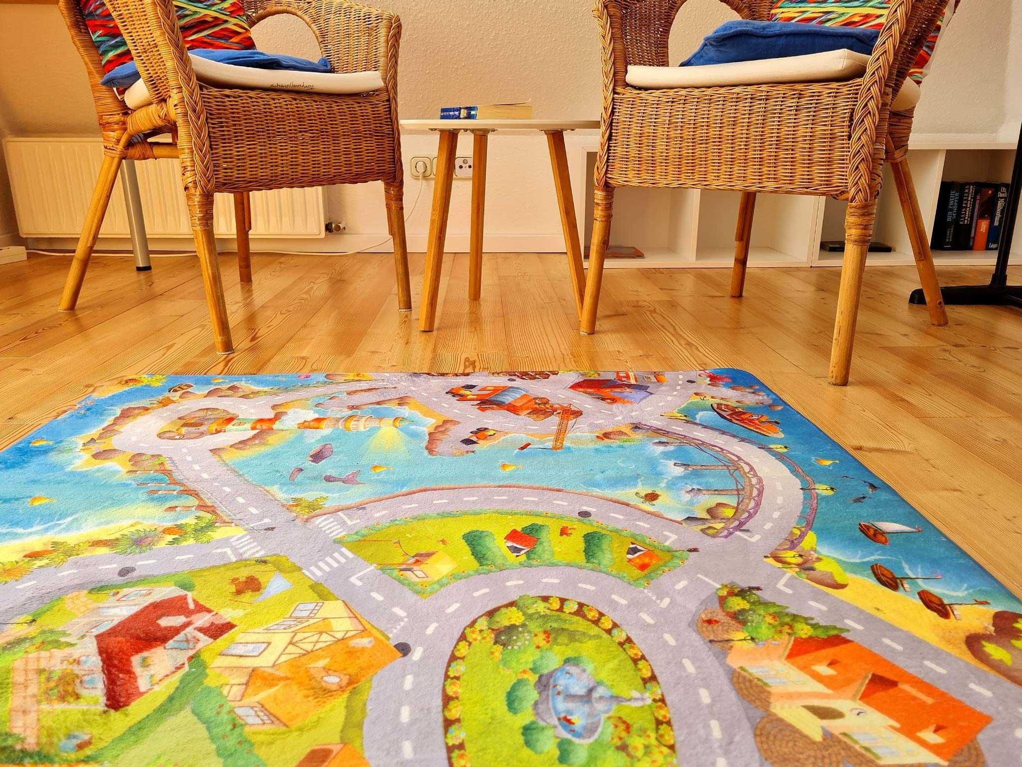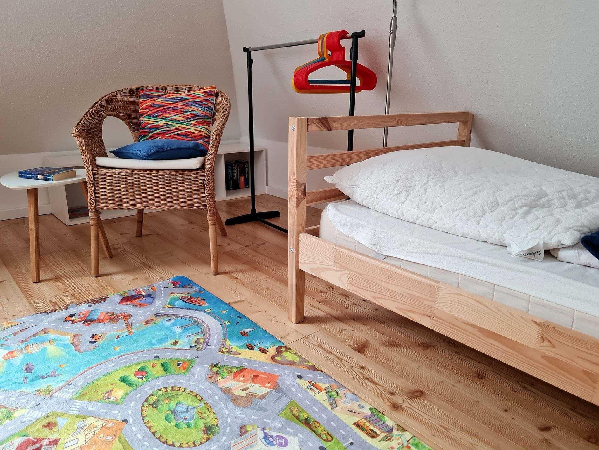Eine Holztreppe führt in das gemütliche Dachgeschoss. Hier stehen weitere 2 Einzelbetten (90 cm) für Sie bereit. Zusätzlich gibt es einen Schreibtisch und zwei schöne Sessel, die zum Lesen einladen. Eine kleine Auswahl an Büchern ist vorhanden. Der Fußboden ist mit fußwarmen Holzdielen ausgelegt. Alle Schlafräume lassen sich mit Außenrolladen verdunkeln. Freies WLAN steht zu Ihrer Verfügung.