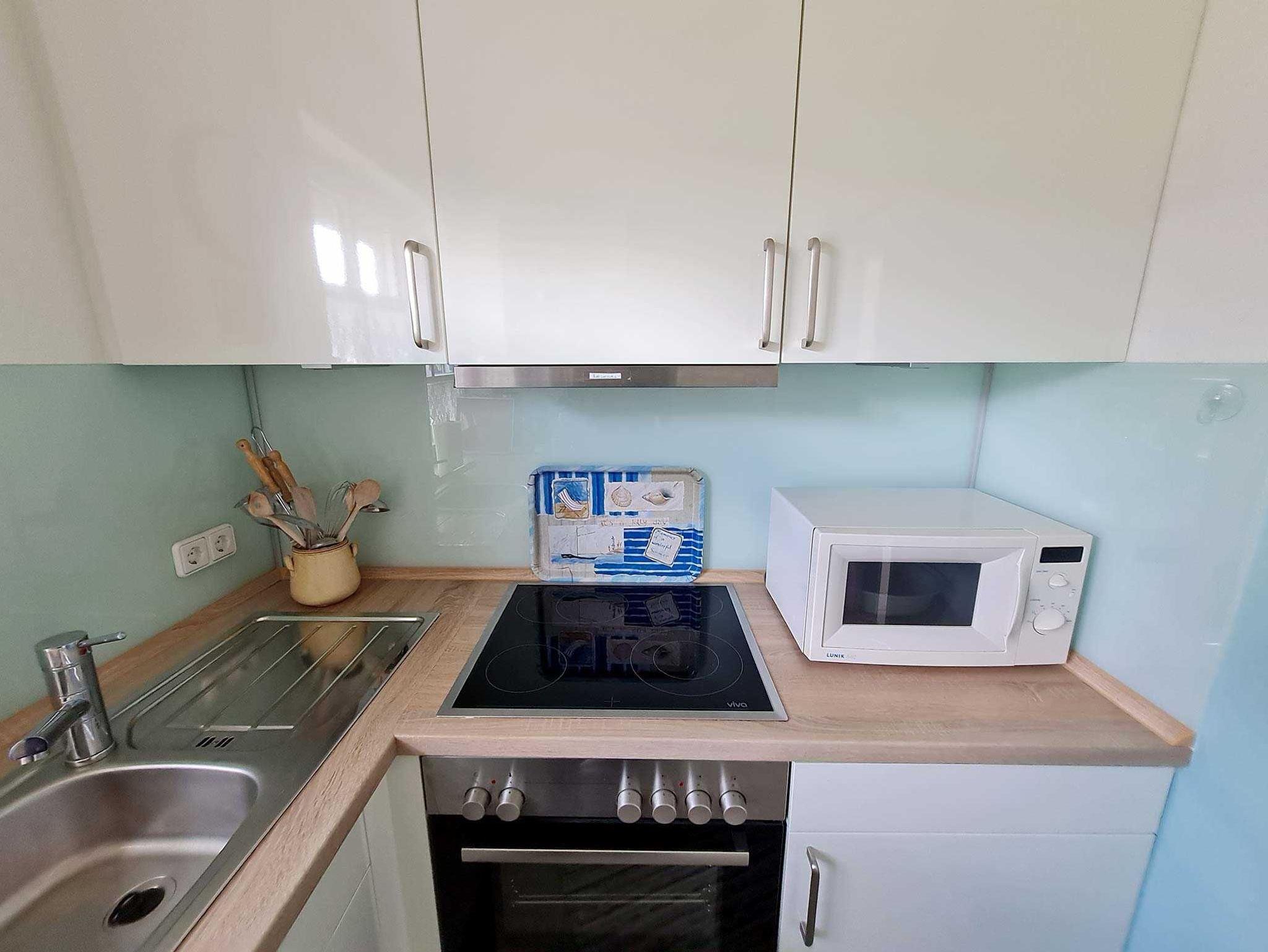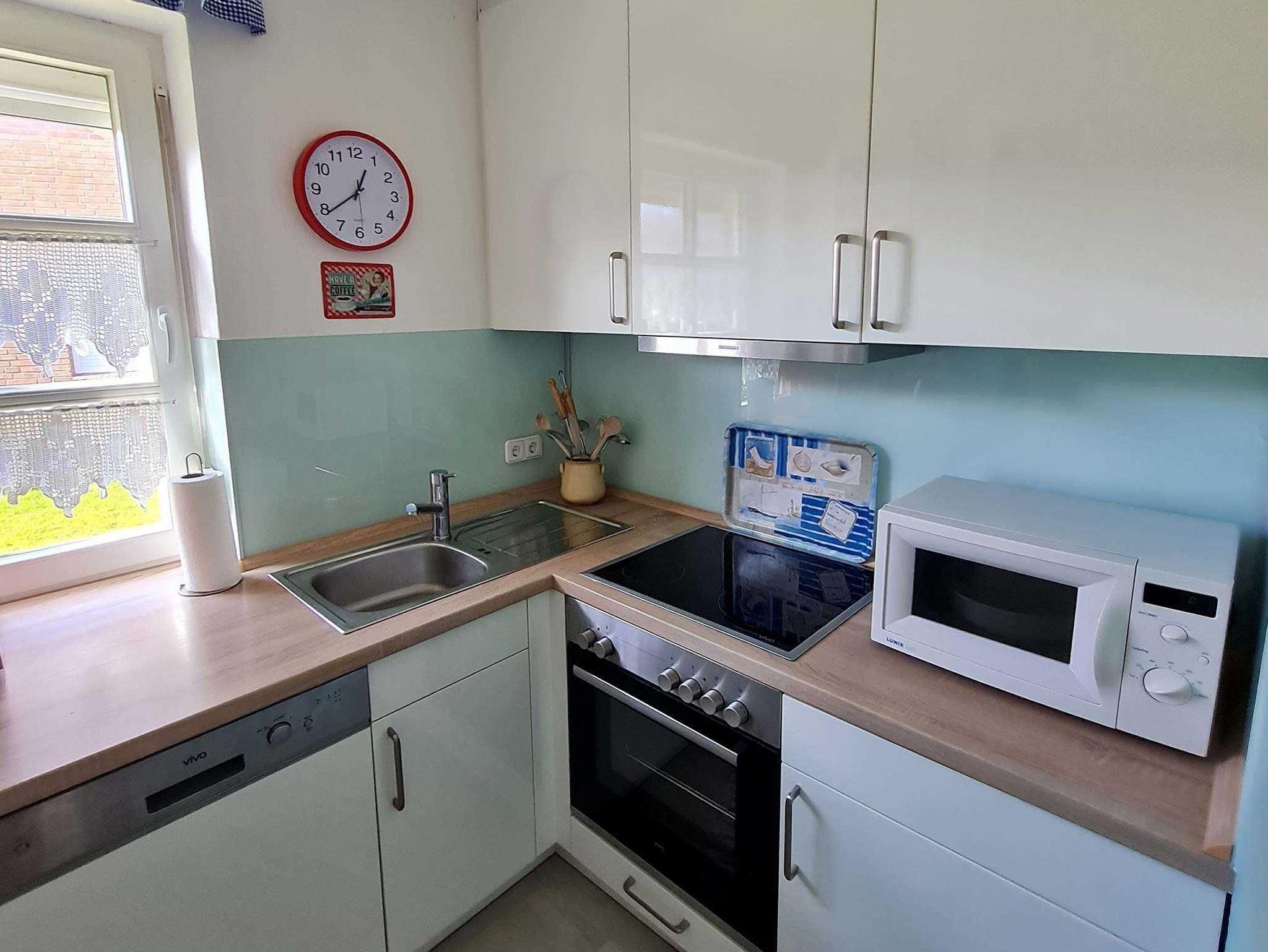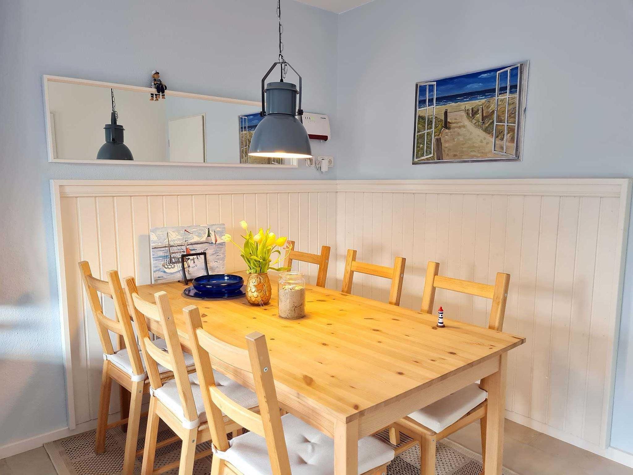 Im durchgängig gefliesten Erdgeschoss befinden sich die neue komplett eingerichtete Küche mit Heißluftofen, Ceranfeld, Spülmaschine, Kühlschrank mit Gefrierfach, Mikrowelle, Kaffeemaschine und das gemütliche Wohnzimmer mit einem Essbereich für bis zu 6 Personen. Das Wohnzimmer ist ausgestattet mit Satellitenfernseher, Musikanlage, DVD-Player und Gesellschaftsspielen. Ein Gäste-WC befindet sich ebenfalls im Erdgeschoss.