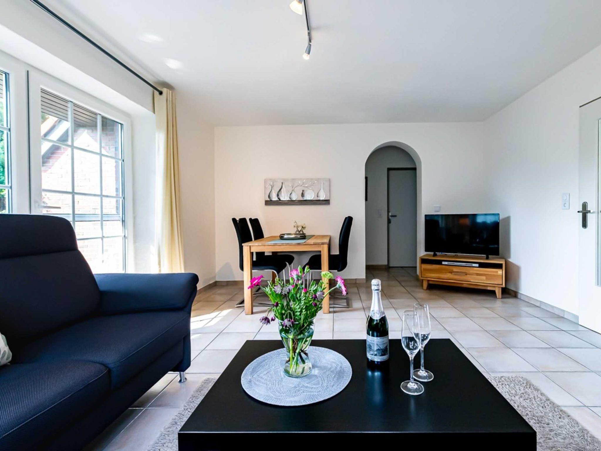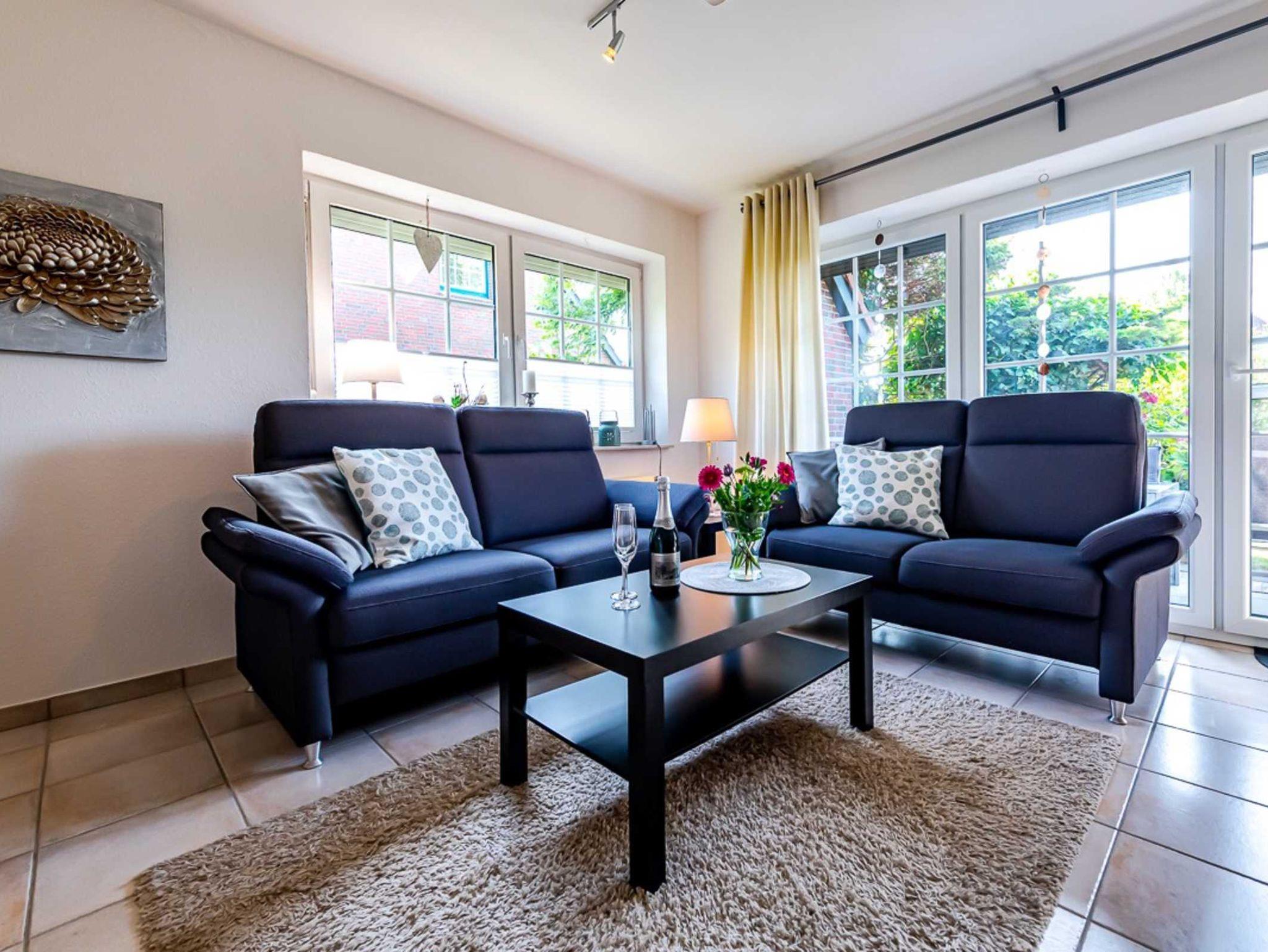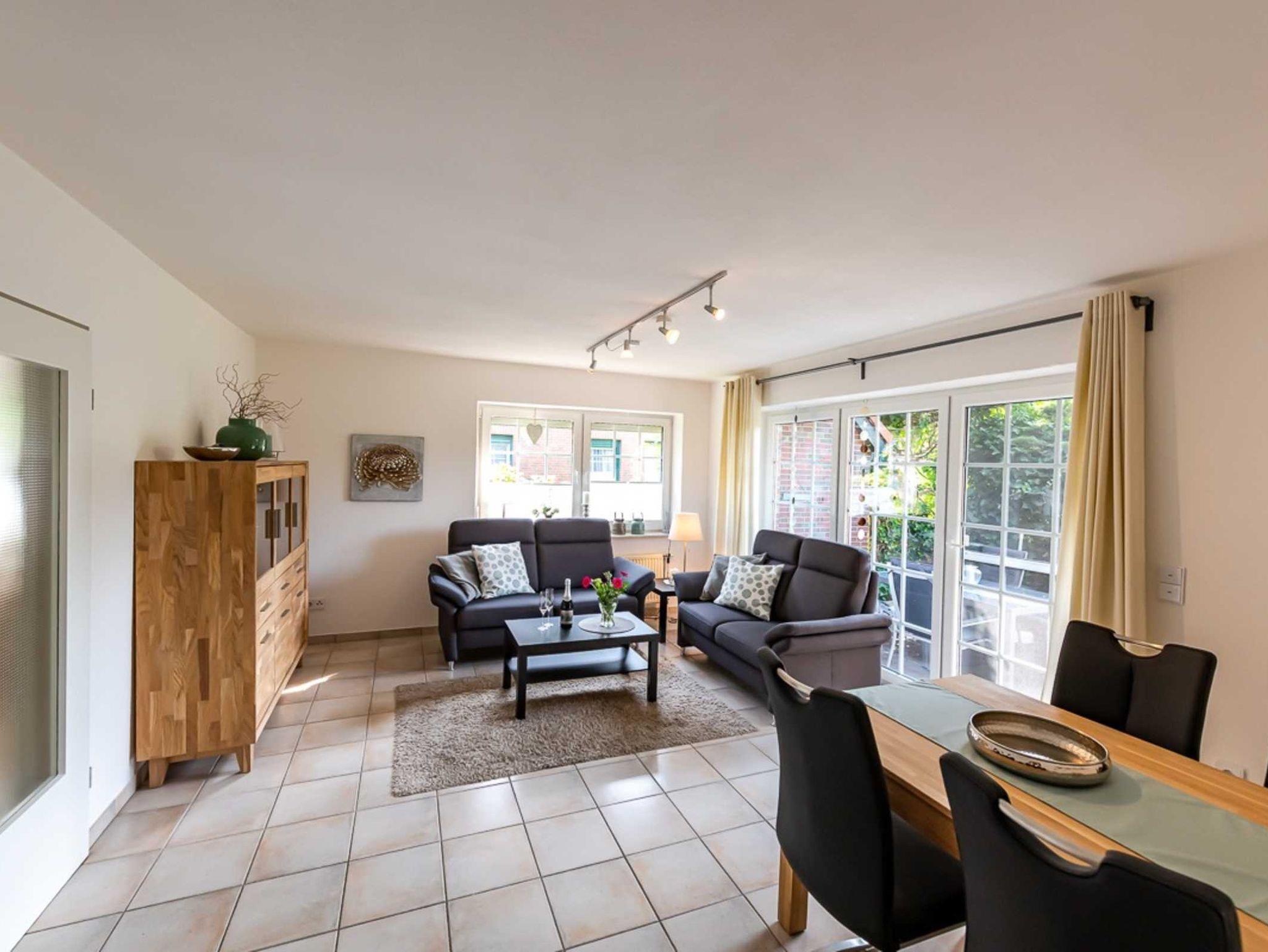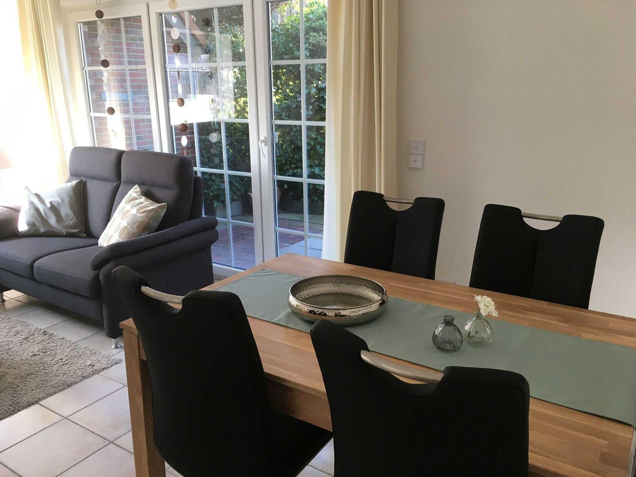 Die helle EG-Wohnung (60qm) mit WLAN bietet bequem Platz für 2-4 Personen und lädt zum Nordseeurlaub ein. Durch das Wohnzimmer mit Essplatz gelangen Sie auf unsere Terrasse und den Garten. (Gartenmöbel und -liegen vorhanden). Die separate Küche verfügt über Spülmaschine, Kaffee- und Senseopadmaschine, Kühlschrank mit Gefrierfach, Herd mit Backofen, Wasserkocher, Toaster etc.. Ein Schlafzimmer ist ausgestattet mit einem Doppelbett (1,80 x 2,00 Meter, 2 Matratzen)das andere Schlafzimmer ist ausgestattet mit einem Etagenbett. Das Bad verfügt über Dusche und WC. (Haartrockner vorhanden)