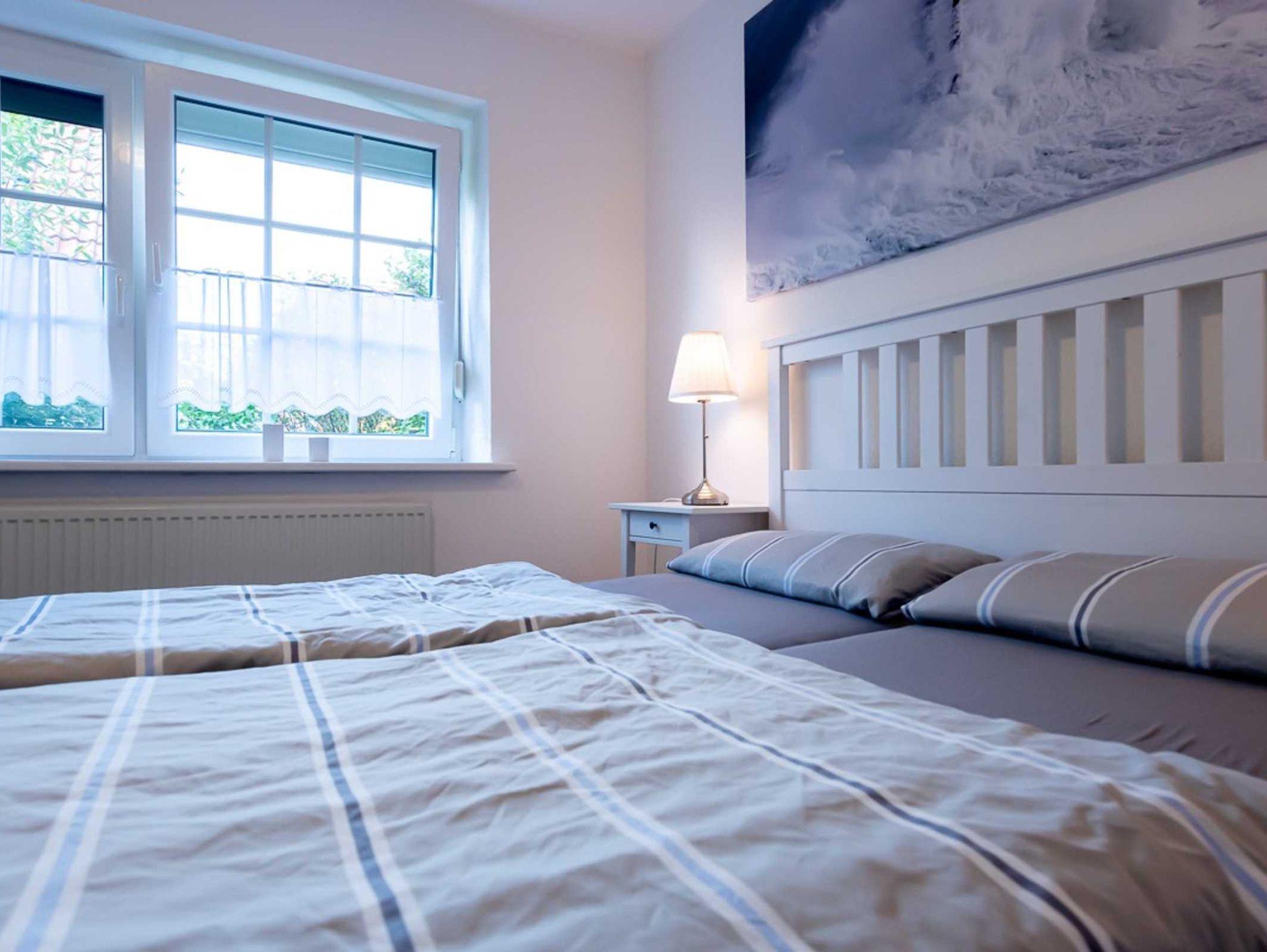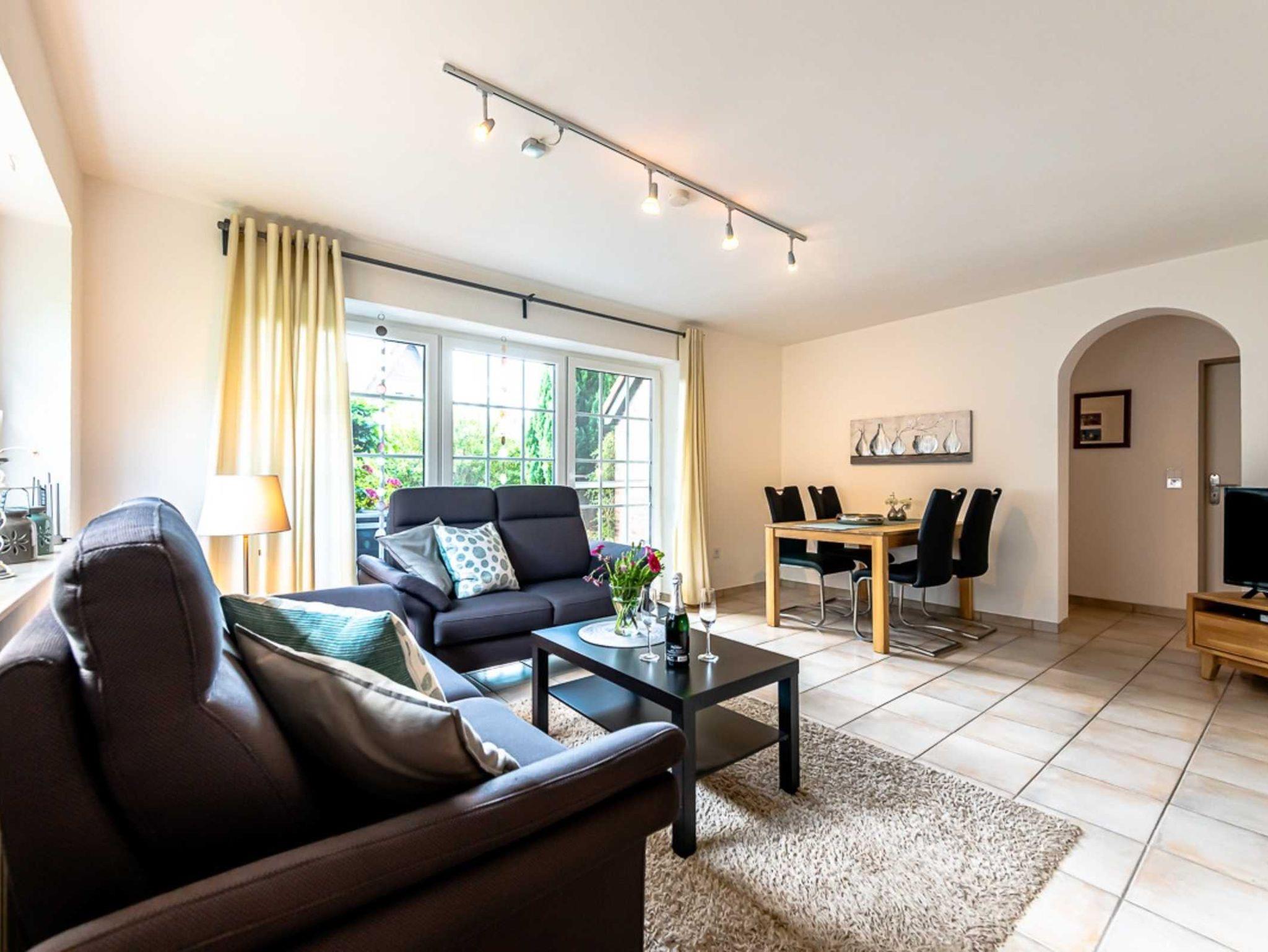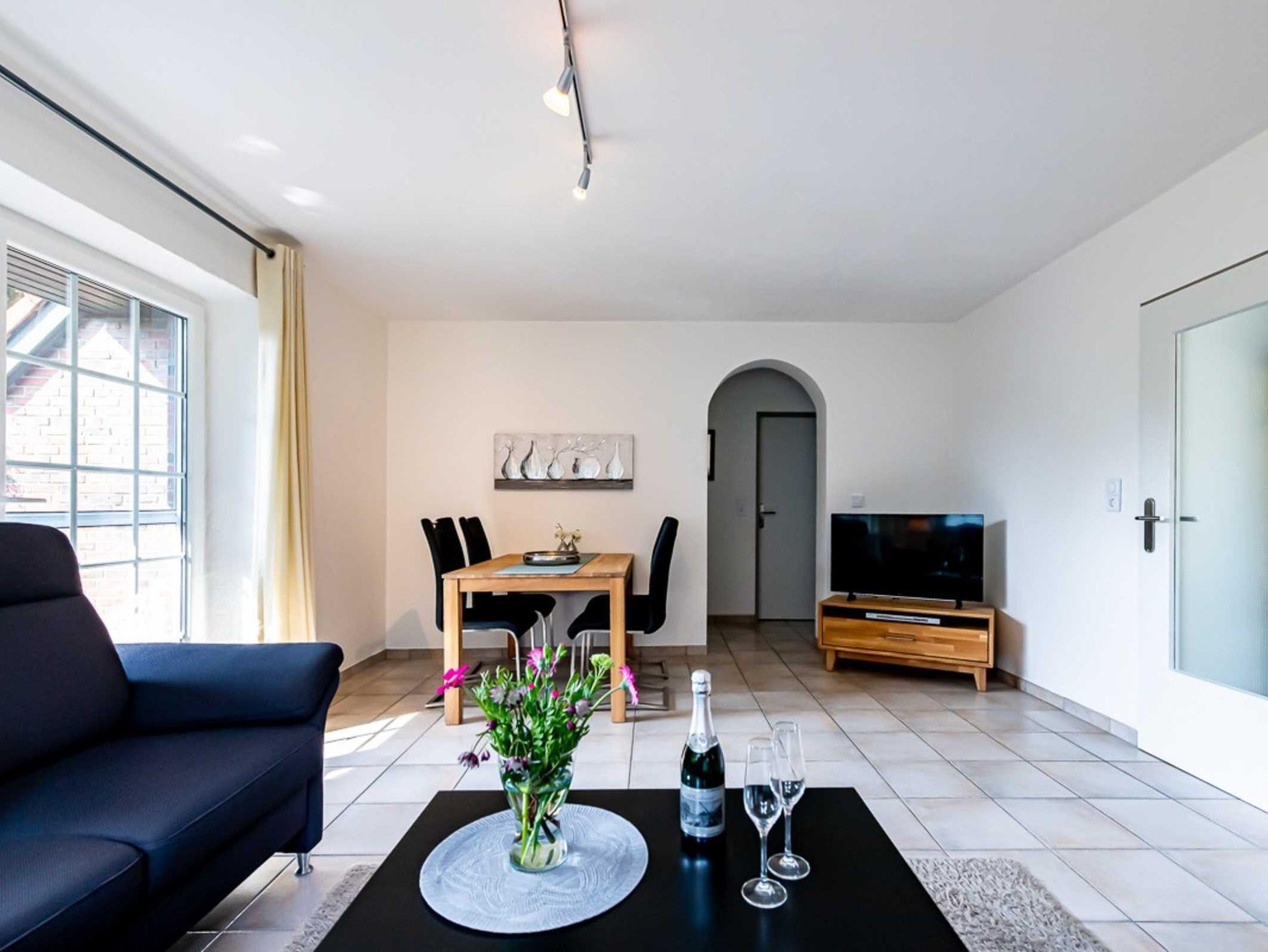 Die helle EG-Wohnung (60qm) mit WLAN bietet bequem Platz für 2-4 Personen und lädt zum Nordseeurlaub ein. Durch das Wohnzimmer mit Essplatz gelangen Sie auf unsere Terrasse und den Garten. (Gartenmöbel und -liegen vorhanden). Die separate Küche verfügt über Spülmaschine, Kaffee- und Senseopadmaschine, Kühlschrank mit Gefrierfach, Herd mit Backofen, Wasserkocher, Toaster etc.. Ein Schlafzimmer ist ausgestattet mit einem Doppelbett (1,80 x 2,00 Meter, 2 Matratzen)das andere Schlafzimmer ist ausgestattet mit einem Etagenbett. Das Bad verfügt über Dusche und WC. (Haartrockner vorhanden)