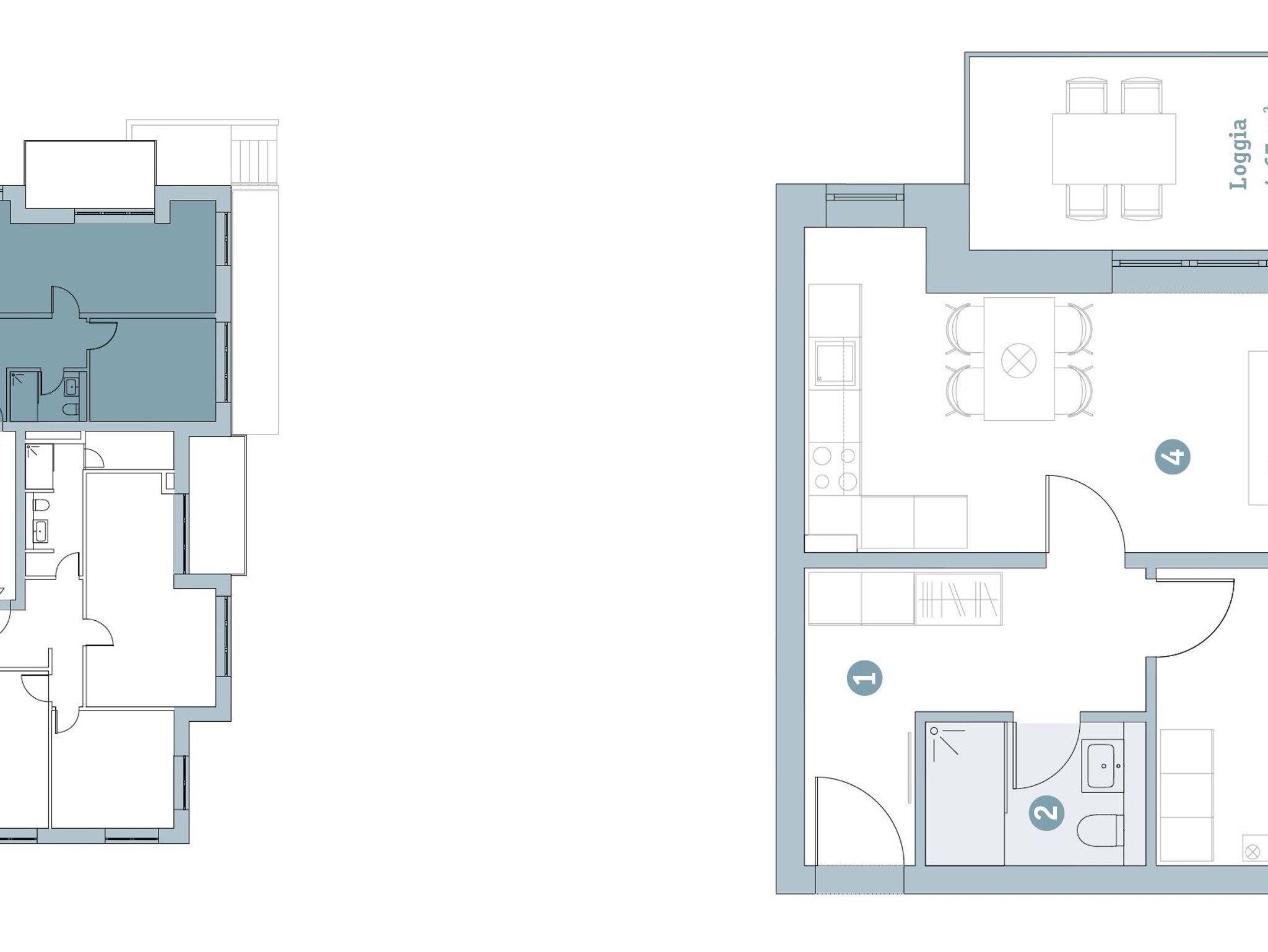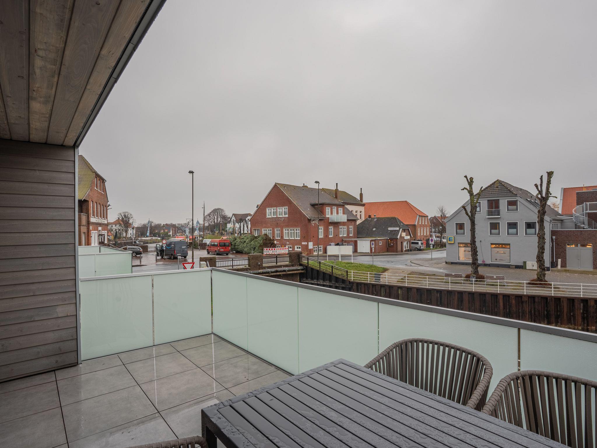 Die Ferienwohnung im Obergeschoss überzeugt auf rund 57m² mit einem hellen, offenen Wohn- und Essbereich und vollausgestatteter Küche. Von der Loggia genießen Sie einen herrlichen Blick auf die Harle und auf den Museumshafen.