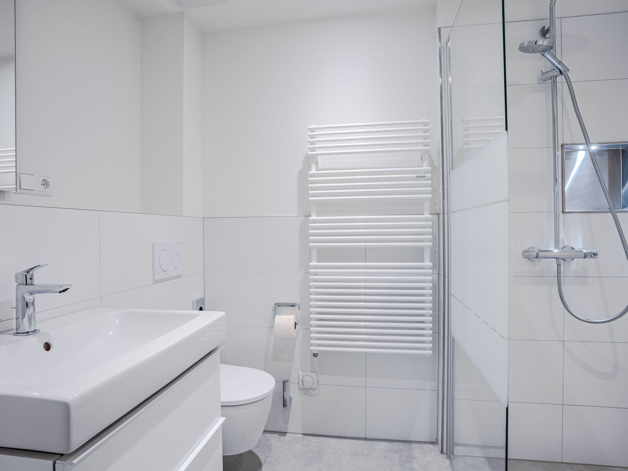 Das Schlafzimmer mit einem Boxspringbett (180x200 cm) und TV sowie das moderne Badezimmer mit Dusche sorgen für einen erholsamen Urlaub.