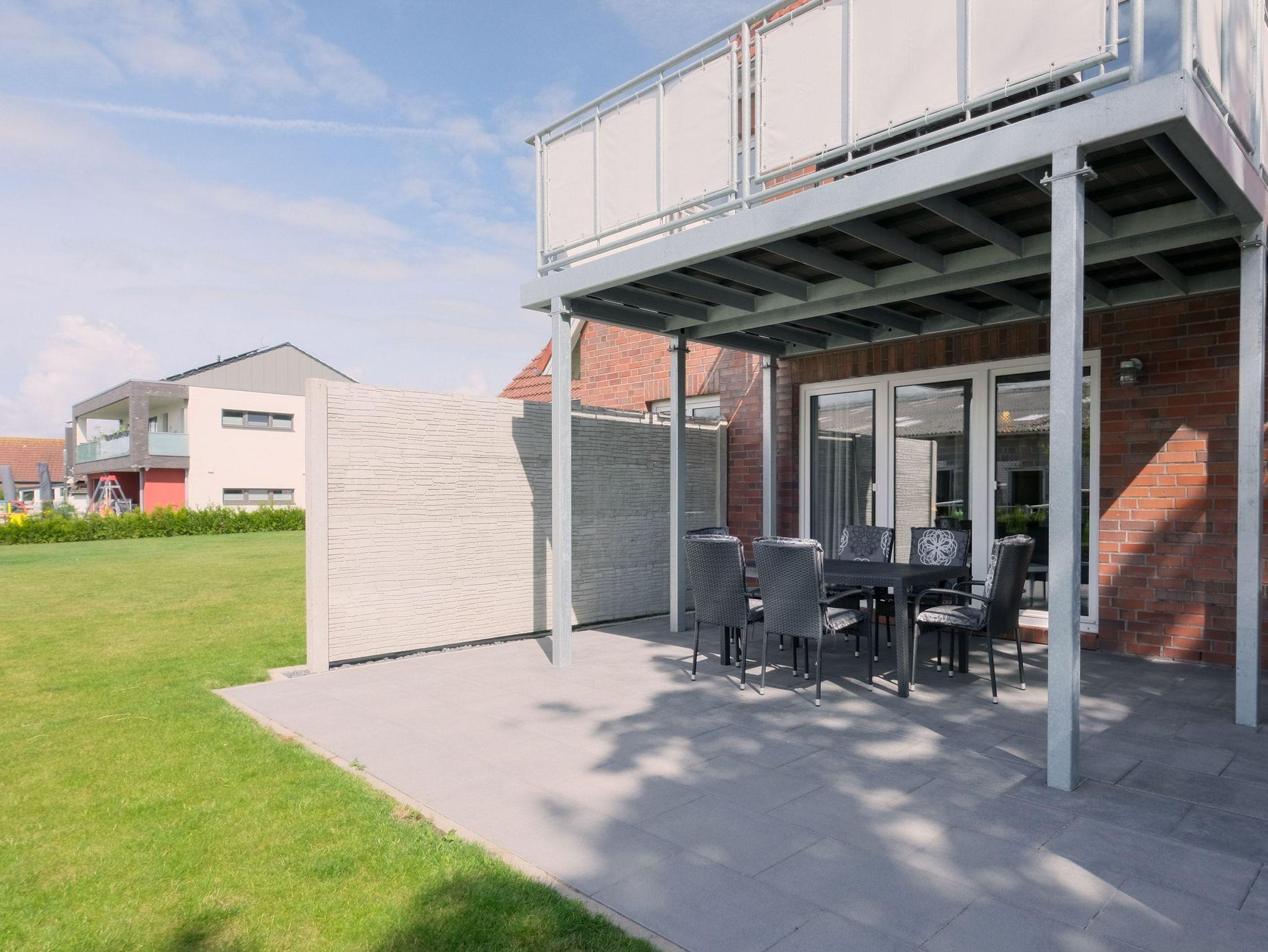 Die große möblierte Süd-Terrasse lädt zum Sonnenbaden ein und bietet durch den darüberliegenden Balkon, einen Sonnenschirm und den seitlichen Sichtschutz ausreichend Privatsphäre.