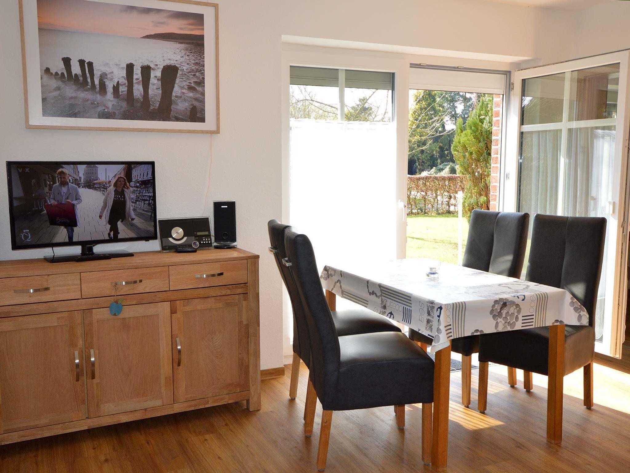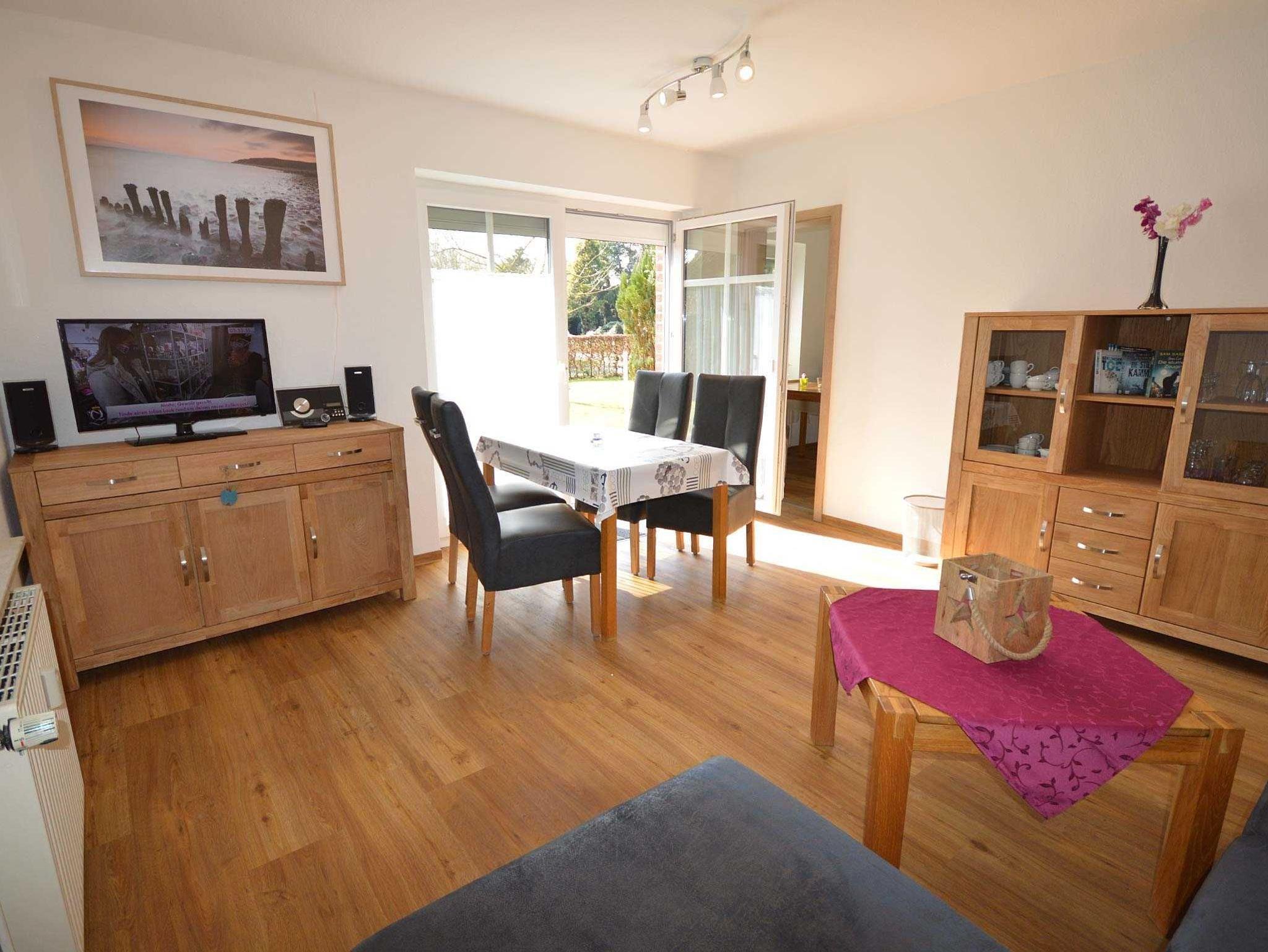 Schöne helle und gemütliche Ferienwohnung für 2-3 Personen. Im Wohn- und Esszimmer befinden sich ein 3er-Sofa( Ottomane) zum Verweilen vor dem Flachbildschirm und der Hifi-Anlage, sowie die Essecke zum Frühstücken oder Mittagessen.