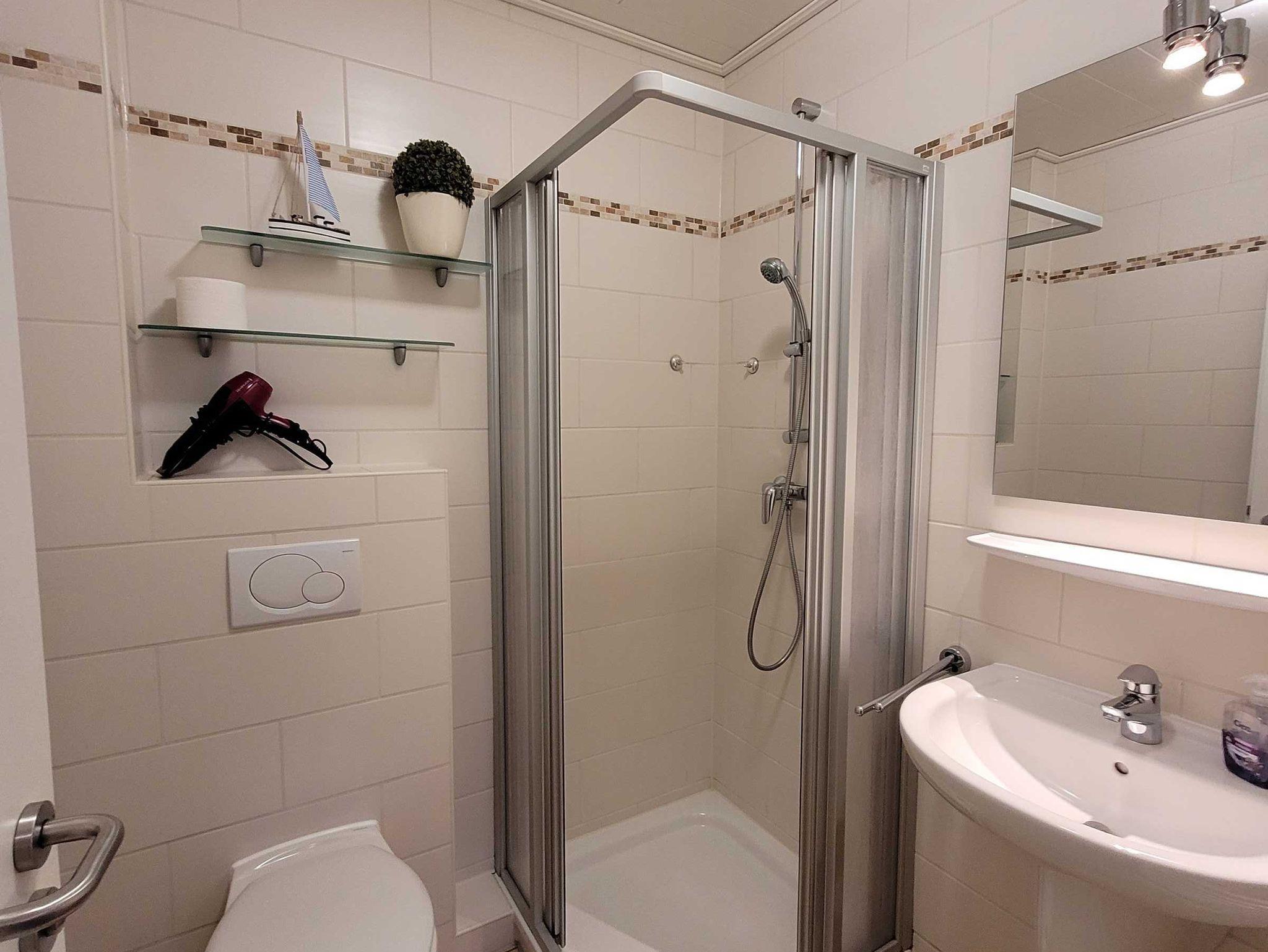 Dusche, WC, Handtücher, Haartrockner und Toilettenpapier