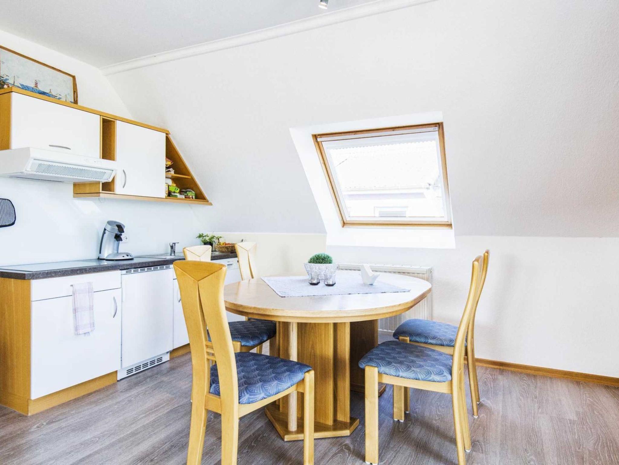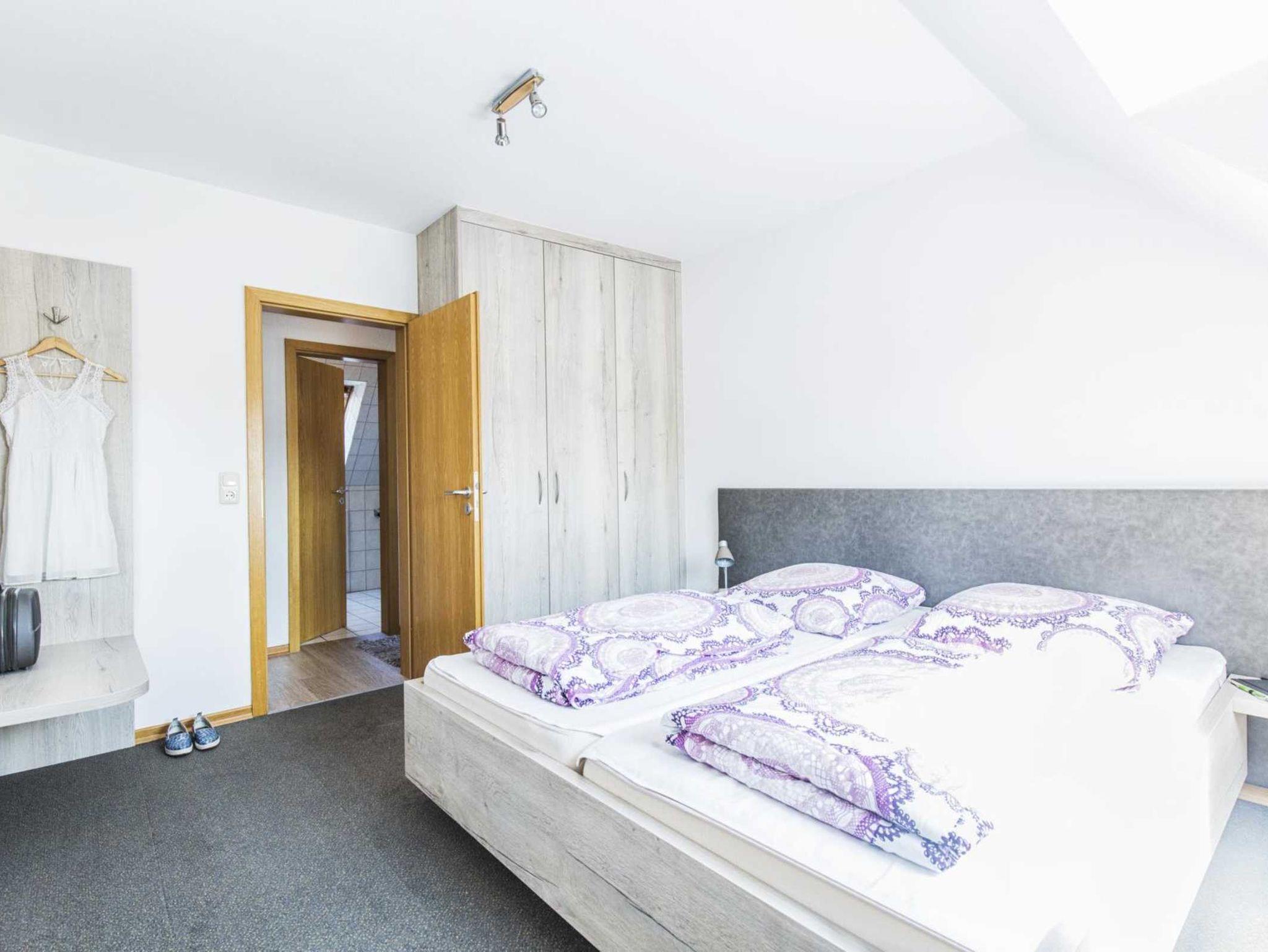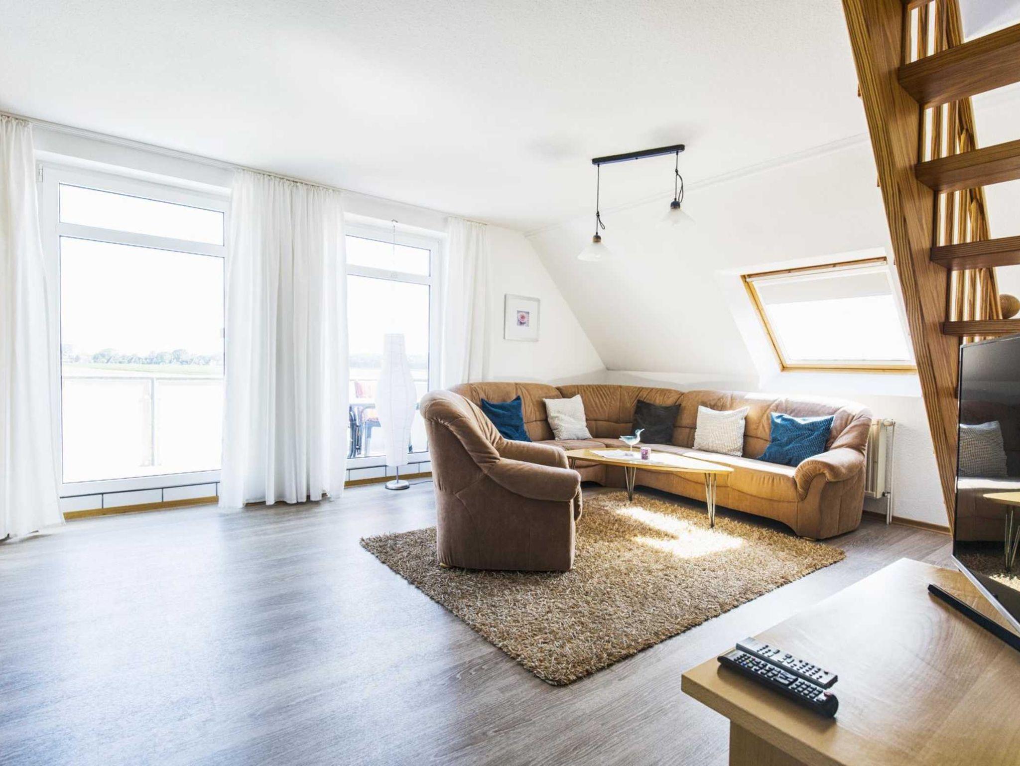 Komfortable Ferienwohnung, erstreckt sich über zwei Etagen, 3 Schlafräume ( Bettwäsche und Handtücher bitte mitbringen ), großes Wohnzimmer mit Essbereich, SAT-TV, komplett eingerichtete Küchenzeile mit Spülmaschine und Mikrowelle, Bad, Diele und Balkon. Kinderbett und Hochstuhl vorhanden.