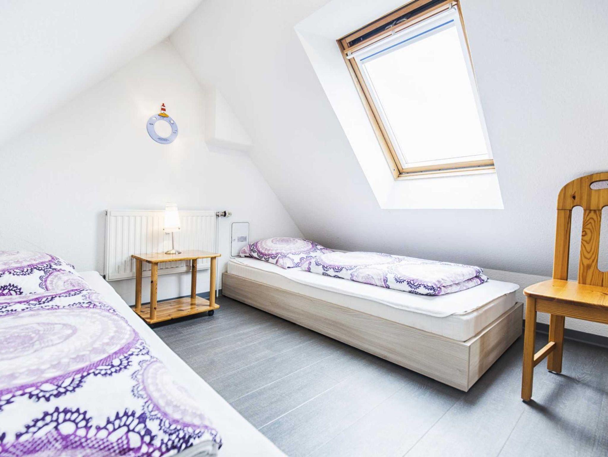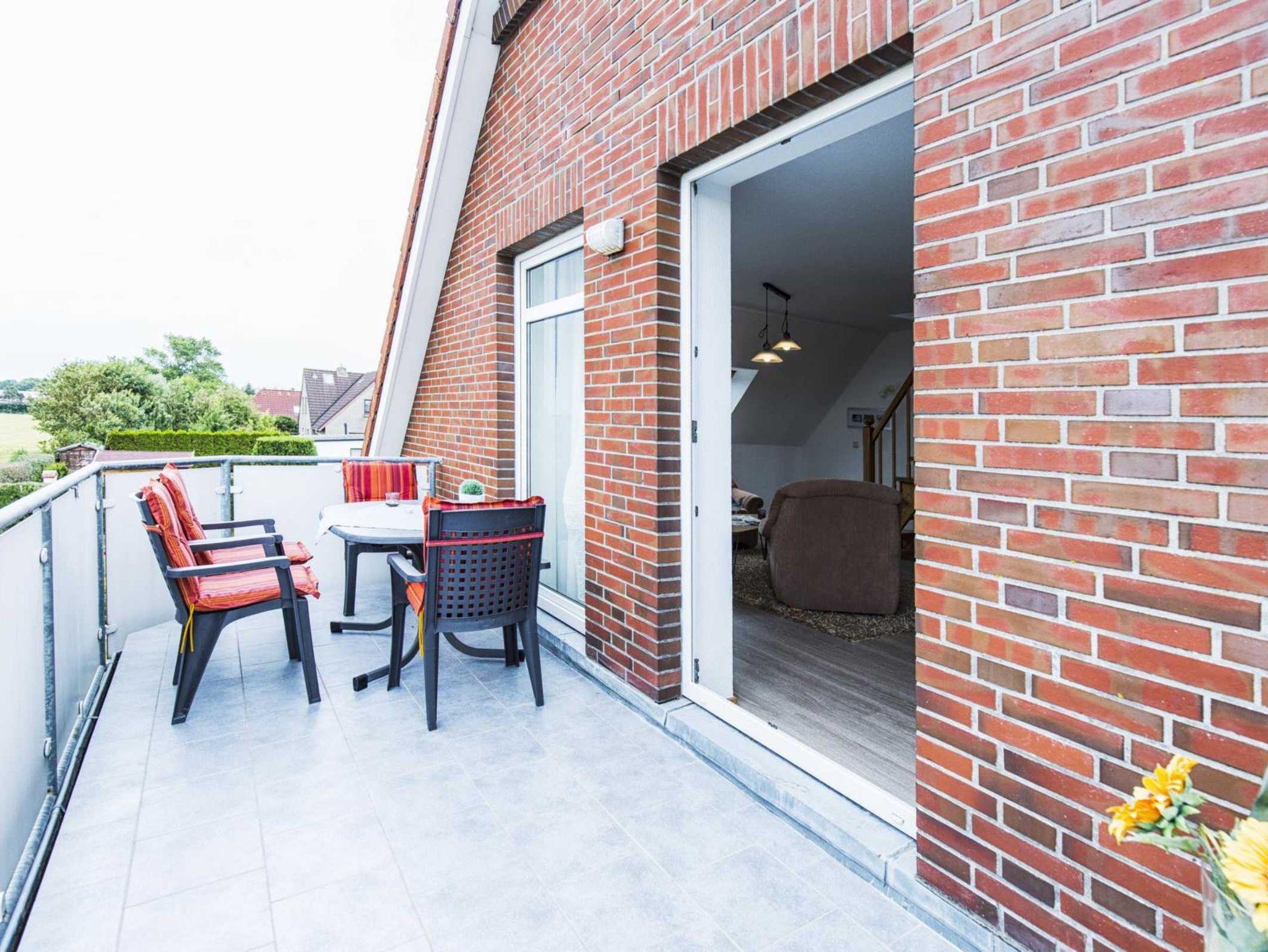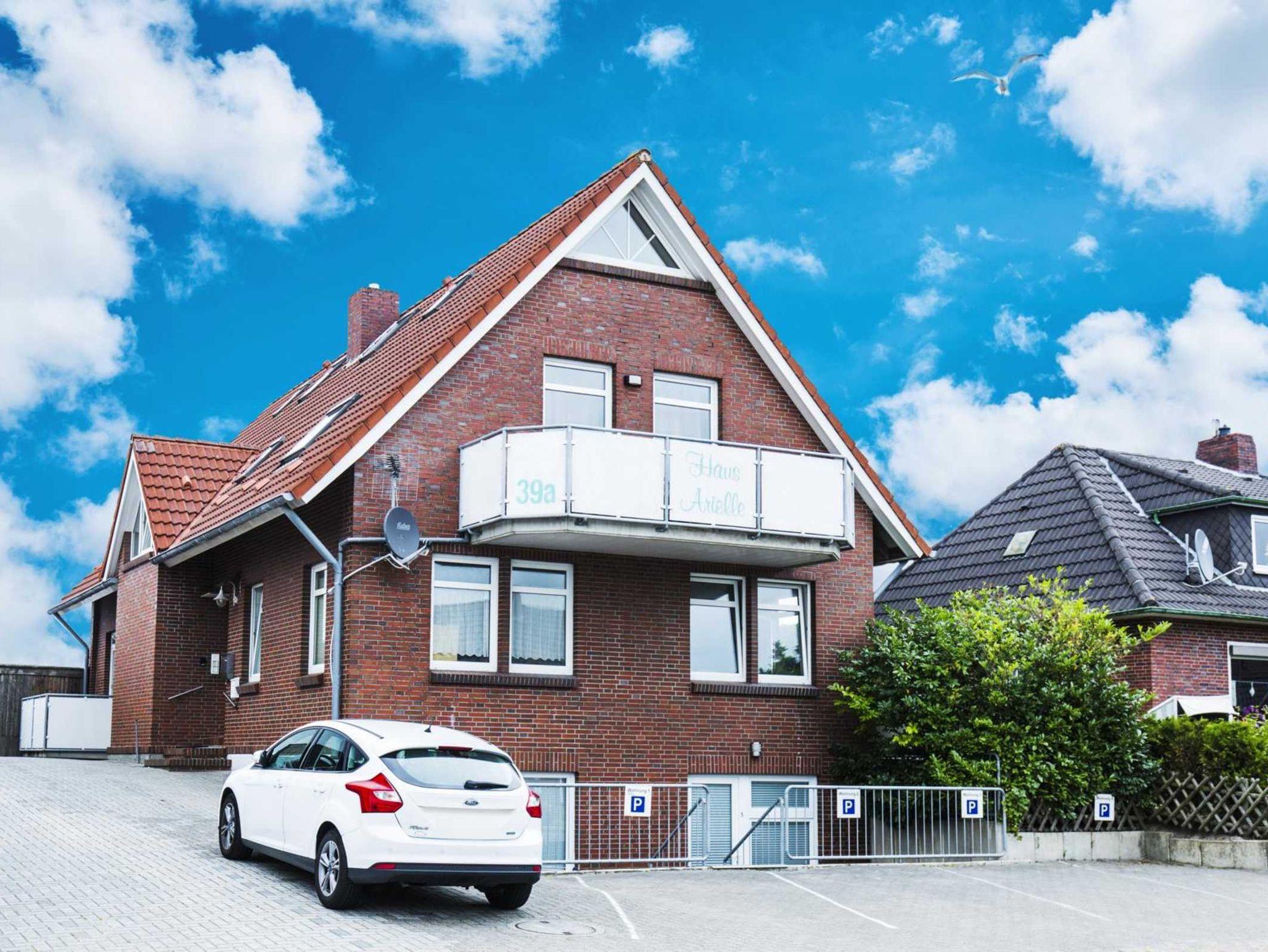 Ferienhaus mit 4 Ferienwohnungen. Parkplätze direkt am Haus. Komfortable Ferienwohnung für 2-6 Personen. (ca. 63 qm), 3 Schlafzimmer, großes Wohnzimmer mit Essbereich, komplett eingerichtete Küchenzeile mit Spülmaschine und Mikrowelle, Bad, Diele und Balkon mit Gartenmöbeln. Kinderbett und Hochstuhl vorhanden. Strandkorb am Strand von Harlesiel kostenlos. Kostenloses WLan.