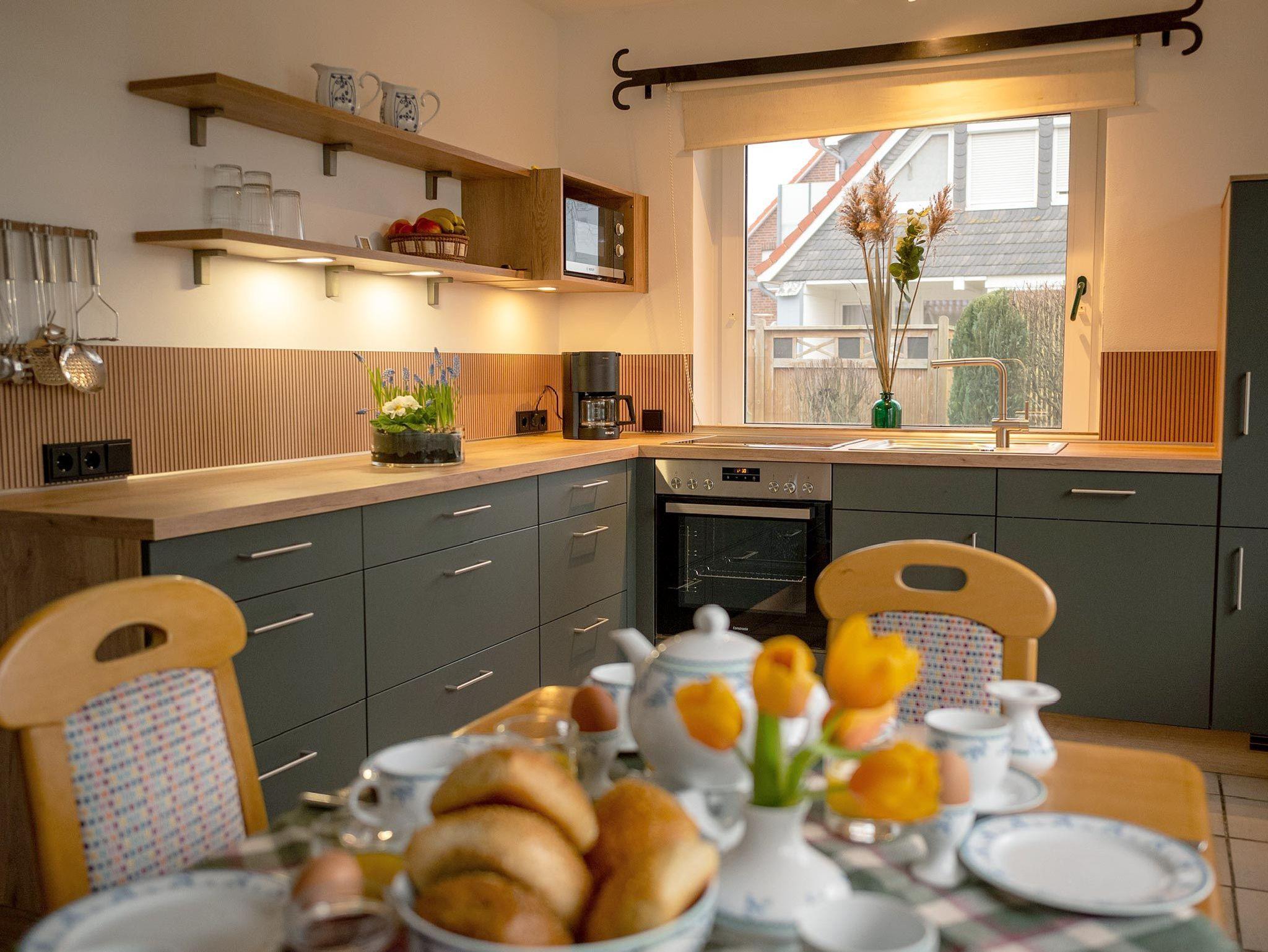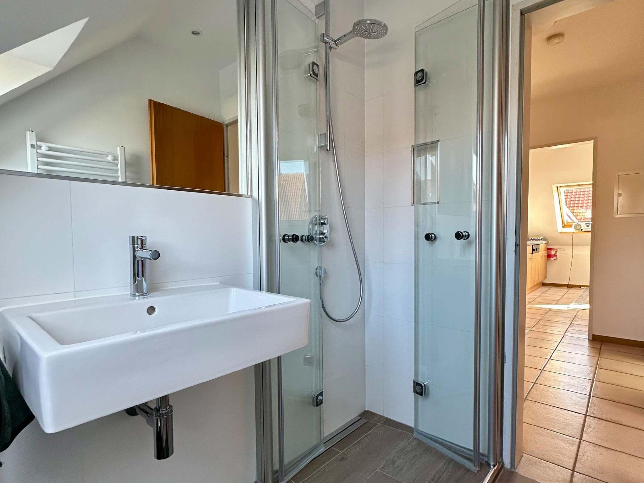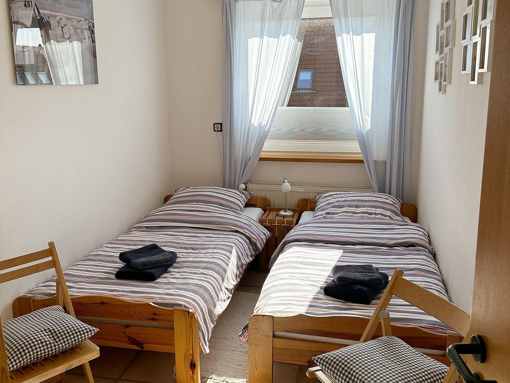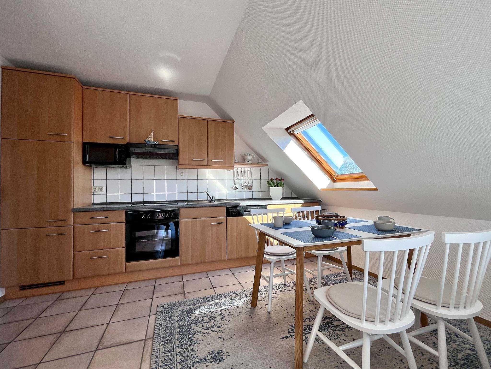 Diese Ferienwohnung im Obergeschoss besteht aus einem Wohnzimmer mit Essbereich und Küchenzeile mit Geschirrspüler. Weiter befindet sich in der Wohnung ein Elternschlafzimmer mit Zustellmöglichkeit für ein Kinderbett, Kinderzimmer mit Einzelbetten und ein Duschbad. Gartennutzung auf der Terrasse am Teich.