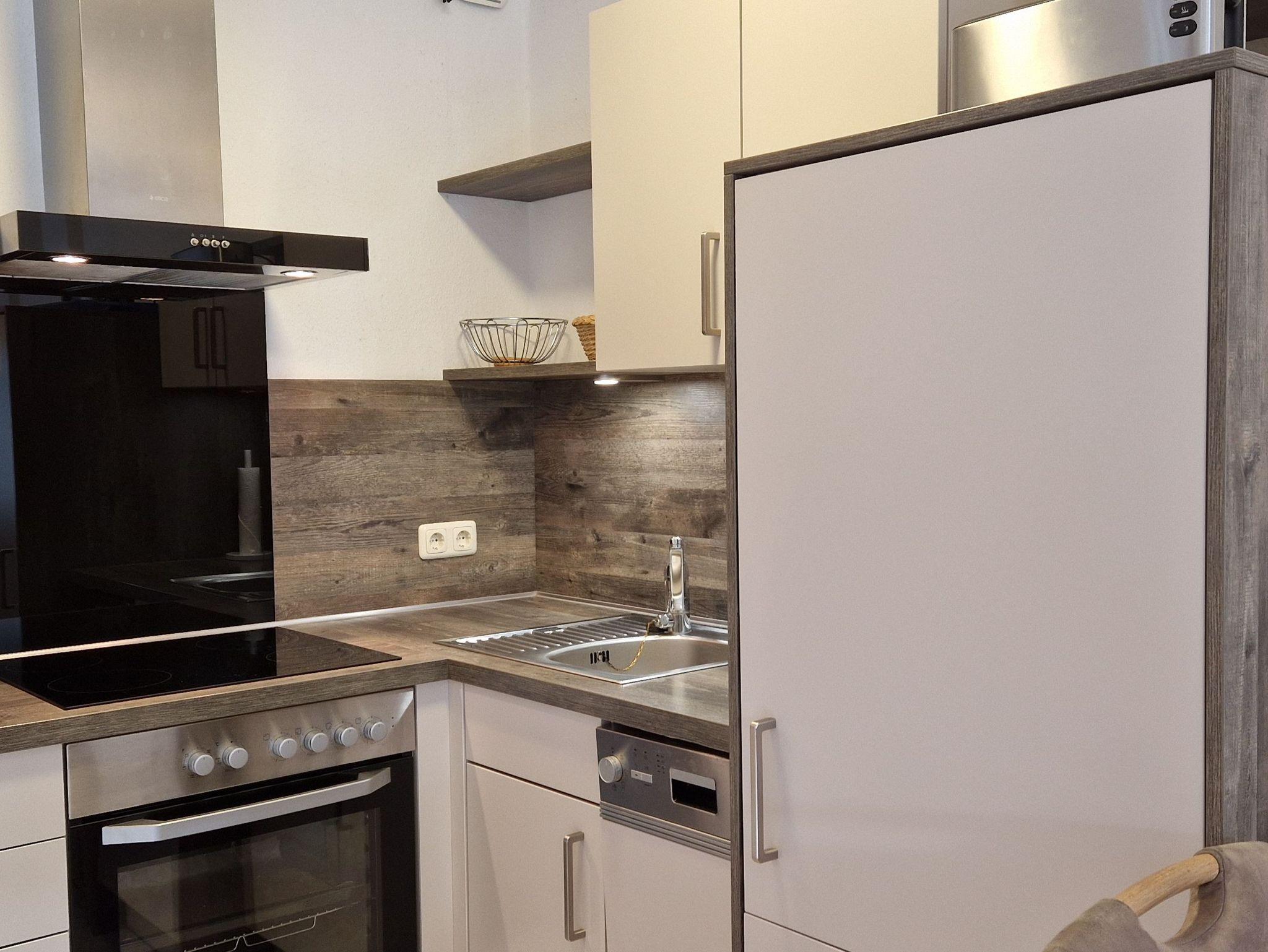 Im neuwertig ausgestatteten Erdgeschoss befindet sich ein großzügiger Wohnraum mit Essbereich und einer offenen Küche, sowie Zugang zur Terrasse und zum Gartenteil. Ein Gäste-WC steht ebenfalls zur Verfügung. Im Obergeschoss befinden sich ein Schlafzimmer mit einem Doppelbett und einem Kindergitterbett, ein Schlafzimmer mit zwei Einzelbetten und ein Duschbad mit WC. Eine offene Holztreppe führt weiter ins ausgebaute, offene Dachstudio mit einem Doppelbett. Das 4-Zimmer-Reihenhaus bietet somit Platz für bis zu 6 Personen und ein Baby/Kleinkind. Des Weiteren sind Verdunkelungsrollos in den Schlafzimmern vorhanden.