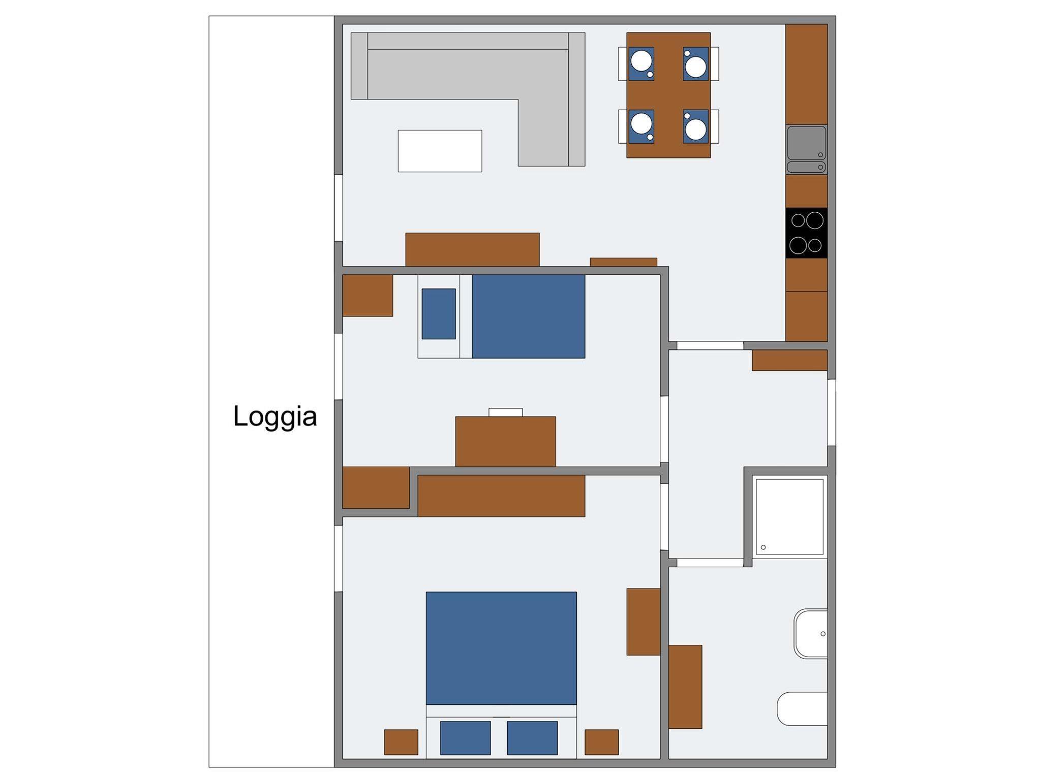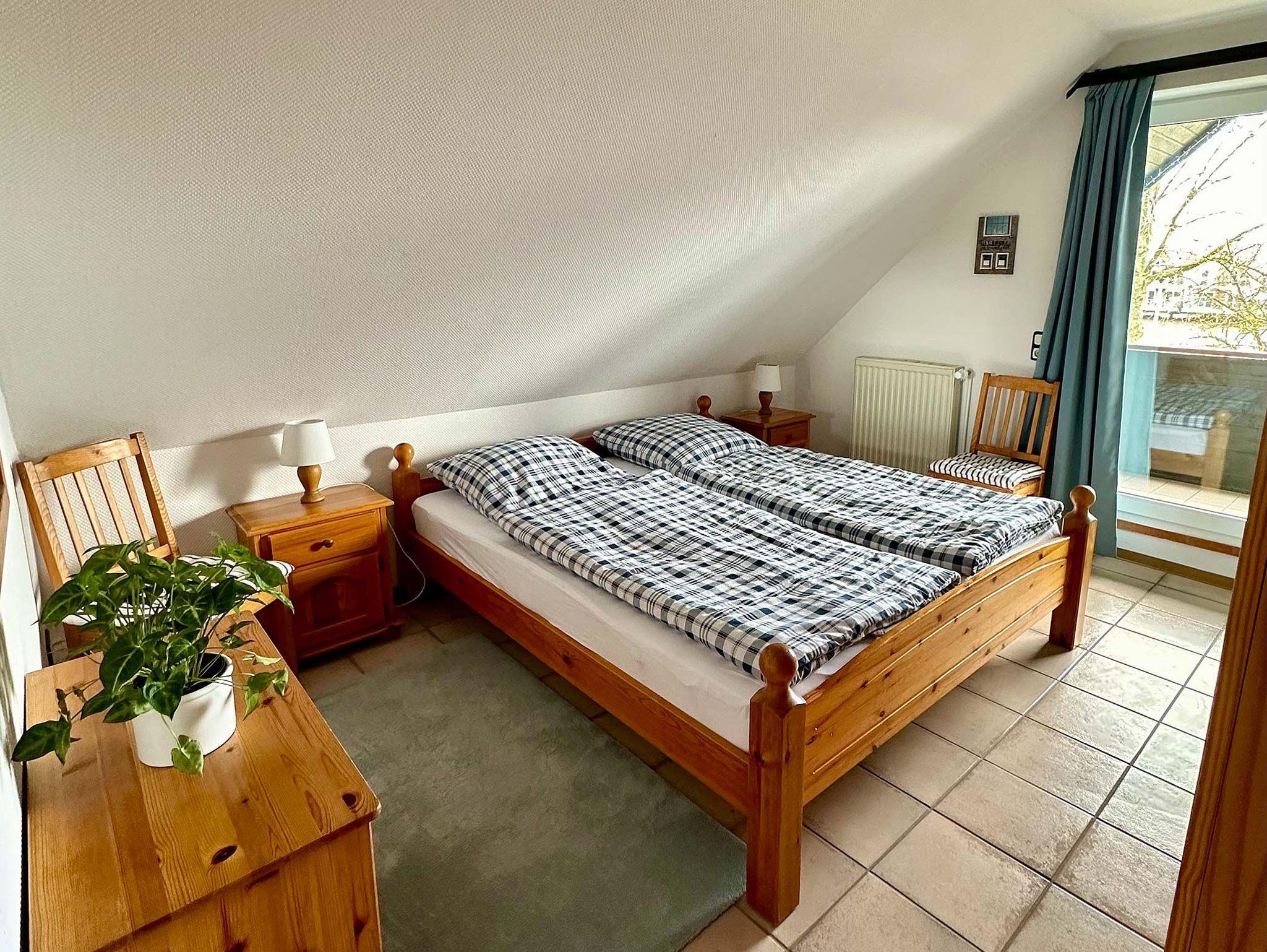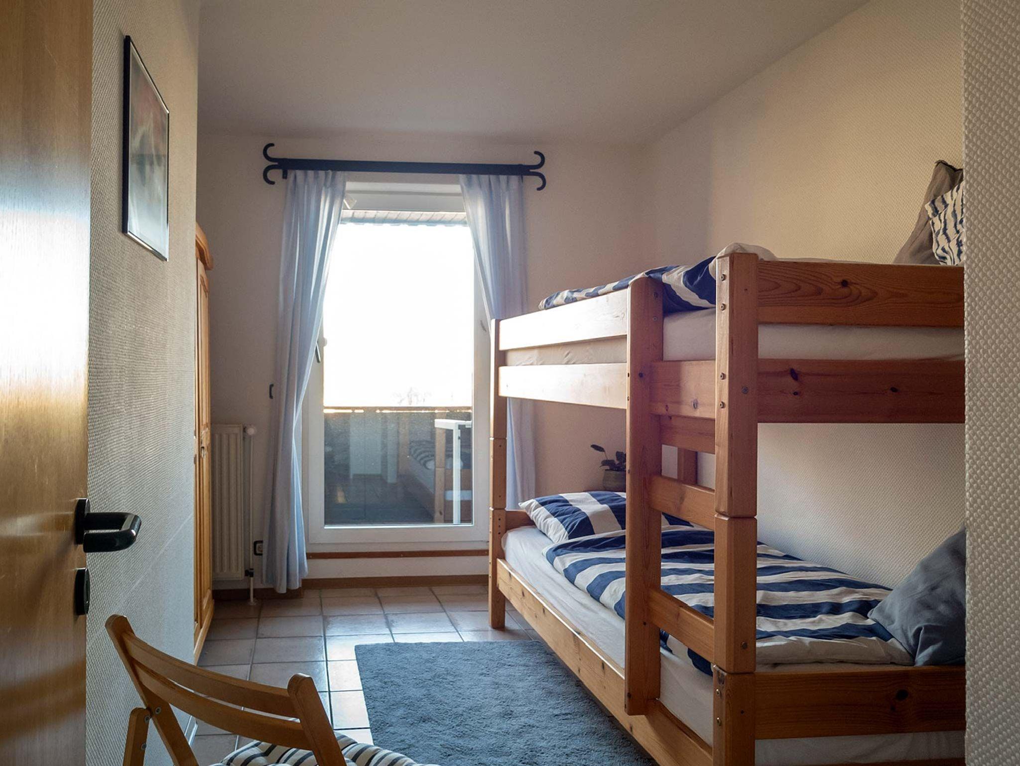 Diese Ferienwohnung im Obergeschoss besteht aus einem Wohnzimmer mit Essbereich und Küchenzeile mit Geschirrspüler. Weiter befindet sich in der Wohnung ein Elternschlafzimmer mit Zustellmöglichkeit für ein Kinderbett, Kinderzimmer mit Etagenbett und ein Duschbad. Eine große Loggia mit Sommermöbeln erstreckt sich über die gesamte Hausfront mit Blick auf den Yachthafen.