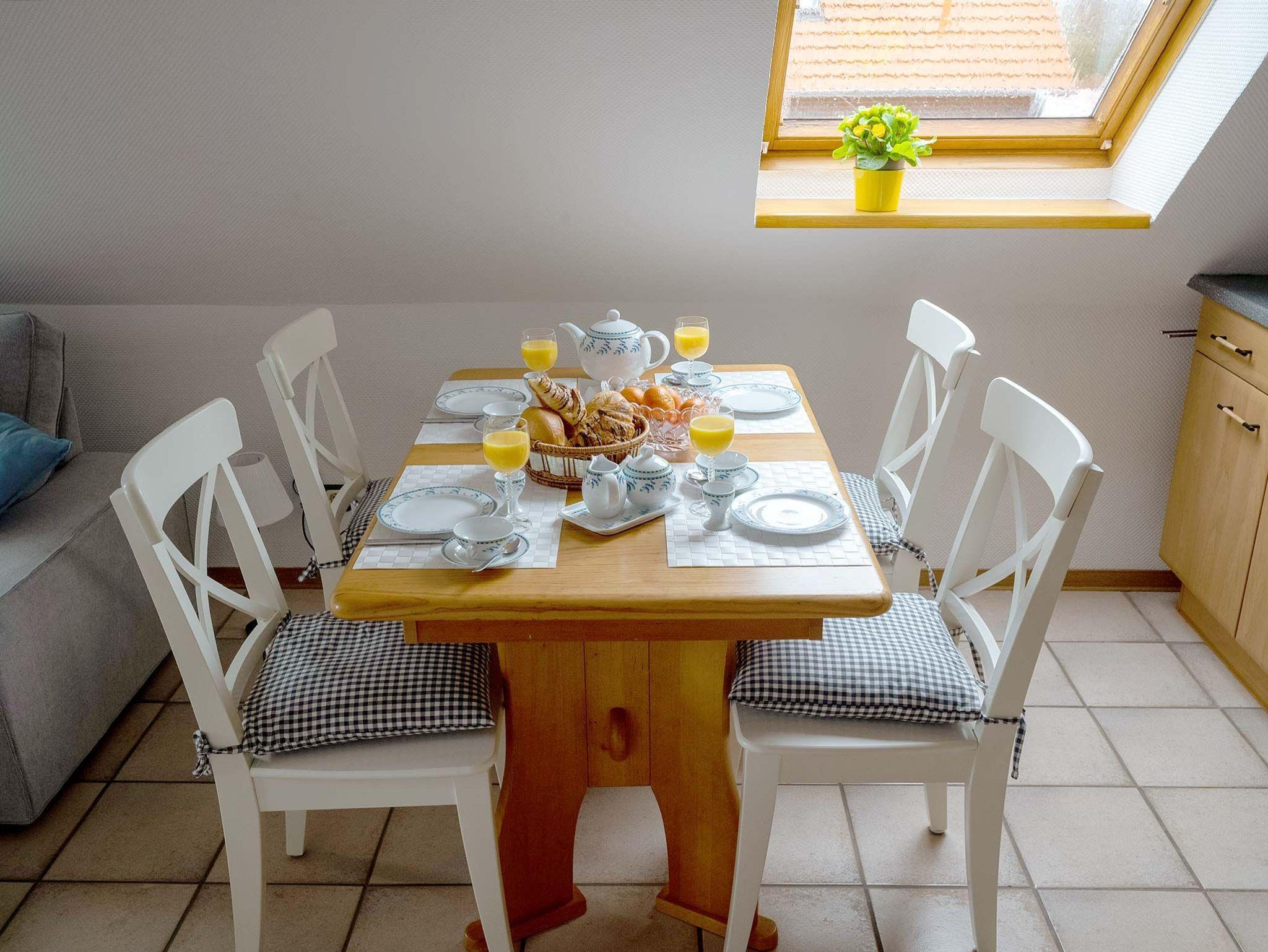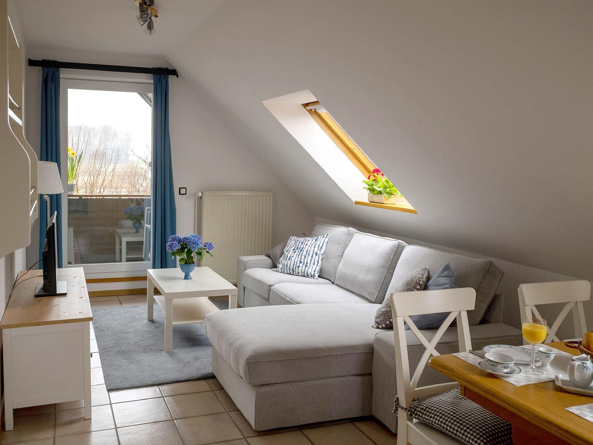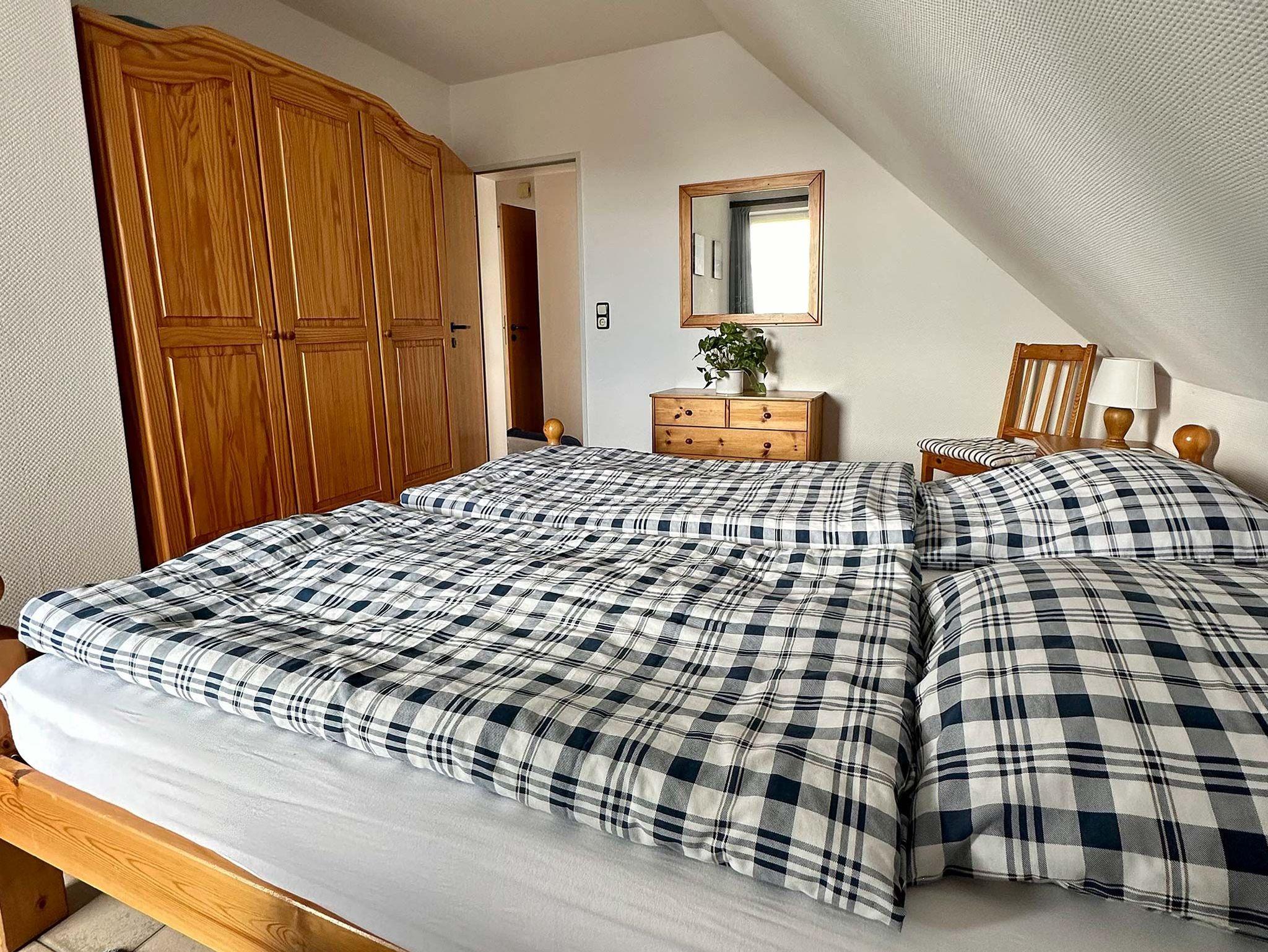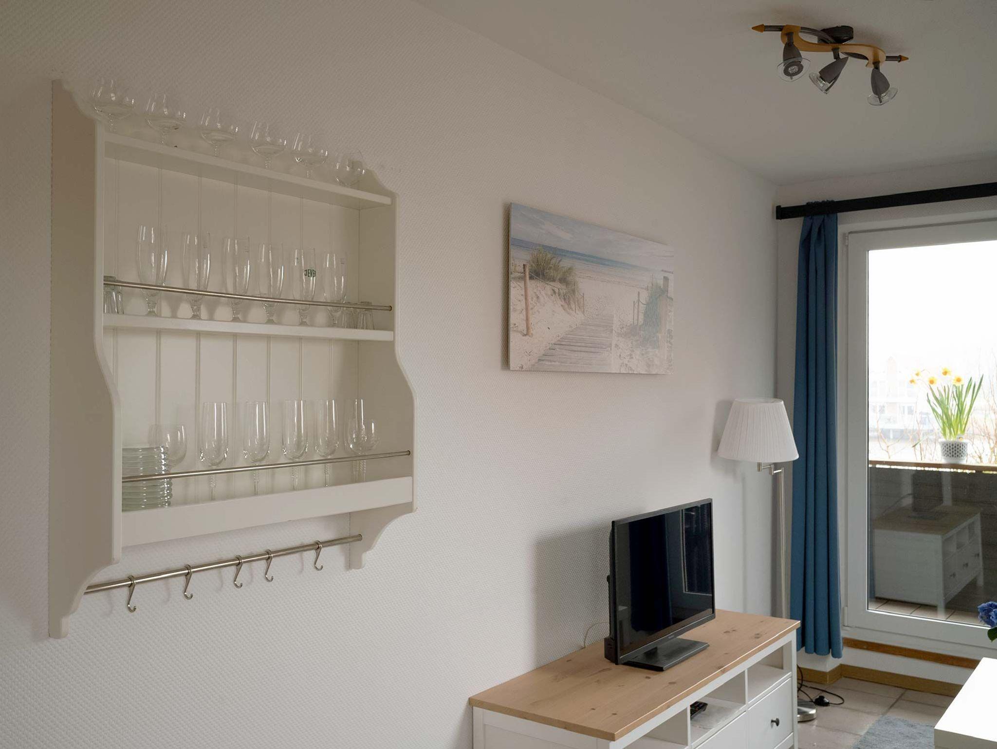 Diese Ferienwohnung im Obergeschoss besteht aus einem Wohnzimmer mit Essbereich und Küchenzeile mit Geschirrspüler. Weiter befindet sich in der Wohnung ein Elternschlafzimmer mit Zustellmöglichkeit für ein Kinderbett, Kinderzimmer mit Etagenbett und ein Duschbad. Eine große Loggia mit Sommermöbeln erstreckt sich über die gesamte Hausfront mit Blick auf den Yachthafen.