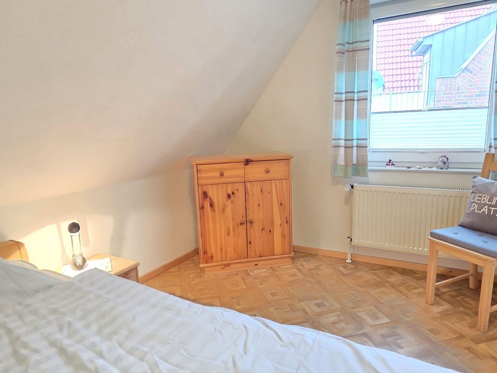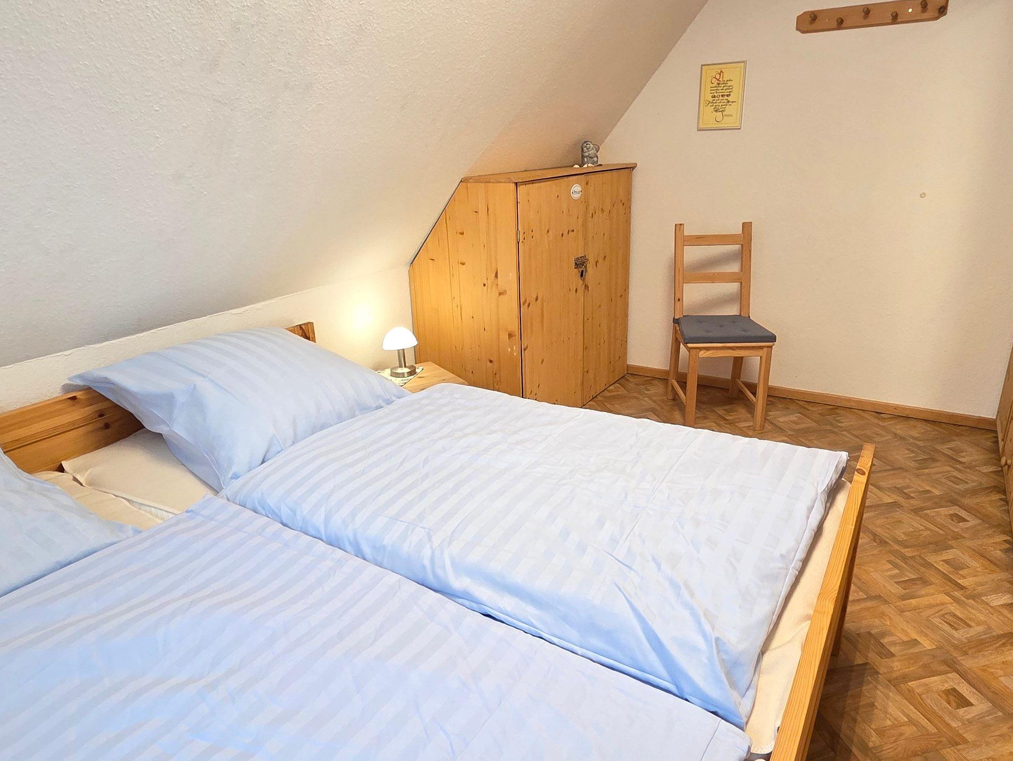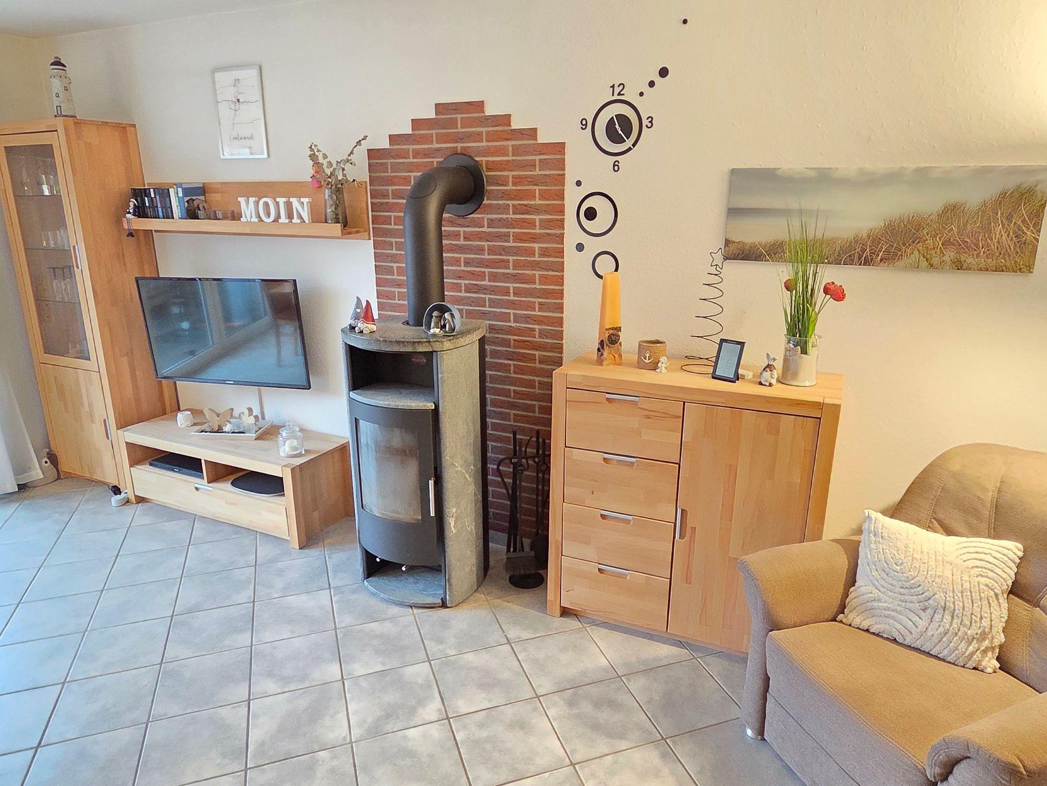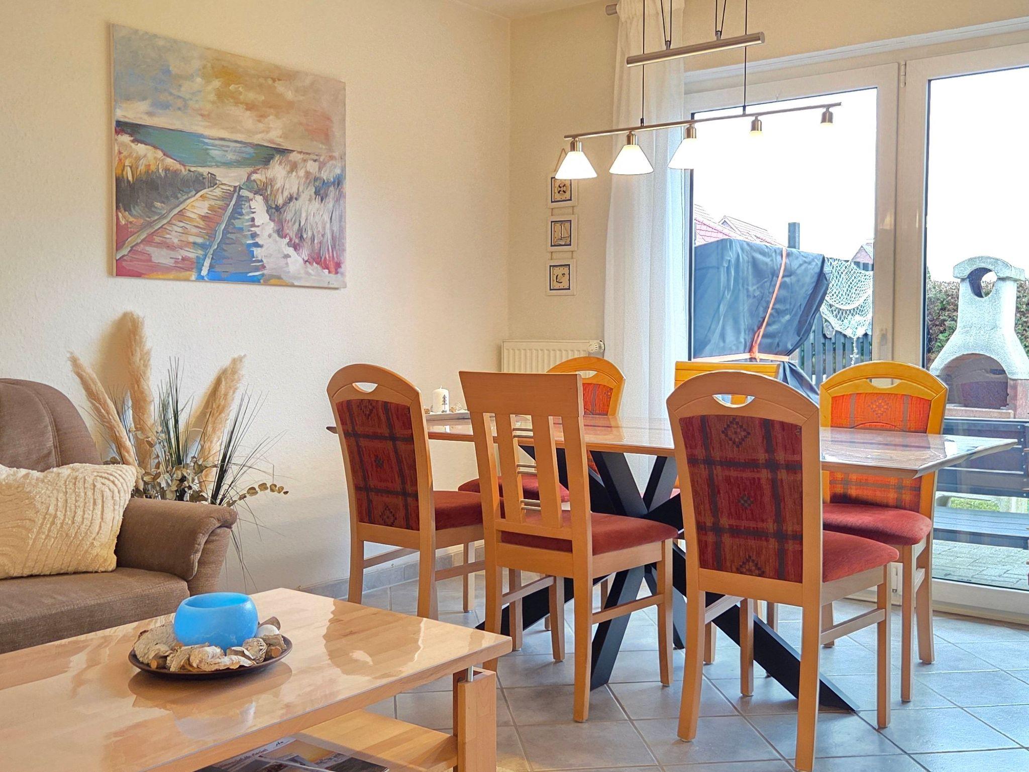 Das 4-Zimmer-Reihenendhaus bietet im Erdgeschoss ein gemütliches Wohnzimmer mit Kaminofen und Essbereich, eine separate Küche mit kleinem Esstisch, sowie ein Gäste-WC. Über eine offene Holztreppe gelangen Sie ins Obergeschoss. Hier befinden sich zwei Schlafzimmer und ein geräumiges Badezimmer mit Dusche und WC. Im ausgebauten Dachgeschoss ist ein weiteres Schlafzimmer vorhanden. Alle Fenster sind mit Rollläden, die Böden mit Fliesen bzw. PVC ausgestattet. Des Weiteren verfügt das Ferienhaus über 2 Fahrräder sowie einen Bollerwagen, auch WLAN kann kostenfrei genutzt werden.