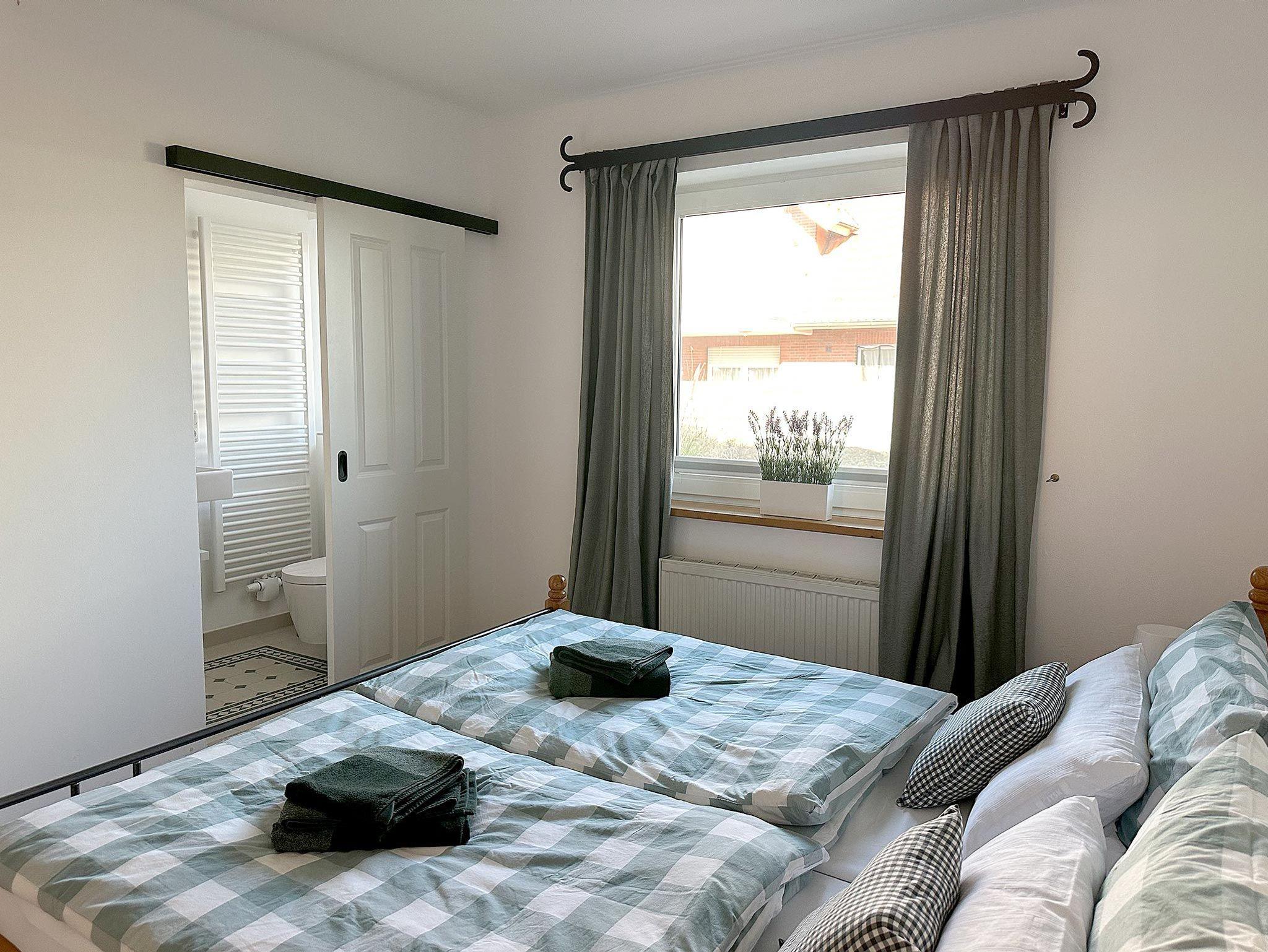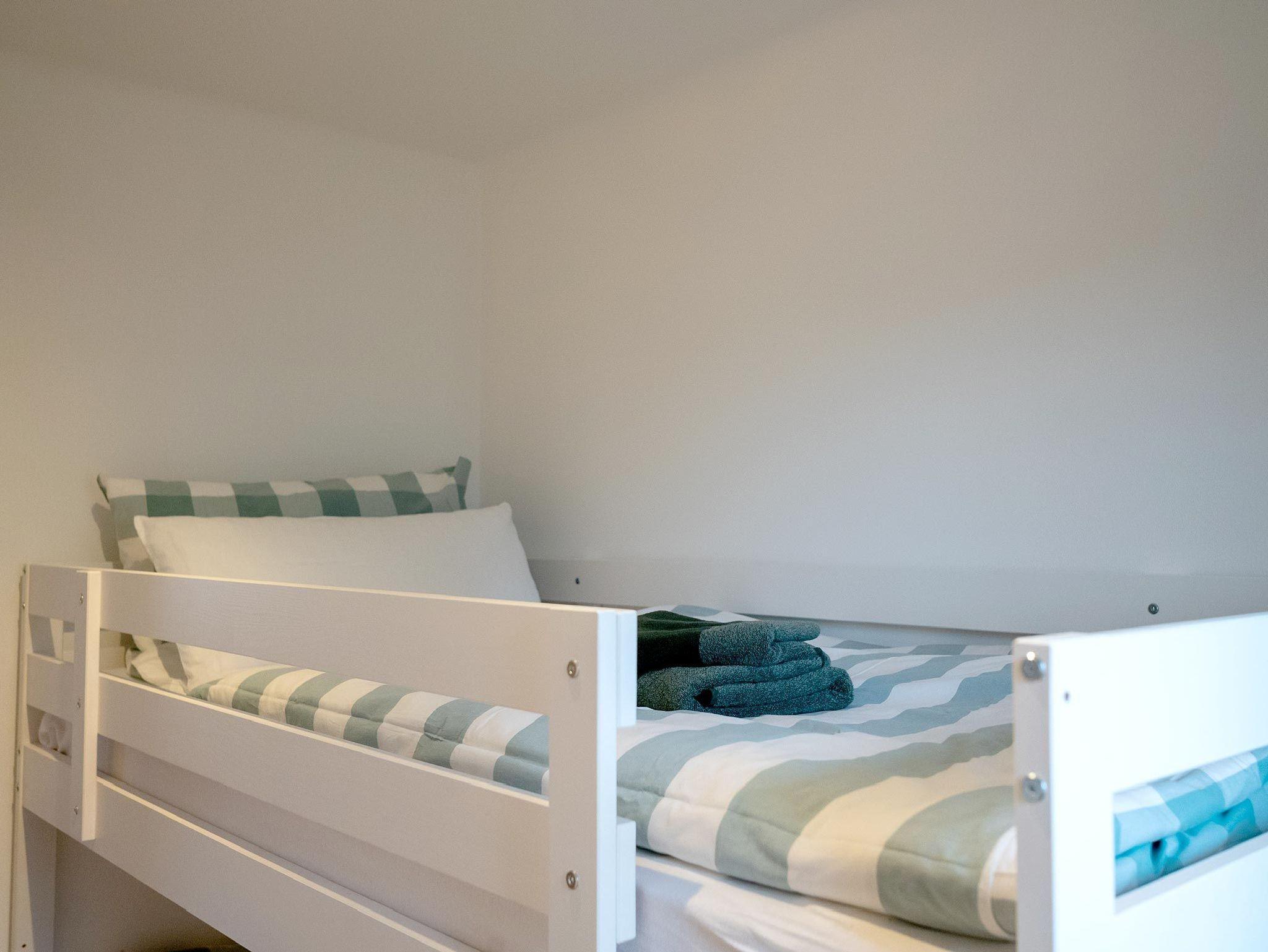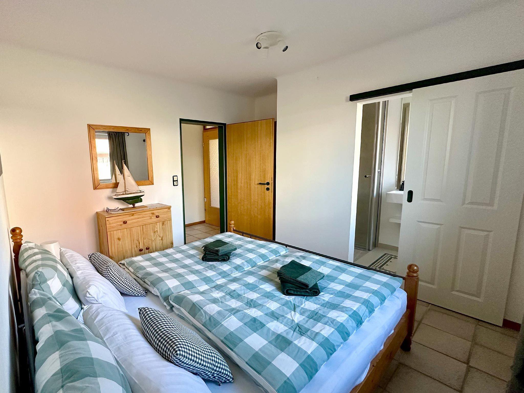 Diese großzügige Ferienwohnung im Erdgeschoss besteht aus einer geräumigen Küche mit Geschirrspüler, einem großen Wohnzimmer, Terrasse, Diele, Elternschlafzimmer mit Bad (Badewanne, Dusche/WC, Bidet) sowie einem 2. Schlafzimmer mit Bad (Dusche/WC) und einem Schlafzimmer mit Etagenbett (2x1 m). Babybett möglich. Die ganze Wohnung ist mit Fußbodenfliesen ausgestattet.
