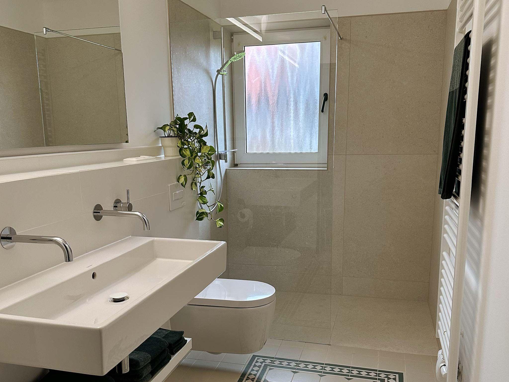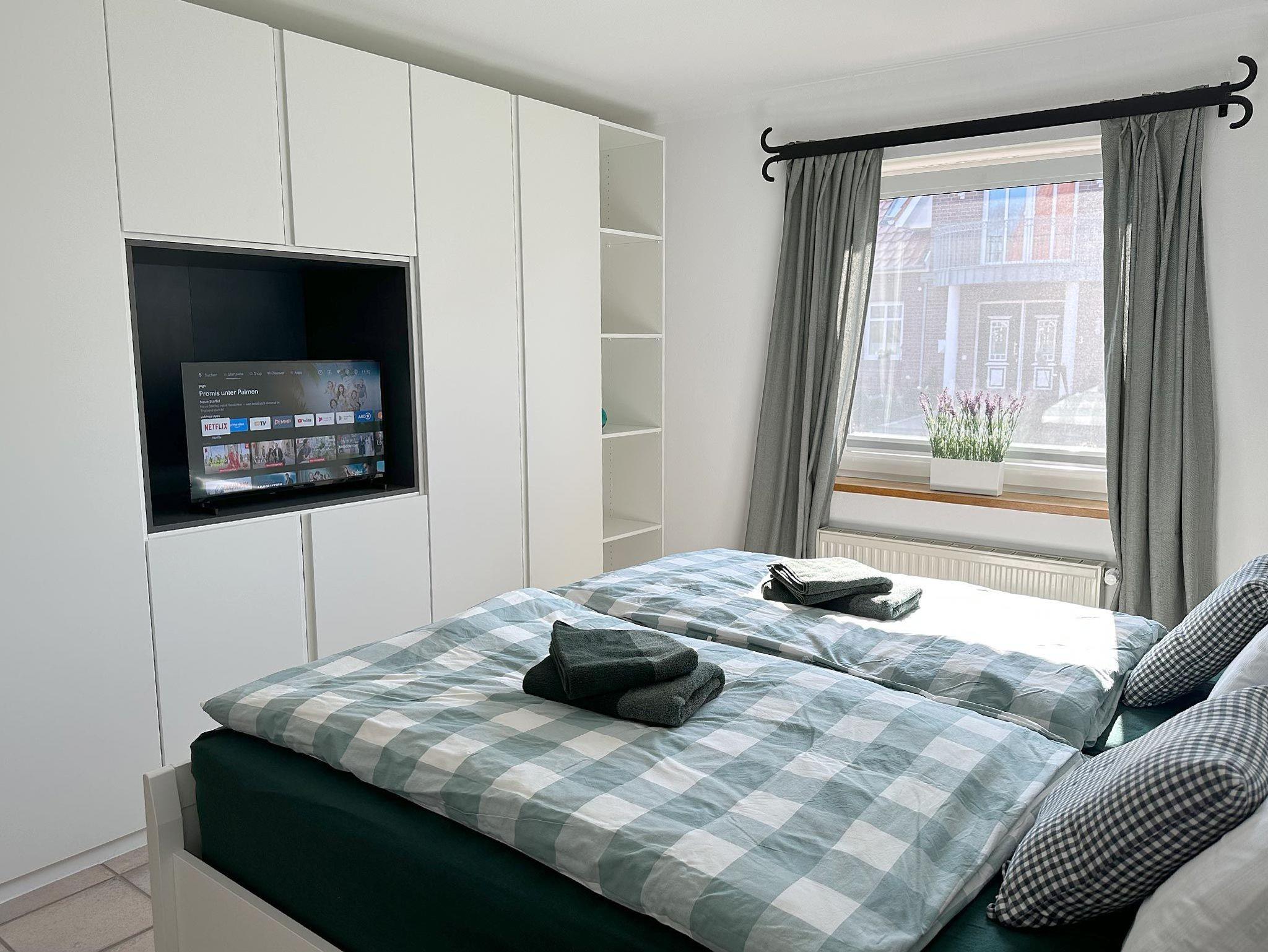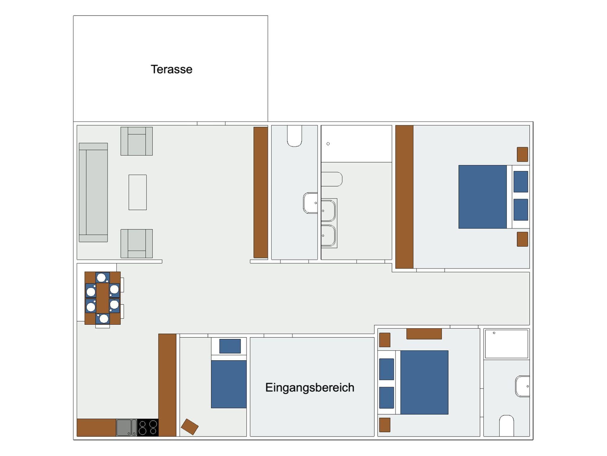 Diese großzügige Ferienwohnung im Erdgeschoss besteht aus einer geräumigen Küche mit Geschirrspüler, einem großen Wohnzimmer, Terrasse, Diele, Elternschlafzimmer mit Bad (Badewanne, Dusche/WC, Bidet) sowie einem 2. Schlafzimmer mit Bad (Dusche/WC) und einem Schlafzimmer mit Etagenbett (2x1 m). Babybett möglich. Die ganze Wohnung ist mit Fußbodenfliesen ausgestattet.