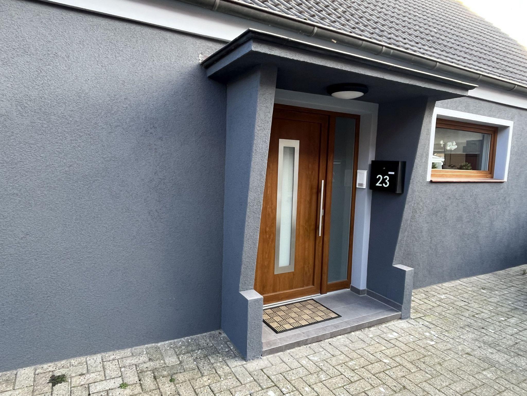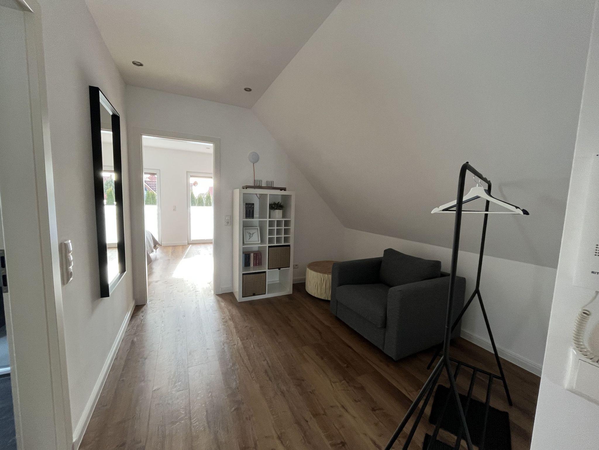 Neue, moderne ca. 60 m² große Nichtraucher-Wohnung im Dachgeschoss eines 2- Familienhauses. 1 Pkw Stellplatz direkt am Haus. Weitere Parkplätze an der Straße nur gegen Gebühr (Parkscheinautomat) oder mit Parkscheibe (max. 4 h). In der Wohnung findet sich eine moderne und dennoch gemütliche Einrichtung. Offene, voll ausgestattete Küche inkl. Ceran-Kochfeld, Backofen, Mikrowelle und Spülmaschine. Ausreichend Besteck, Gläser und Geschirr für 12 Pers. Integrierter Essplatz mit 4 Sitzgelegenheiten (auf Wunsch 1 x Kinderhochstuhl vorhanden). Gemütliches Ecksofa (Schlafsofa ausklappbar für 3. Pers., Liegefläche 1,40 x 2,00 m) im Wohnraum. JBL-Bluetooth Lautsprecher zum Abspielen eigener Musik, Smart TV, Glasfaseranschluss, WLAN kostenlos. 2. Smart TV im Schlafzimmer. Diverse Bücher, Spielesammlung vorhanden.