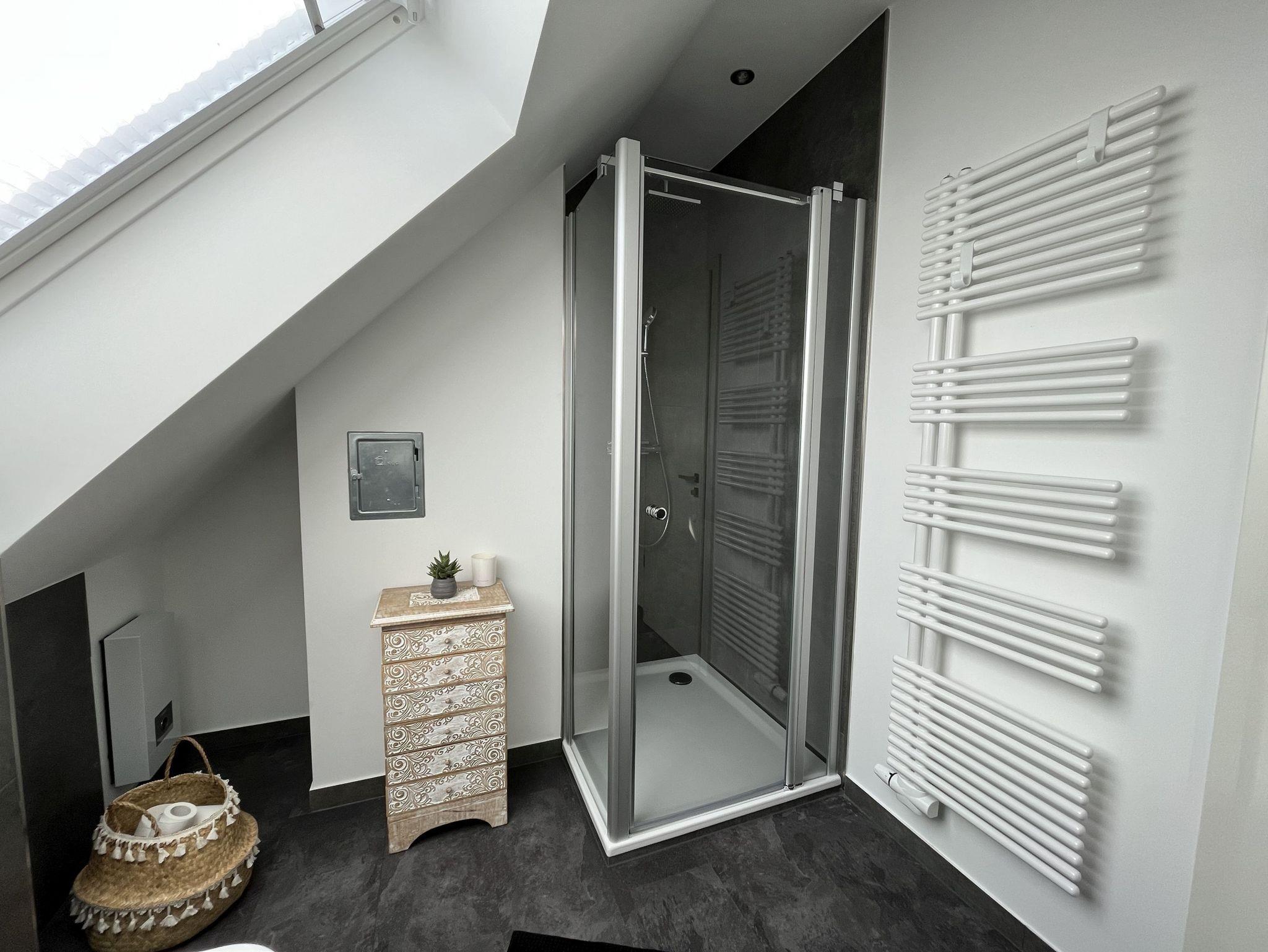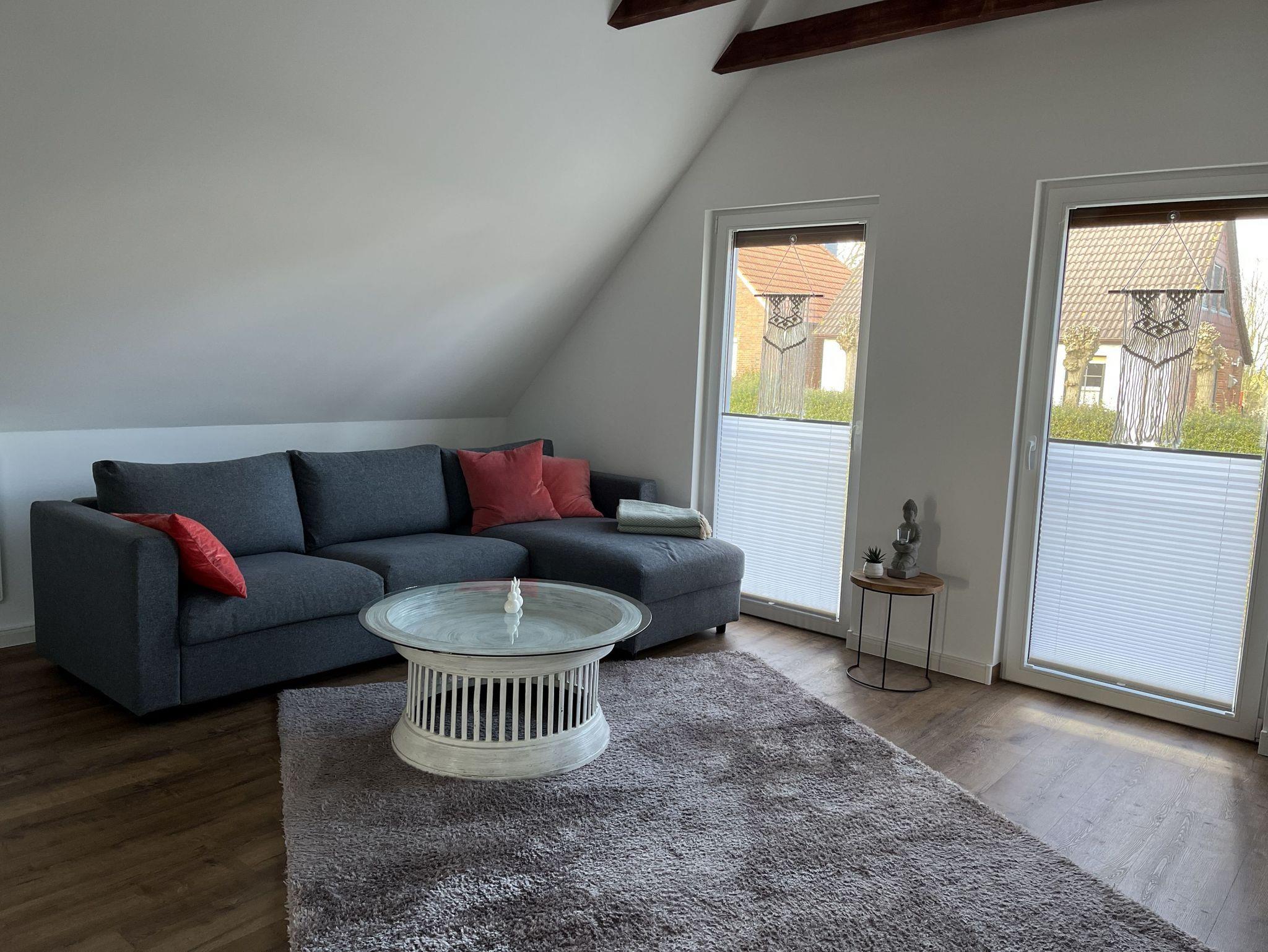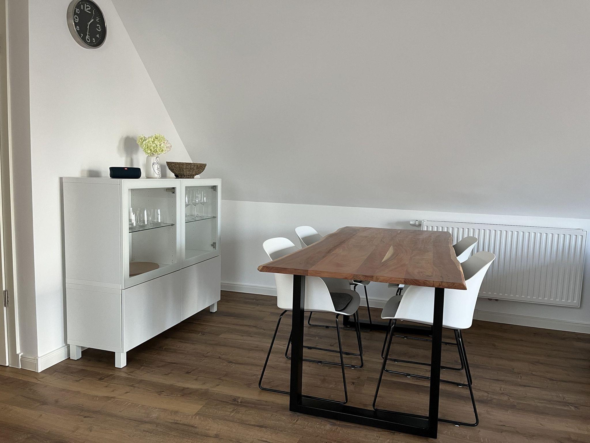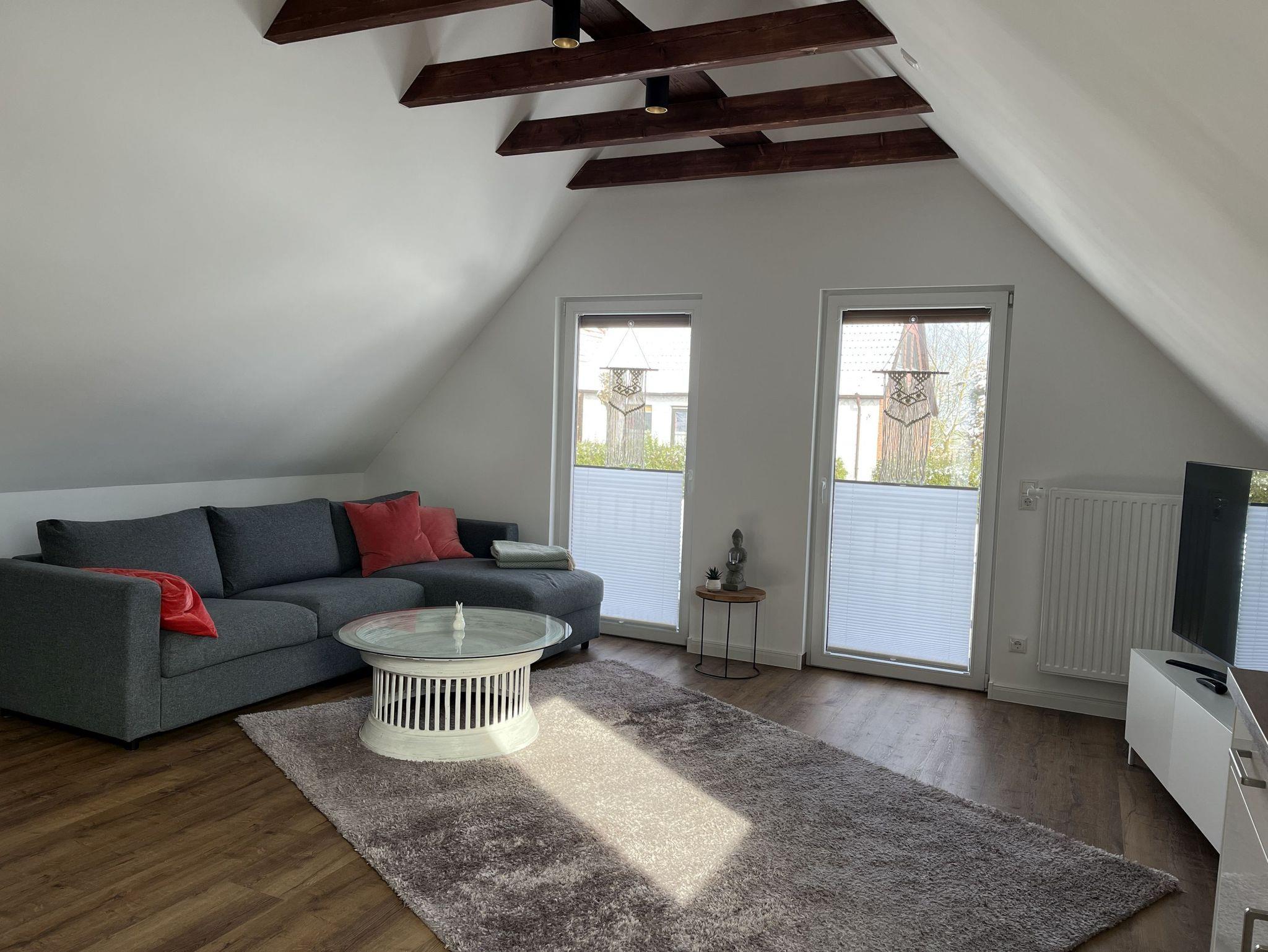 Neue, moderne ca. 60 m² große Nichtraucher-Wohnung im Dachgeschoss eines 2- Familienhauses. 1 Pkw Stellplatz direkt am Haus. Weitere Parkplätze an der Straße nur gegen Gebühr (Parkscheinautomat) oder mit Parkscheibe (max. 4 h). In der Wohnung findet sich eine moderne und dennoch gemütliche Einrichtung. Offene, voll ausgestattete Küche inkl. Ceran-Kochfeld, Backofen, Mikrowelle und Spülmaschine. Ausreichend Besteck, Gläser und Geschirr für 12 Pers. Integrierter Essplatz mit 4 Sitzgelegenheiten (auf Wunsch 1 x Kinderhochstuhl vorhanden). Gemütliches Ecksofa (Schlafsofa ausklappbar für 3. Pers., Liegefläche 1,40 x 2,00 m) im Wohnraum. JBL-Bluetooth Lautsprecher zum Abspielen eigener Musik, Smart TV, Glasfaseranschluss, WLAN kostenlos. Diverse Bücher, Spielesammlung vorhanden.