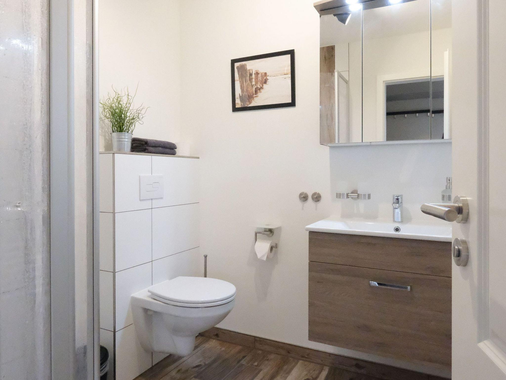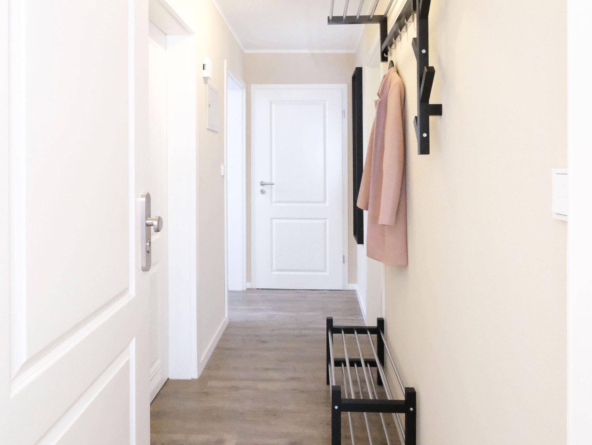 Vom geräumigen Flur mit Garderobe gelangen Sie in das moderne Badezimmer mit WC, Waschtisch, bodengleicher Dusche und Fön.