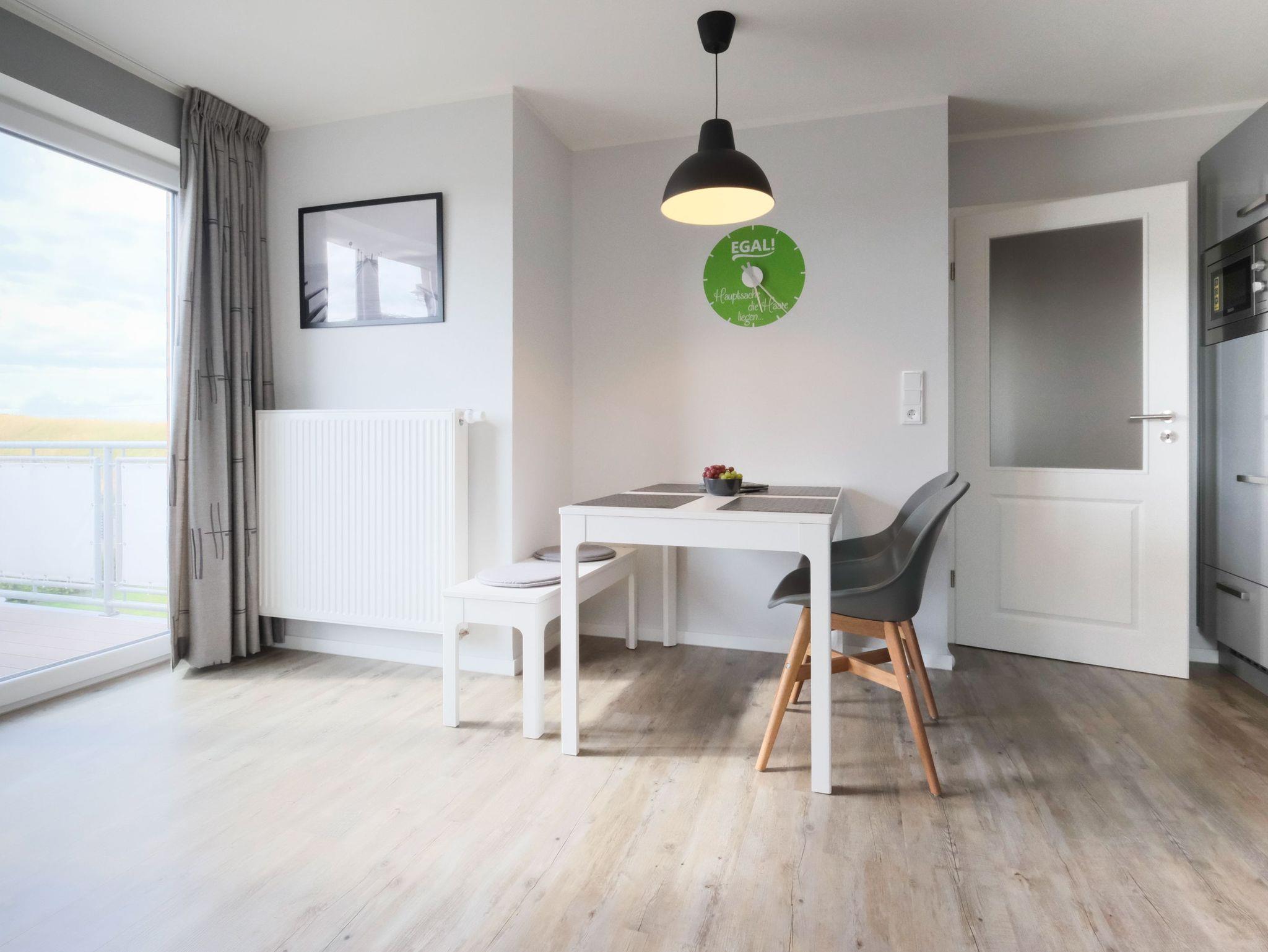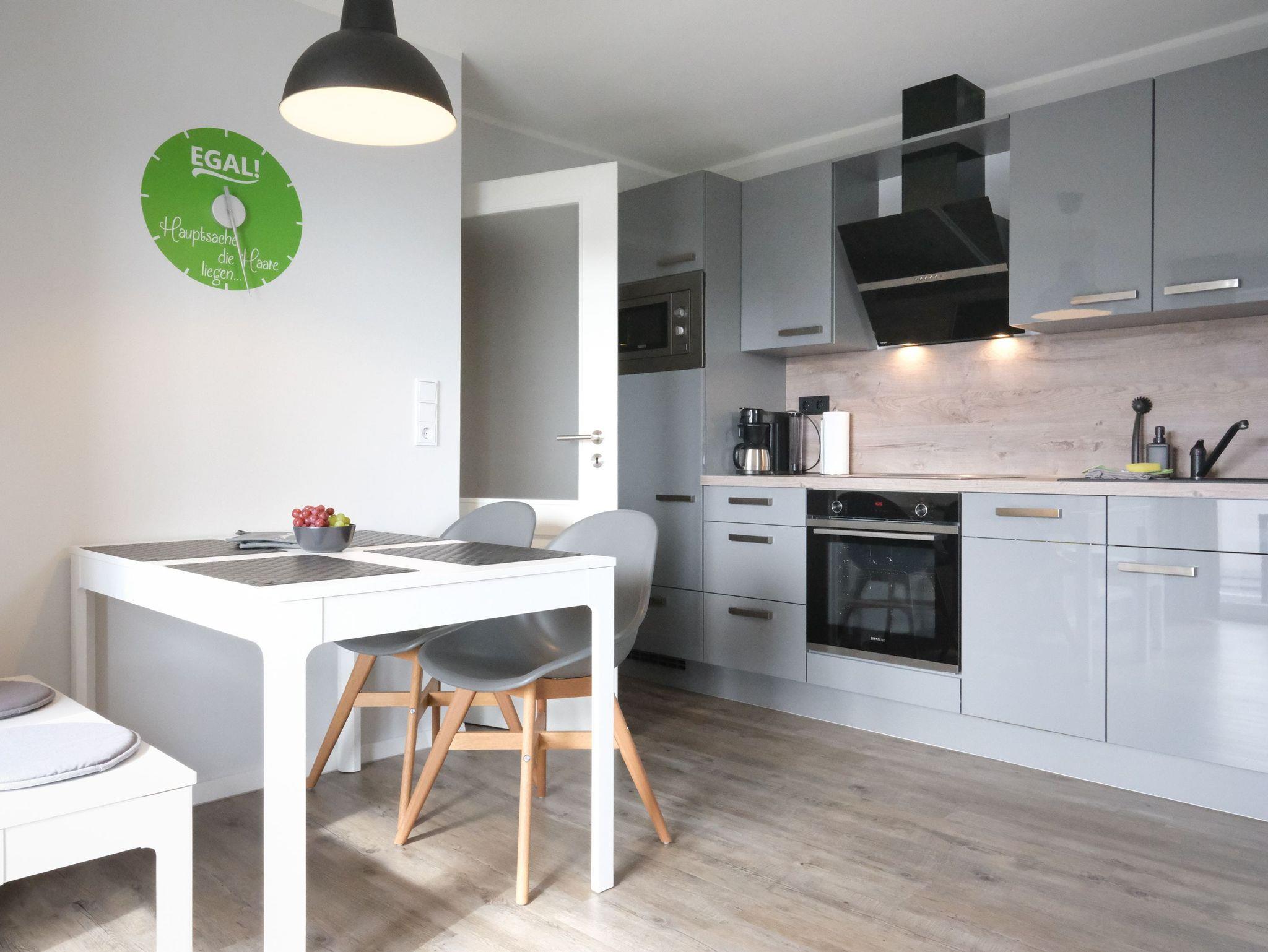 Das Herzstück der Wohnung bildet der helle und großzügige Wohn- und Essbereich mit insgesamt knapp 20m². Gemütliche Sessel und eine Couch laden zum Entspannen ein und gewähren einen unverbauten Blick auf die Deichlandschaft. Für die passende Unterhaltung sorgen Gesellschaftsspiele, ein Flachbild-TV mit Smart-TV, DVD-Player und Hi-Fi-System. Der Essbereich ist für 4 Personen ausgelegt und wird durch eine hochwertige Küchenzeile ergänzt. Die Küche ist voll ausgestattet und verfügt über eine Spülmaschine, einen Backofen mit Cerankochfeld, eine Mikrowelle, einen großen Kühlschrank mit separatem Gefrierfach, eine Kaffeemaschine (wahlweise Pad oder Filter), einen Wasserkocher, Toaster u.v.m.
