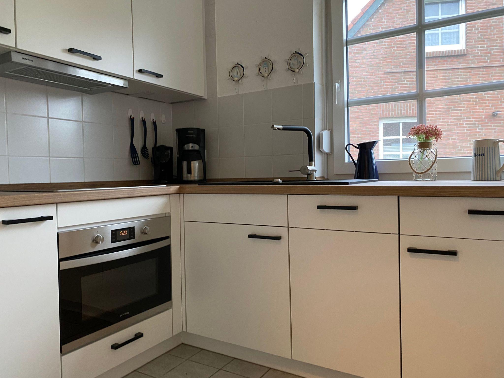 voll ausgestattete Küche mit Elektroherd, Backofen, Geschirrspüler, Mikrowelle, Kaffeemaschine (Filterkaffee), Wasserkocher, Kühlschrank mit Gefrierfach und ausreichend Geschirr, Besteck, Töpfen etc.